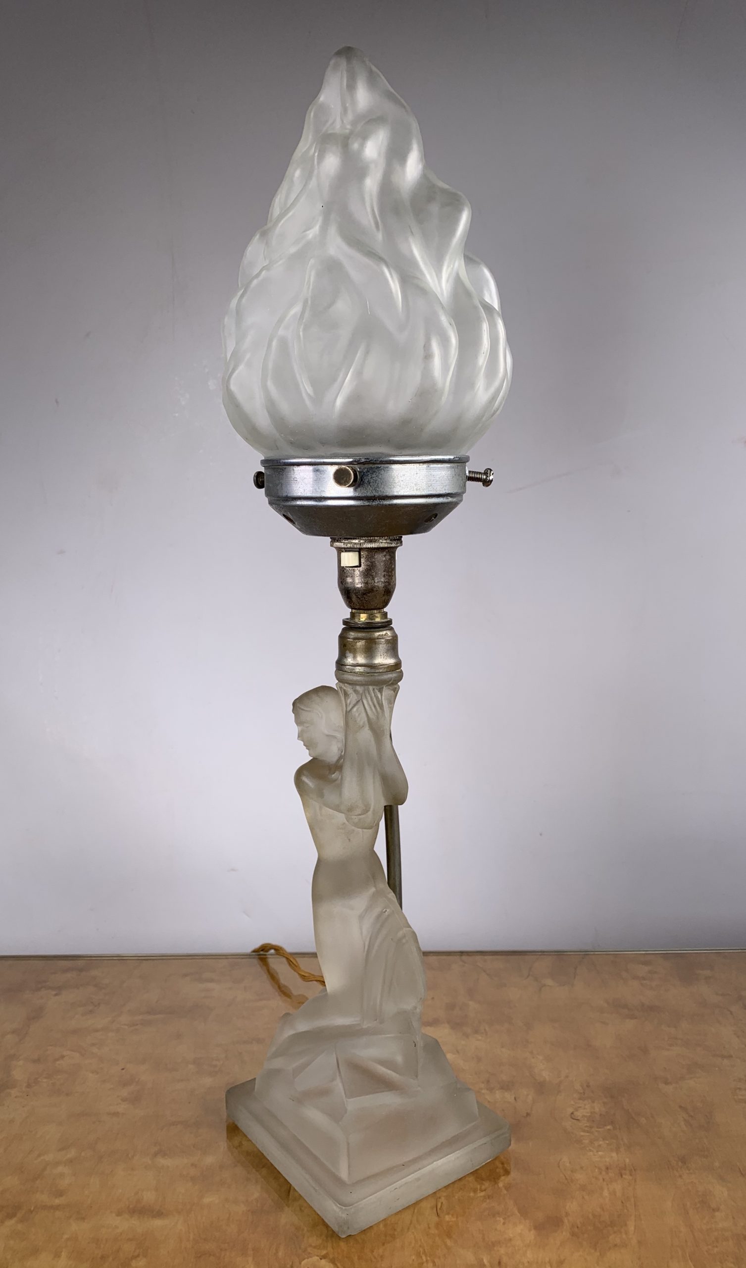 Here, an opaque glass flame shaped shade, is held aloft in the arms of an Art Deco lady, kneeling on a raised geometric base. The figure opaque glass with no chips or cracks.