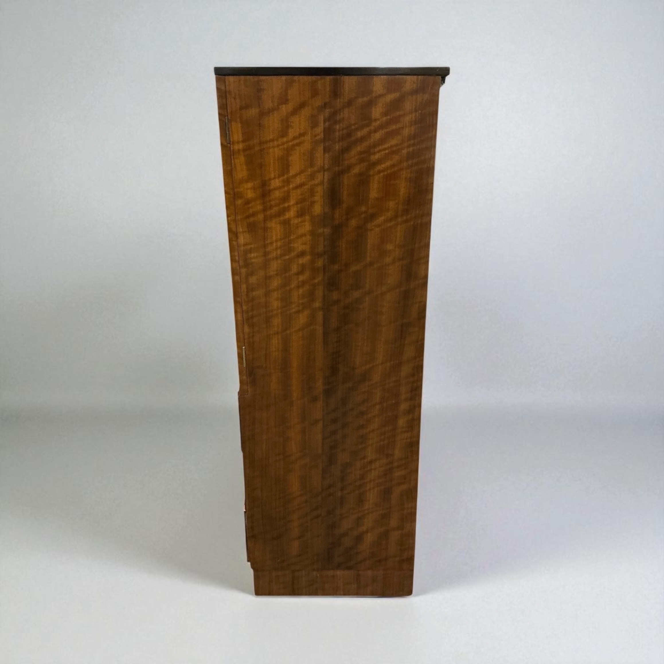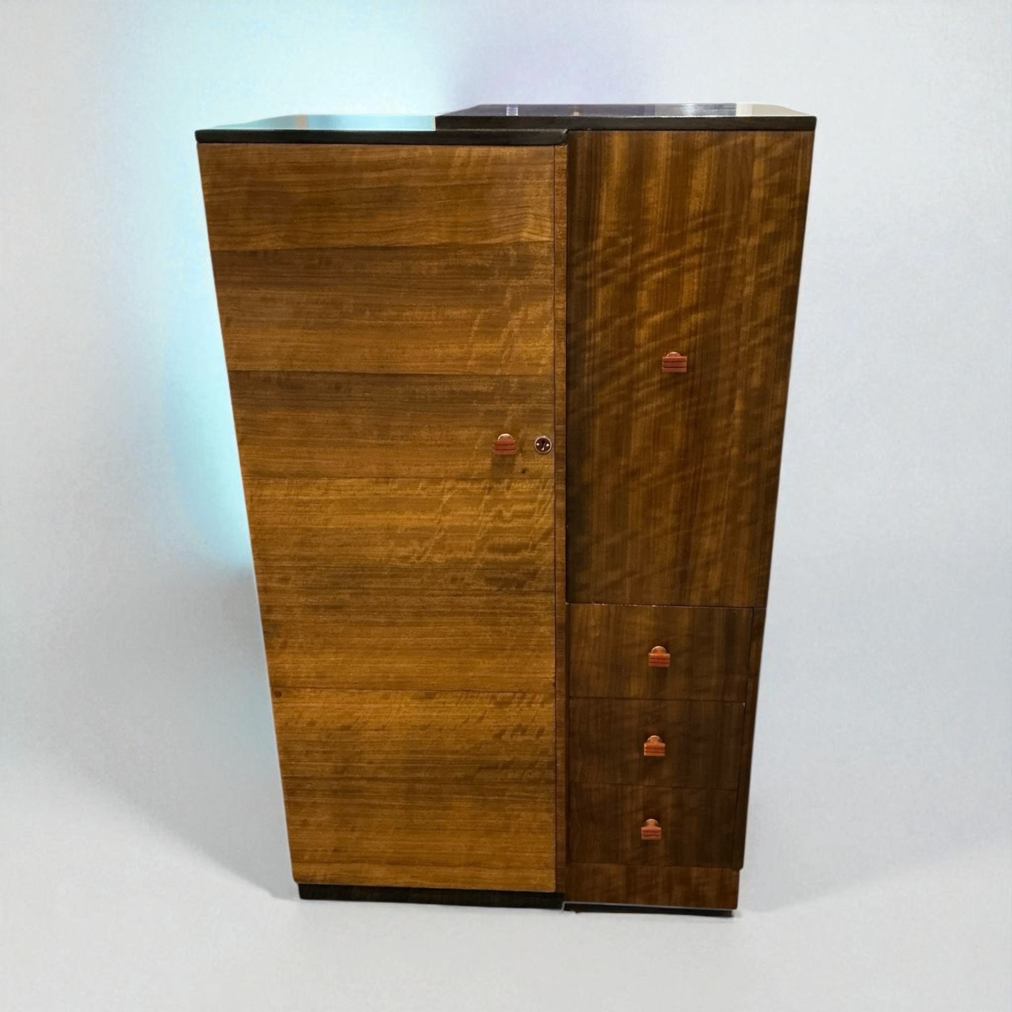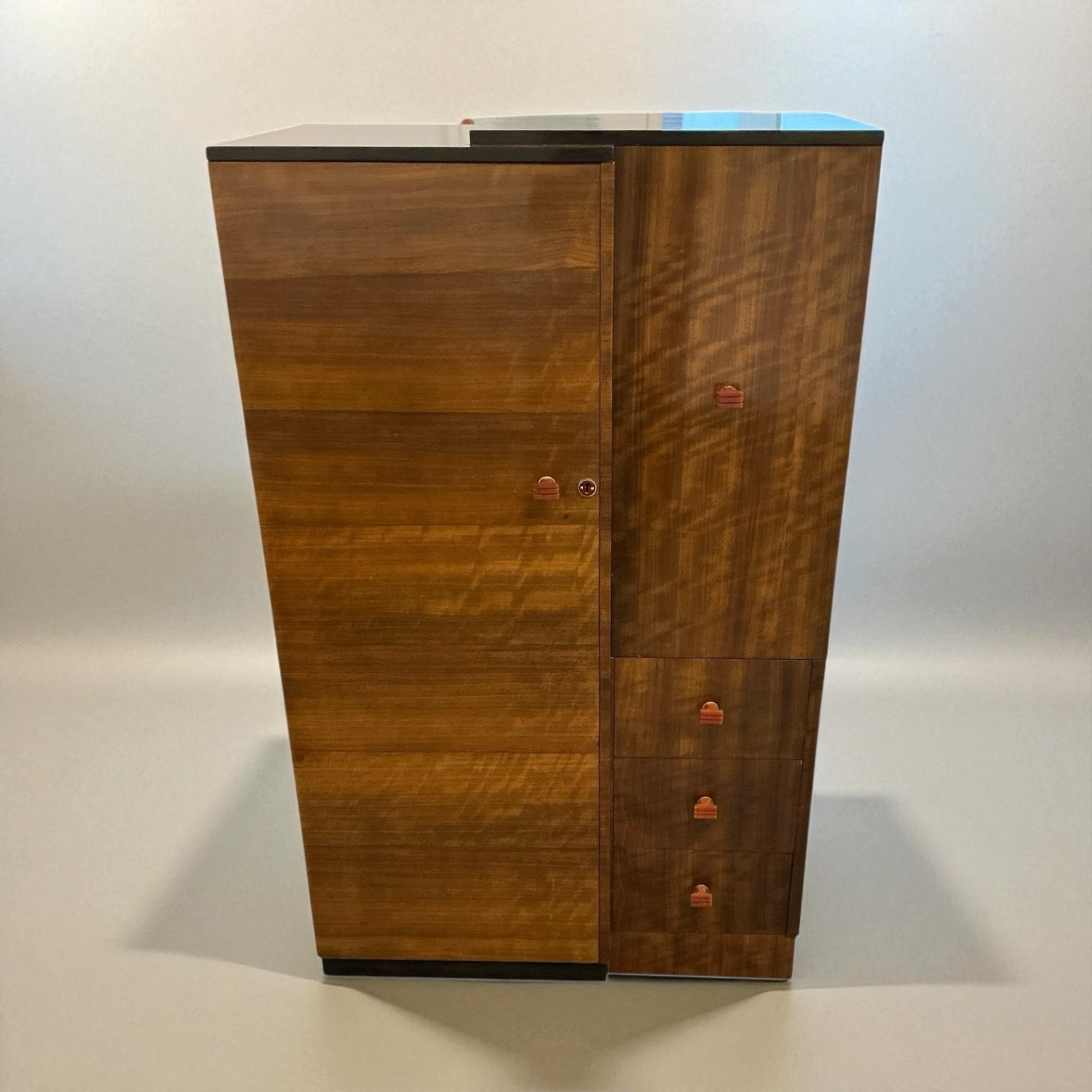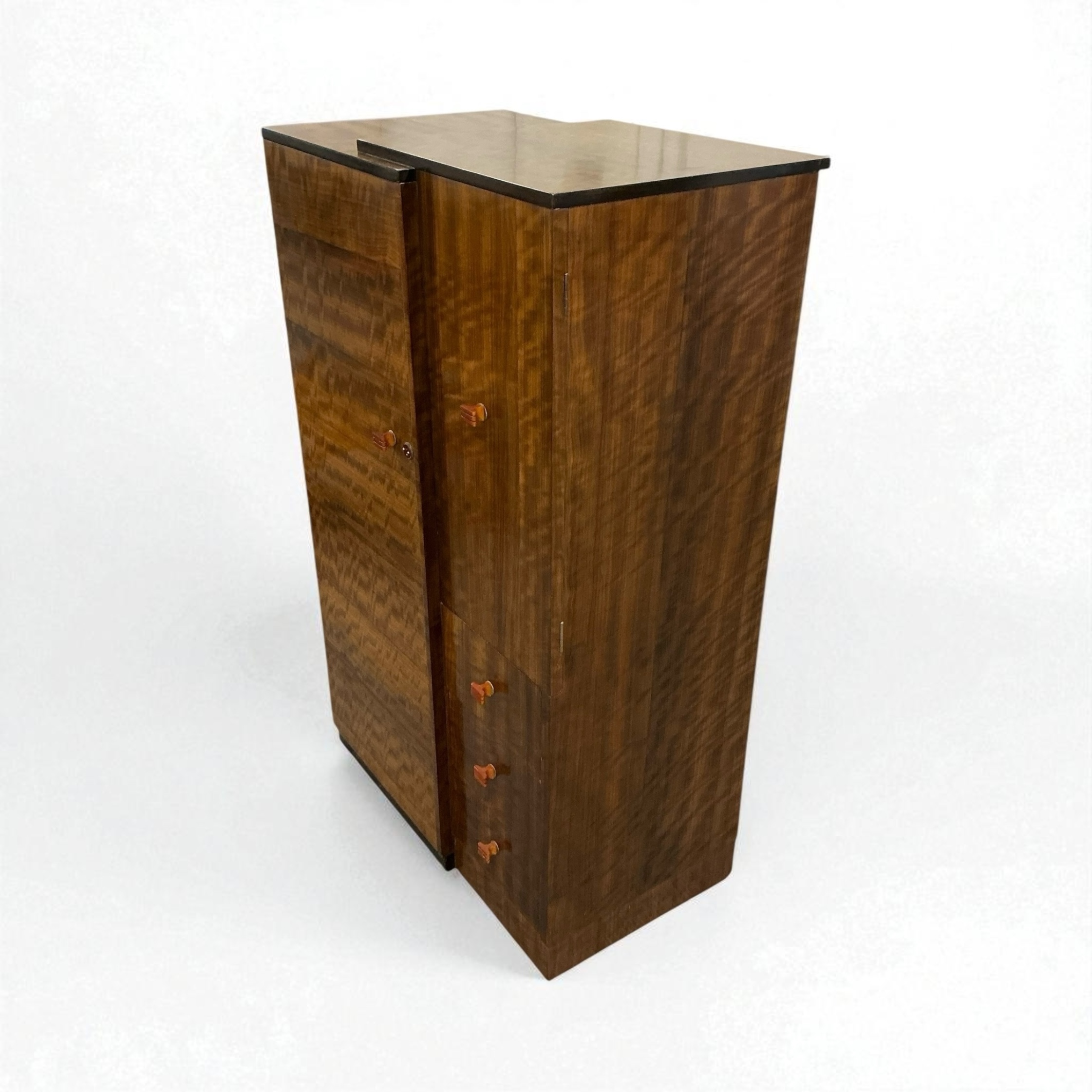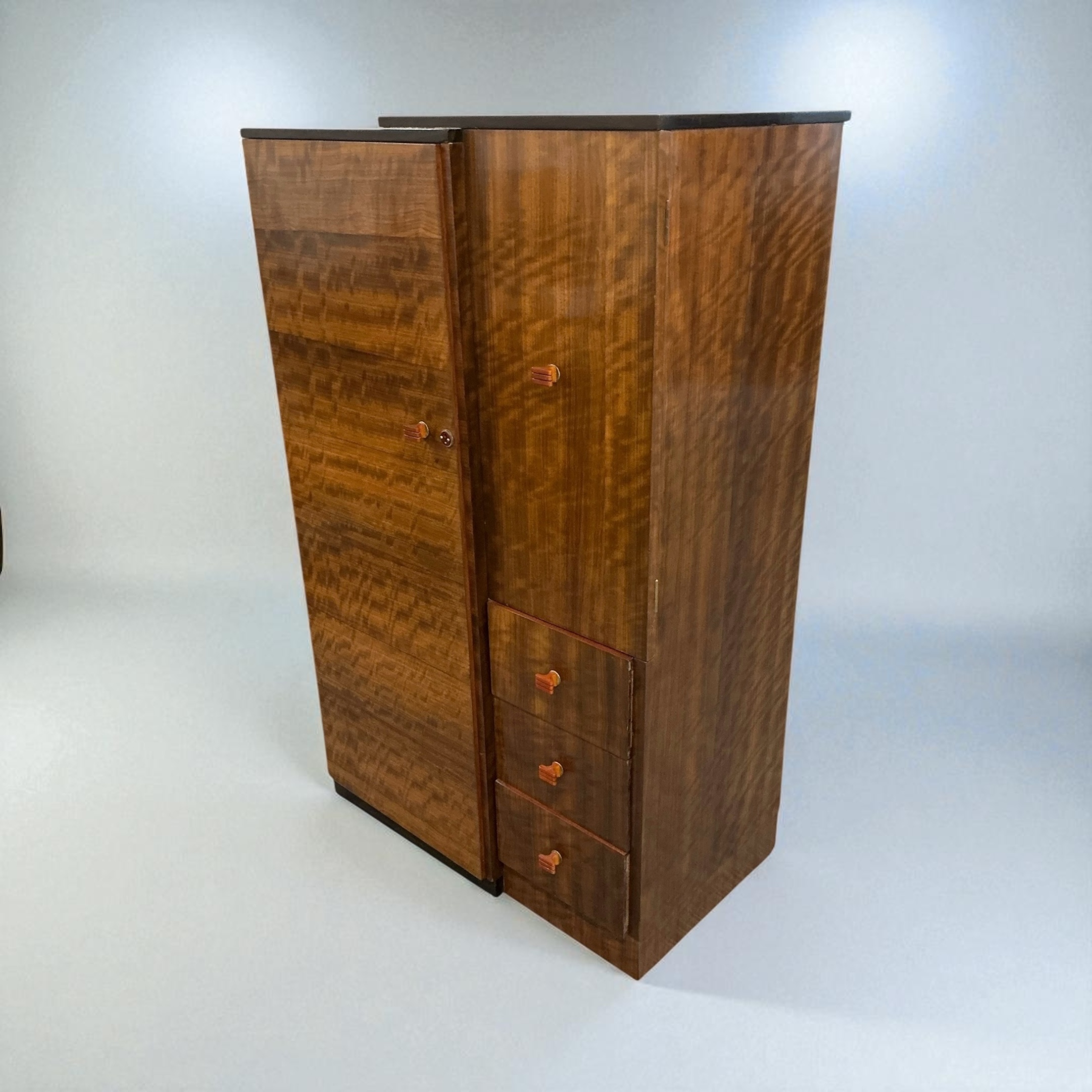 A quality Art Deco gentleman’s wardrobe in walnut, with attractive red phenolic handles. The left hand side with a pull out chrome hanging rail and a shoe rail to the base. To the right hand side a cupboard with two shelves and below three drawers. Label to back, marked “Pratts of Bedford’.