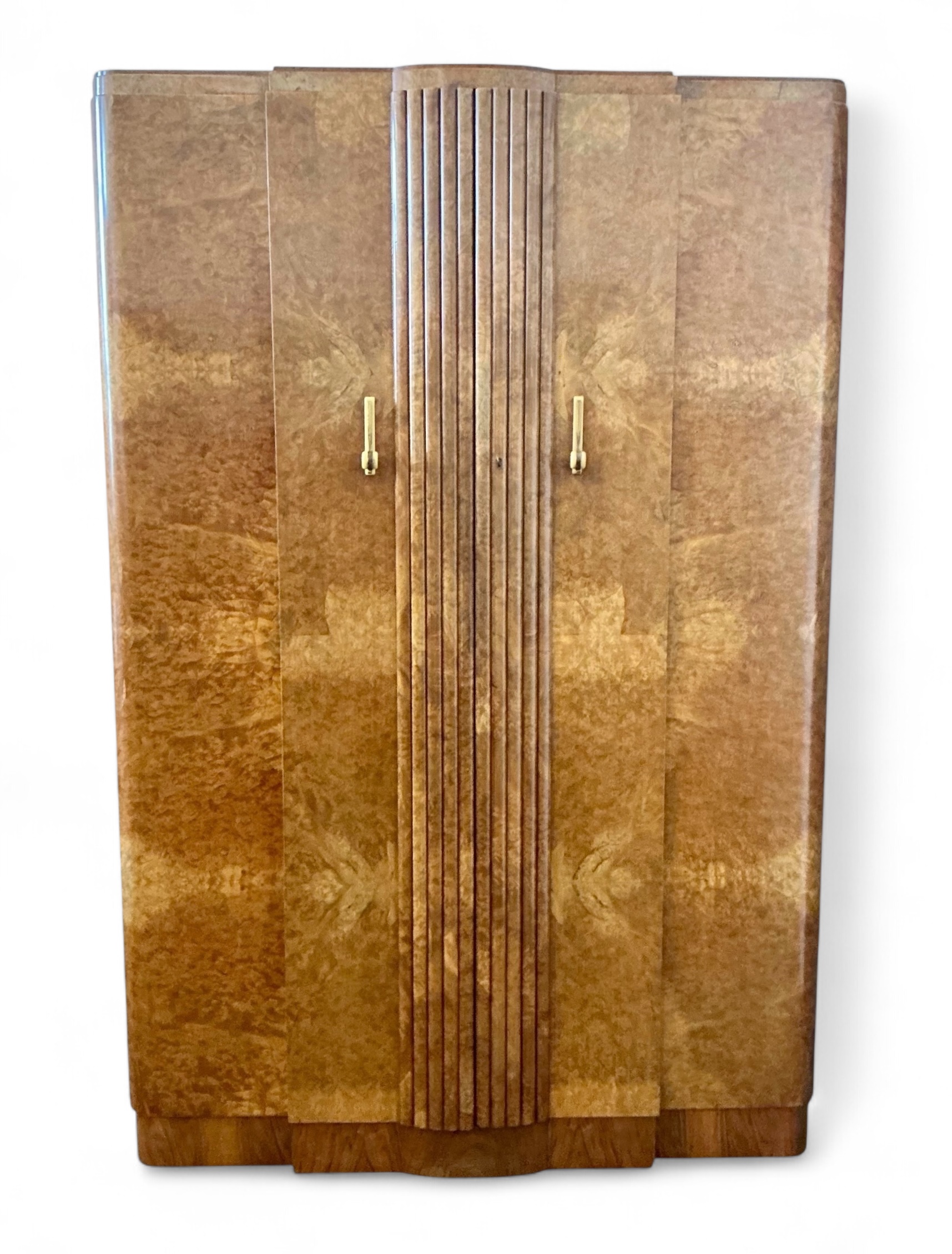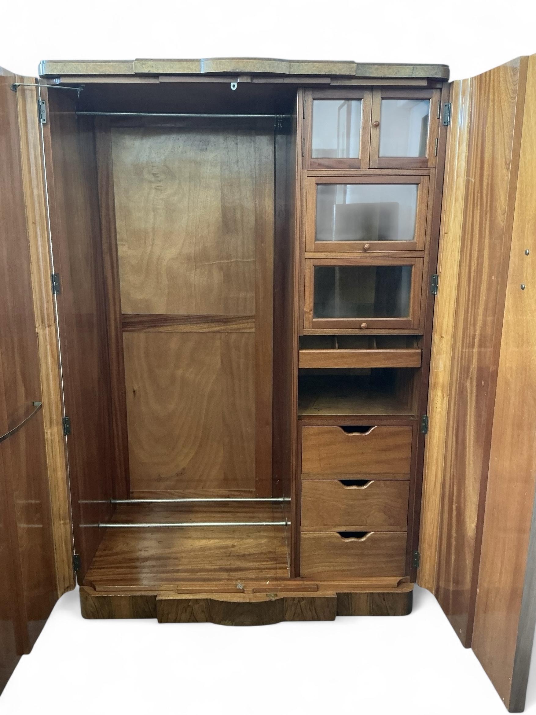 Fine Art Deco wardrobe by Harry and Lou Epstein. In walnut with ribbed detailing to both doors and attractive cream bakelite handles. A hanging rail to the left, with a shoe rail below and a rail for belts and ties to the door.                                                                                                                               To the right, a two door glazed compartment to the top, and beneath a further two glazed door compartments, with up and over doors. All with butterscotch bakelite handles.                                                                                     A pullout drawer, with separate compartments an open shelf and three deep drawers to the bottom.