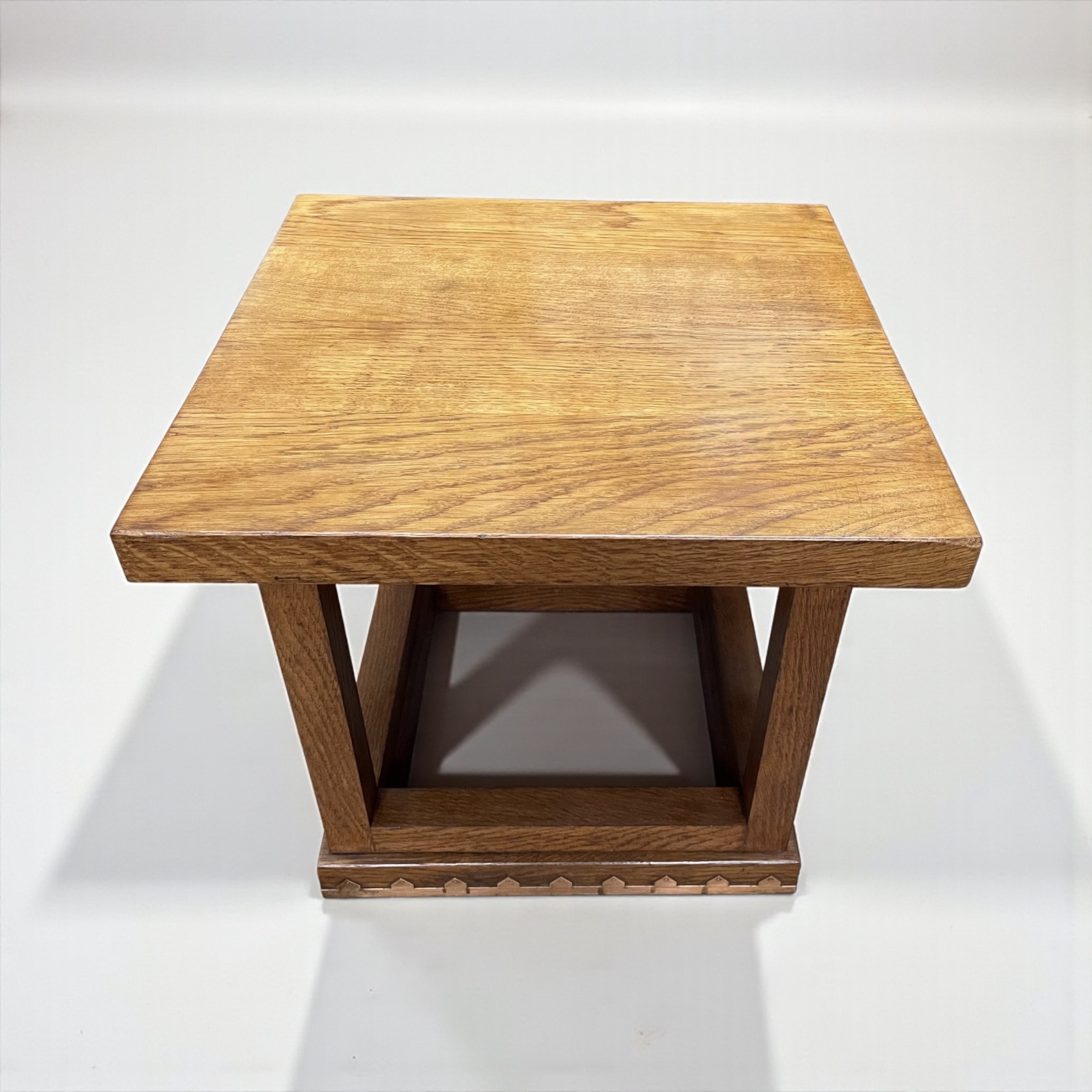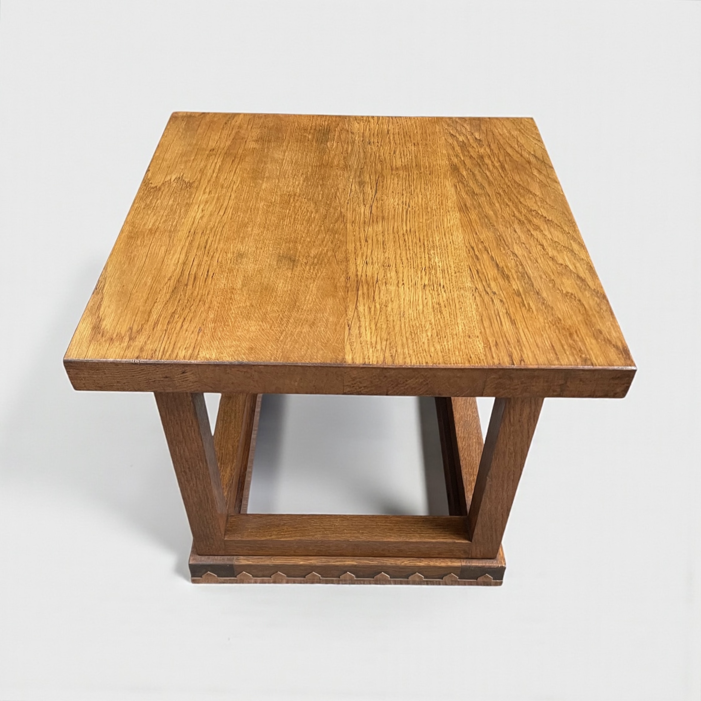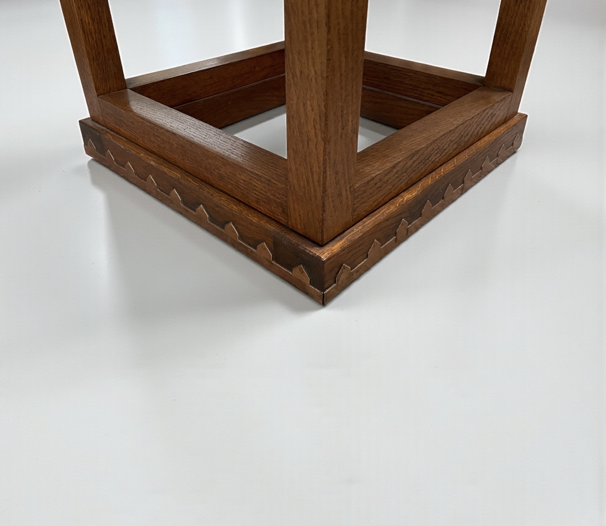 Arts and Crafts solid sawn oak side table. Of square form, with the box stretcher decorated with applied copper banding.