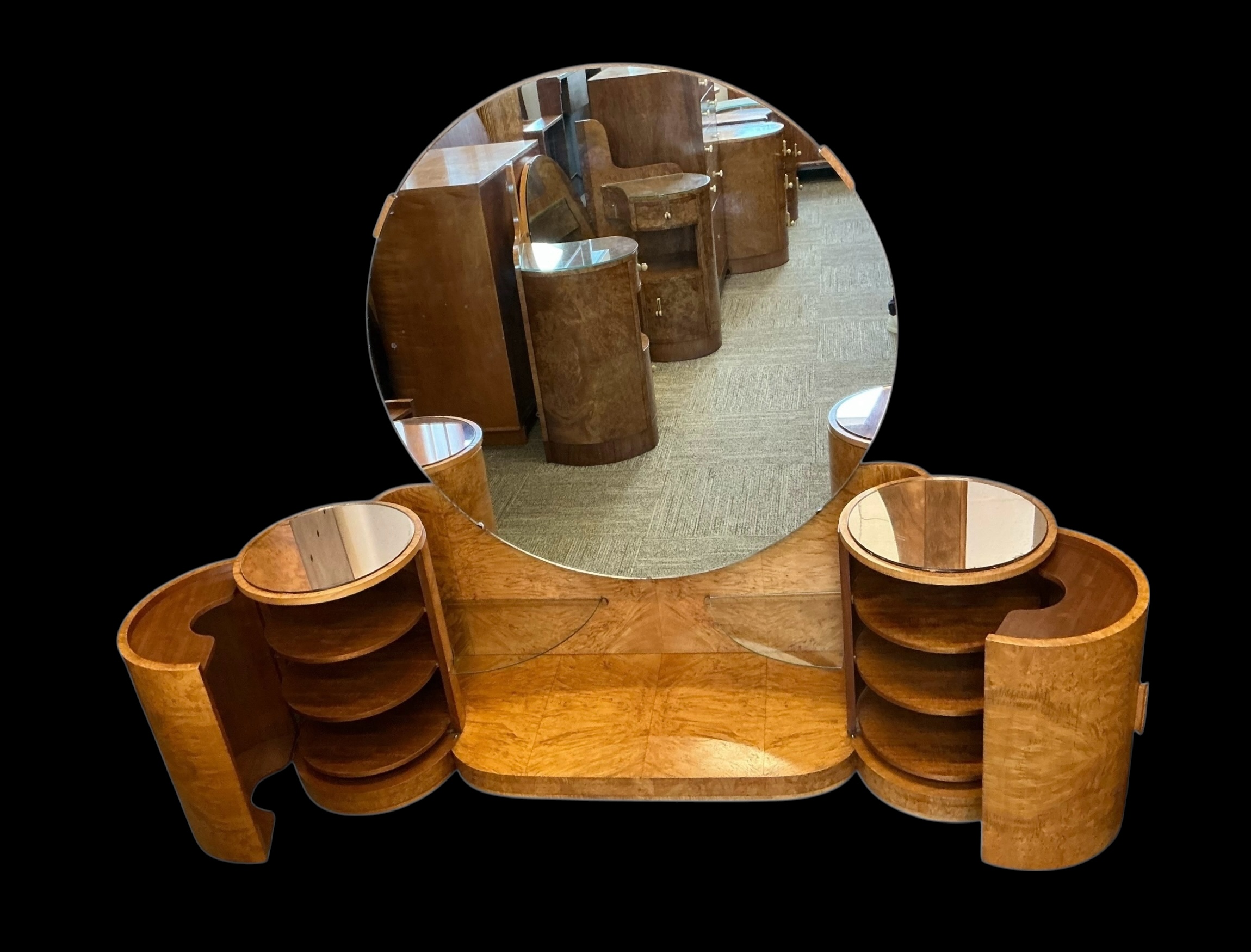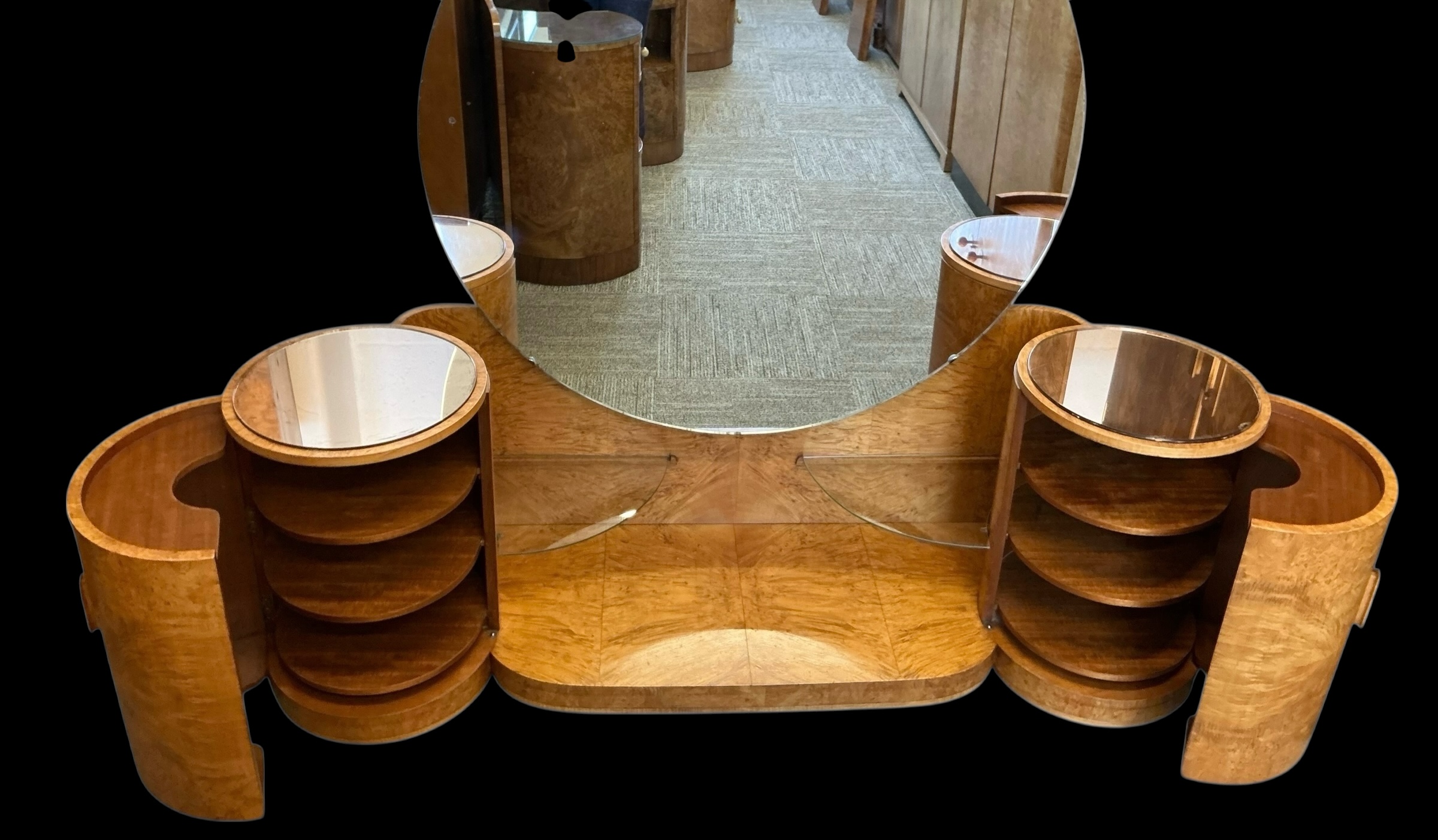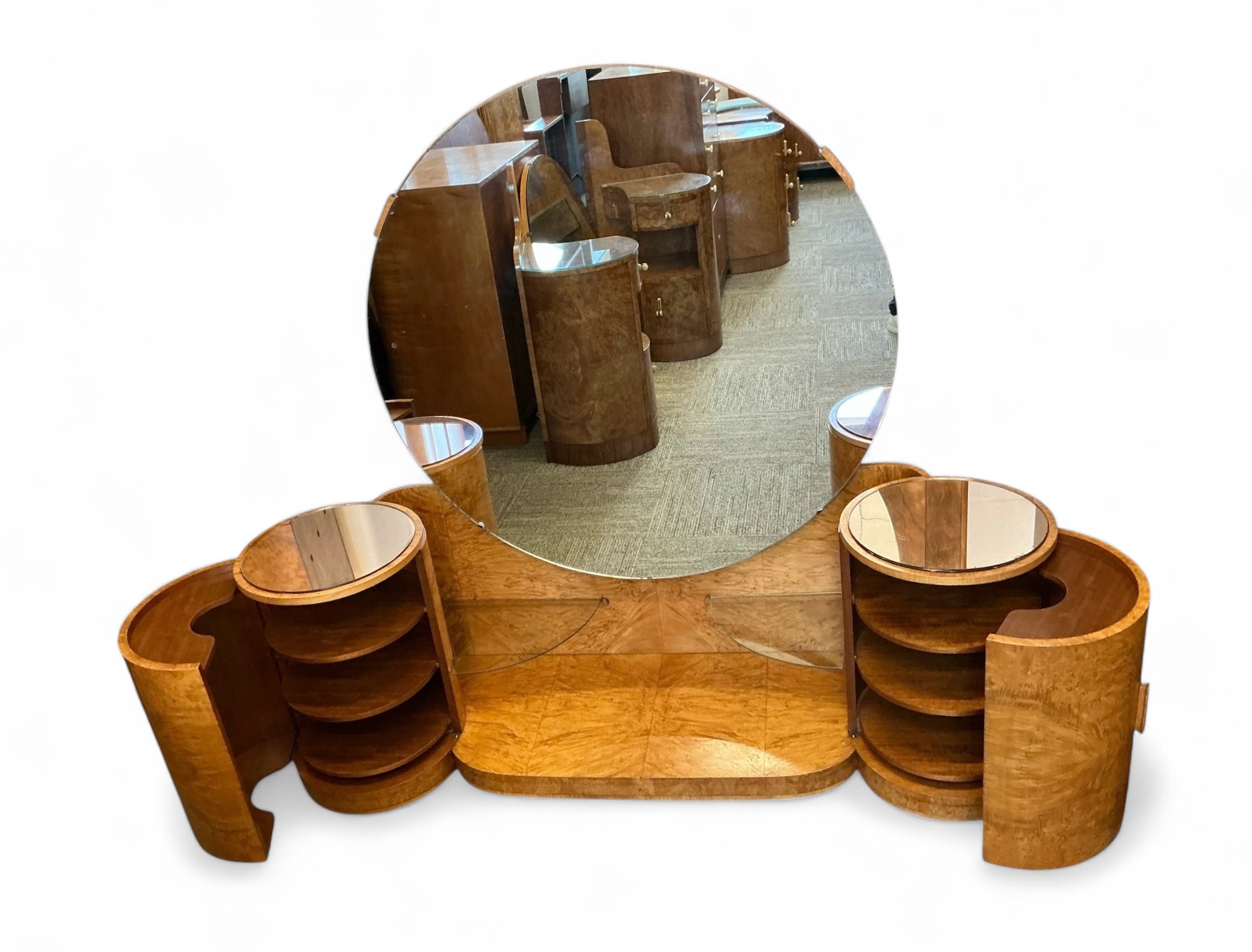 Fine Art Deco Dressing Table in blonde maple. A circular cupboard to each side with their original bronze inset glass tops and three internal shelves. Two curved glass shelves below the large circular adjustable mirror.