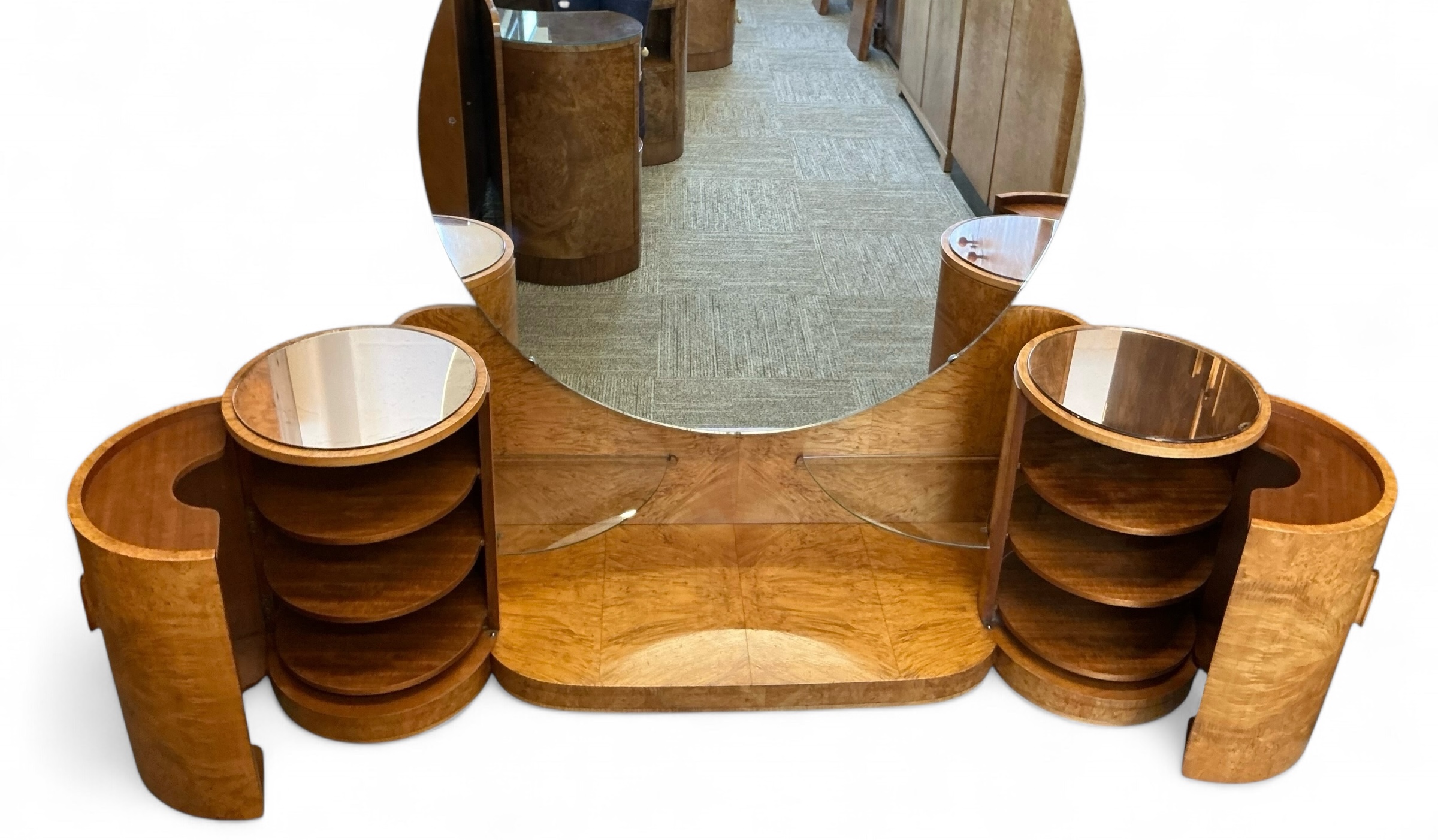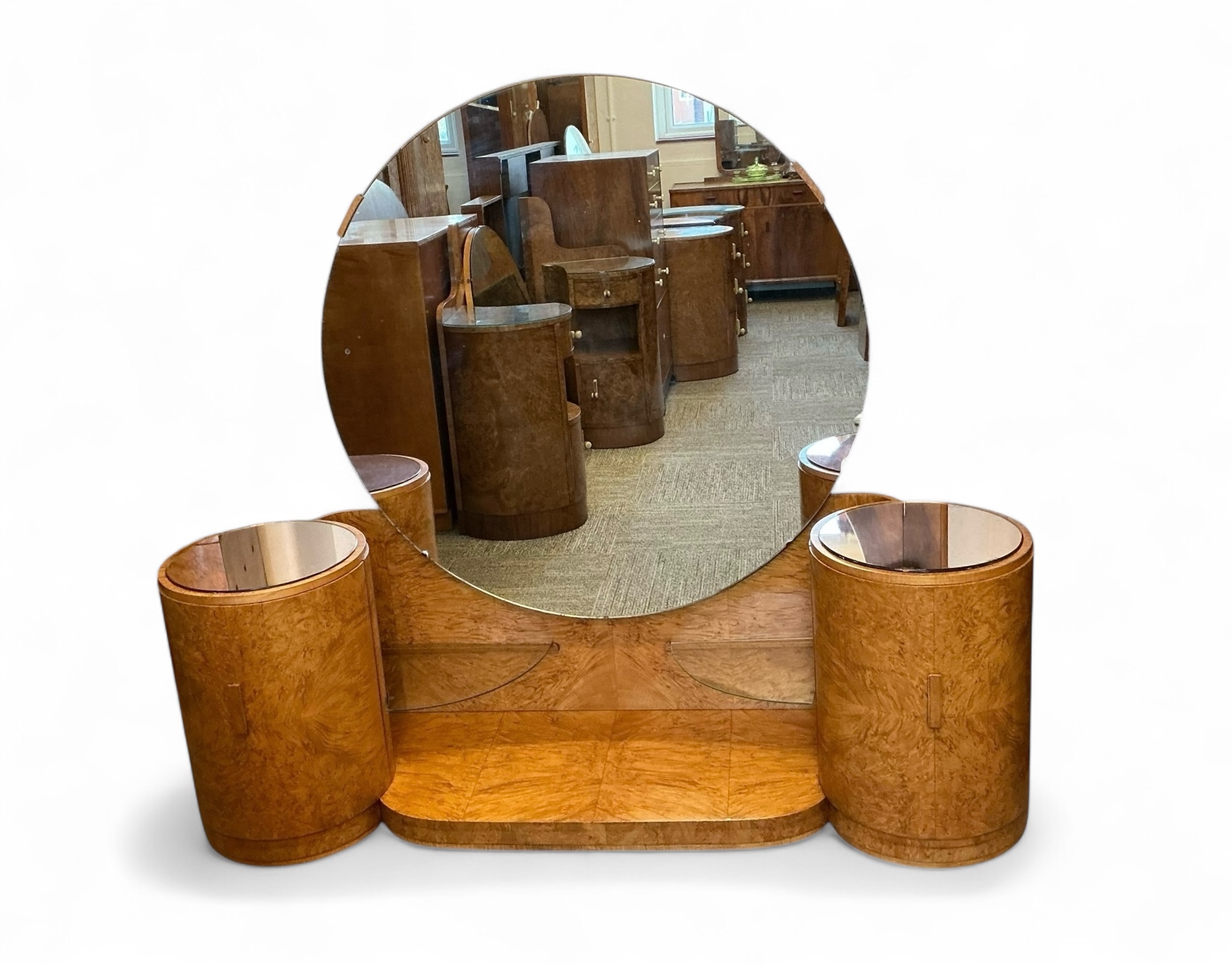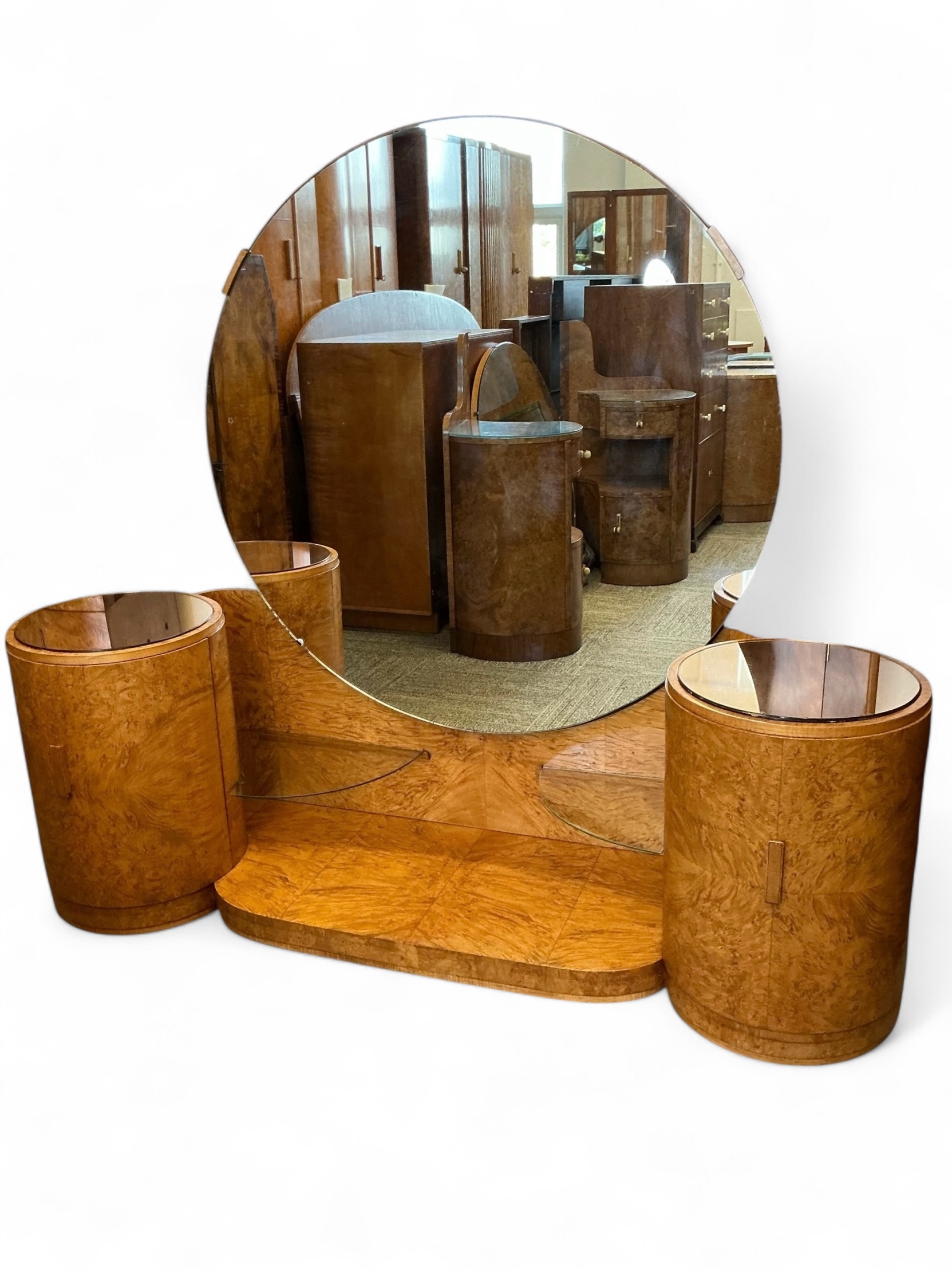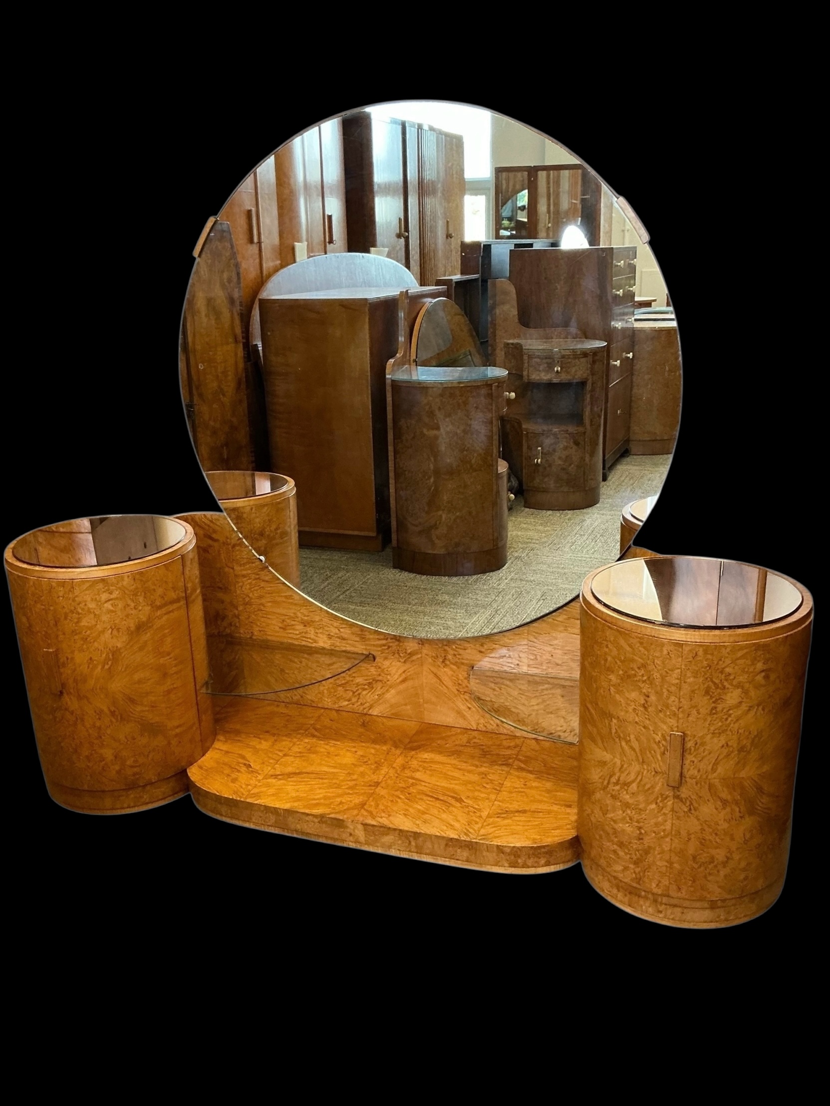 Fine Art Deco Dressing Table in blonde maple. A circular cupboard to each side with their original bronze inset glass tops and three internal shelves. Two curved glass shelves below the large circular adjustable mirror.