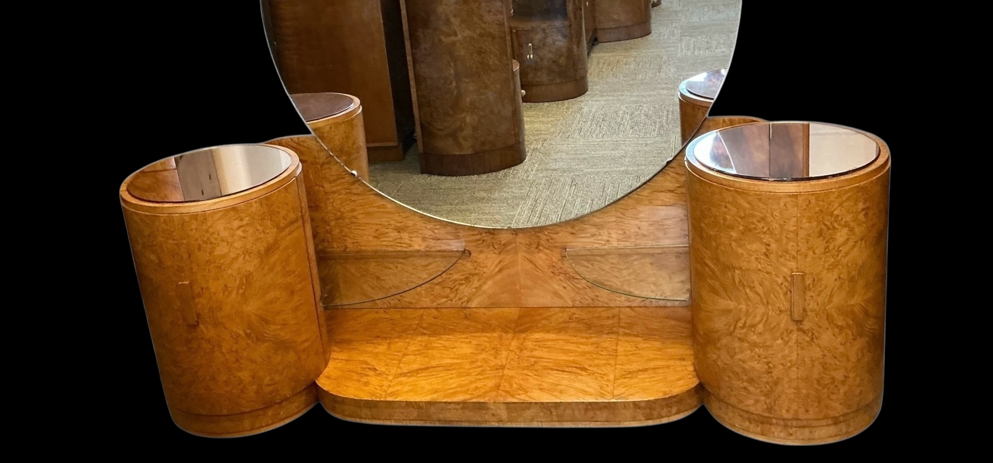 This dressing table has been professionally wax and polished. Some wear to just the original circular bronze glass cupboard tops.