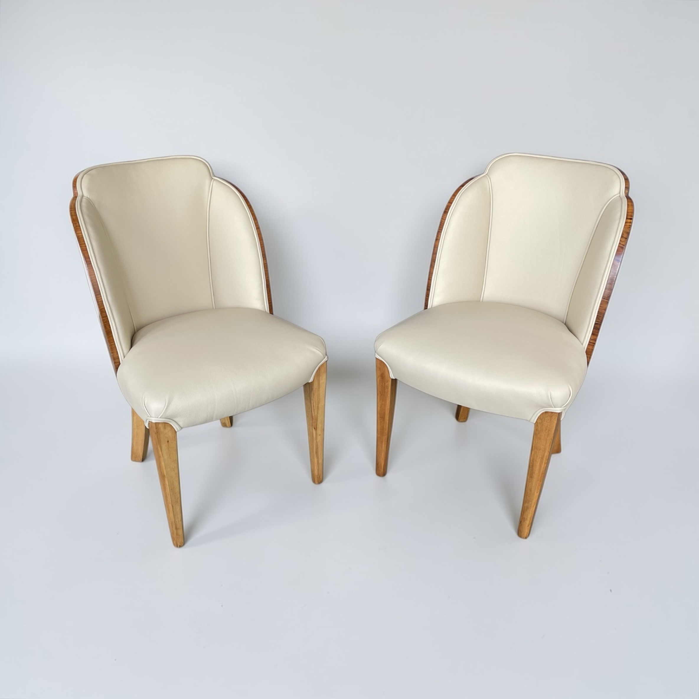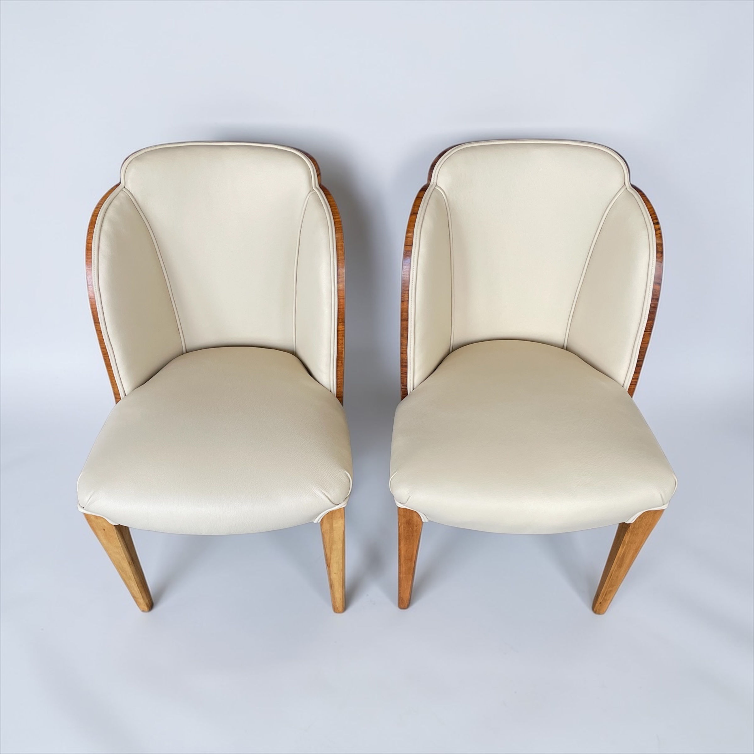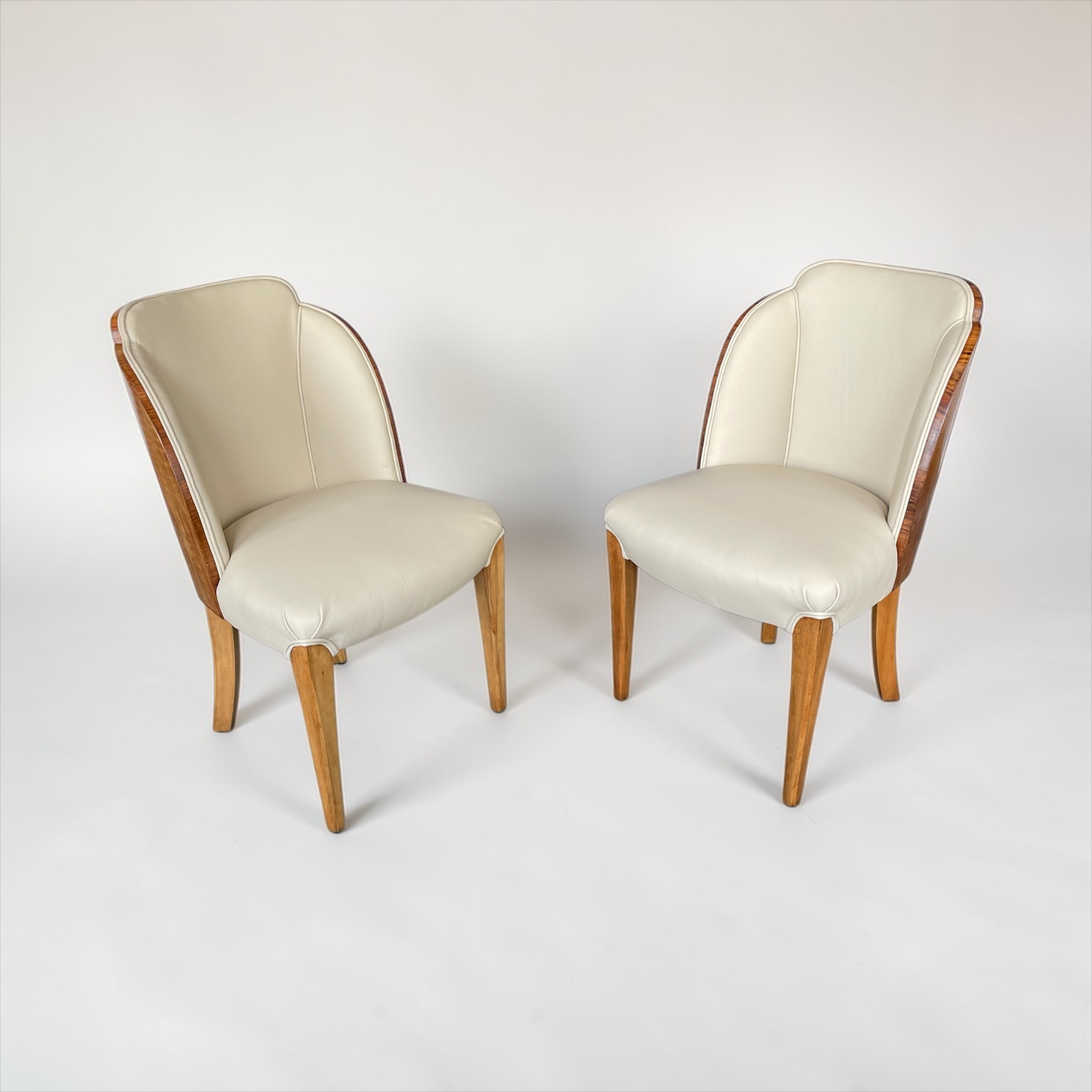 A fine pair of side chairs by Harry and Lou Epstein, walnut backed and just reupholstered in soft cream leather.
