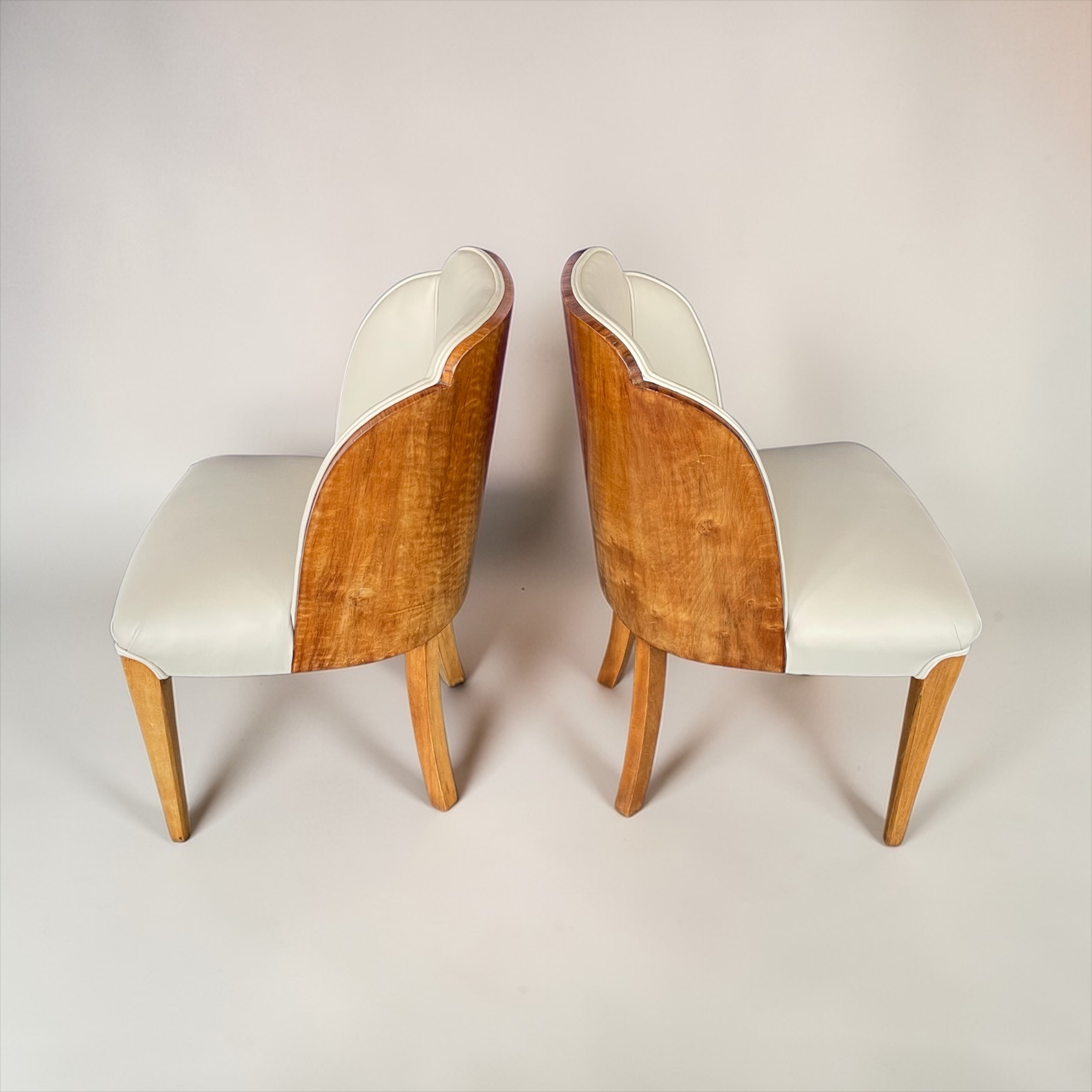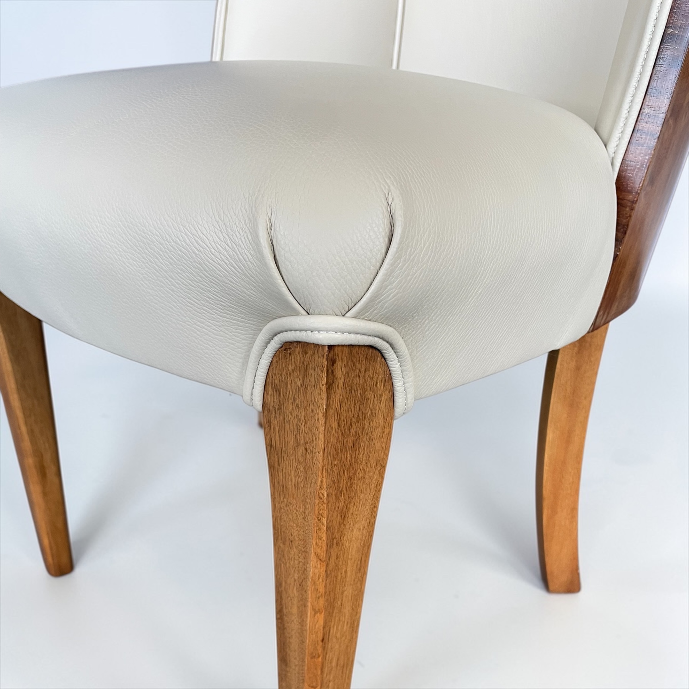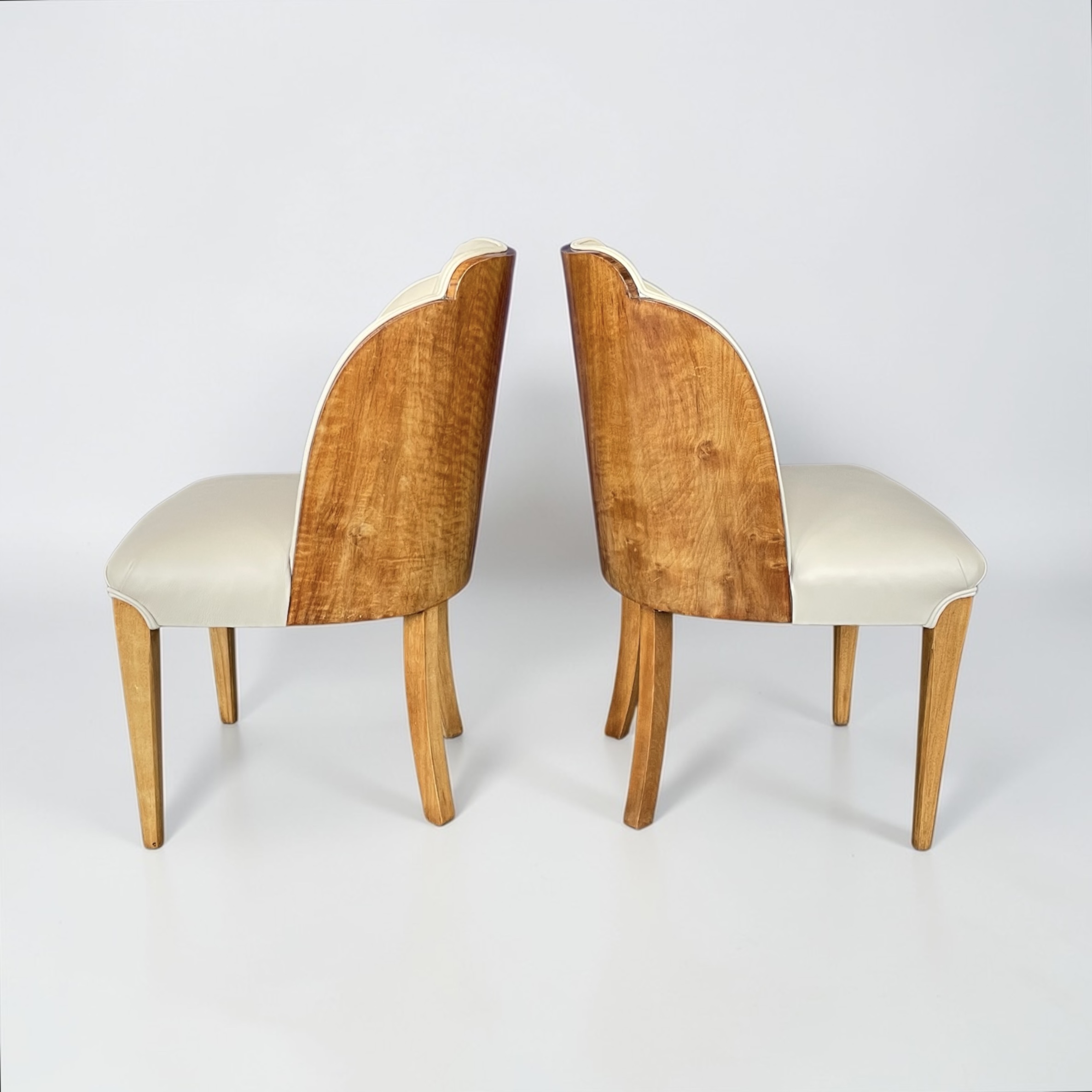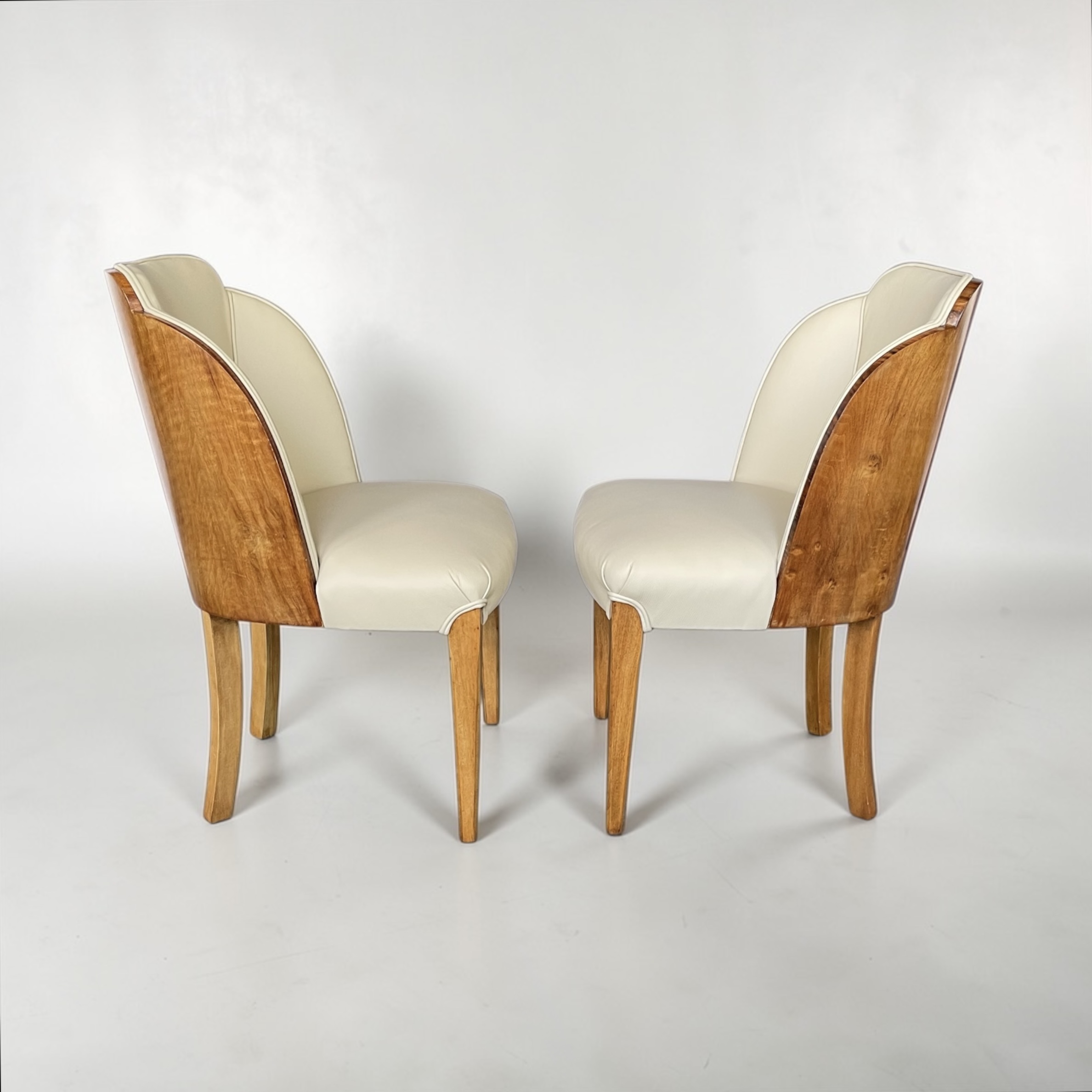 A fine pair of side chairs by Harry and Lou Epstein, walnut backed and just reupholstered in soft cream leather.
