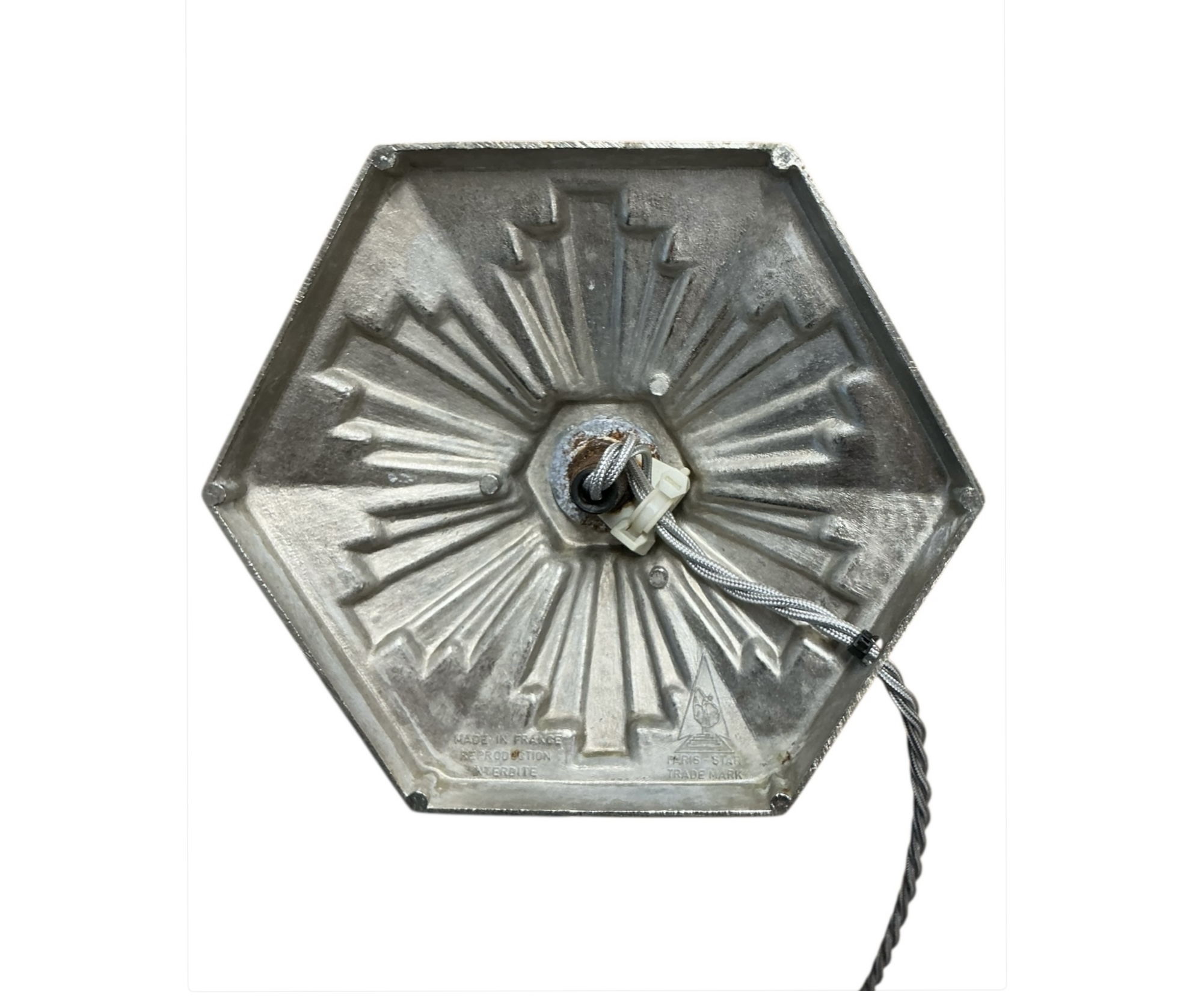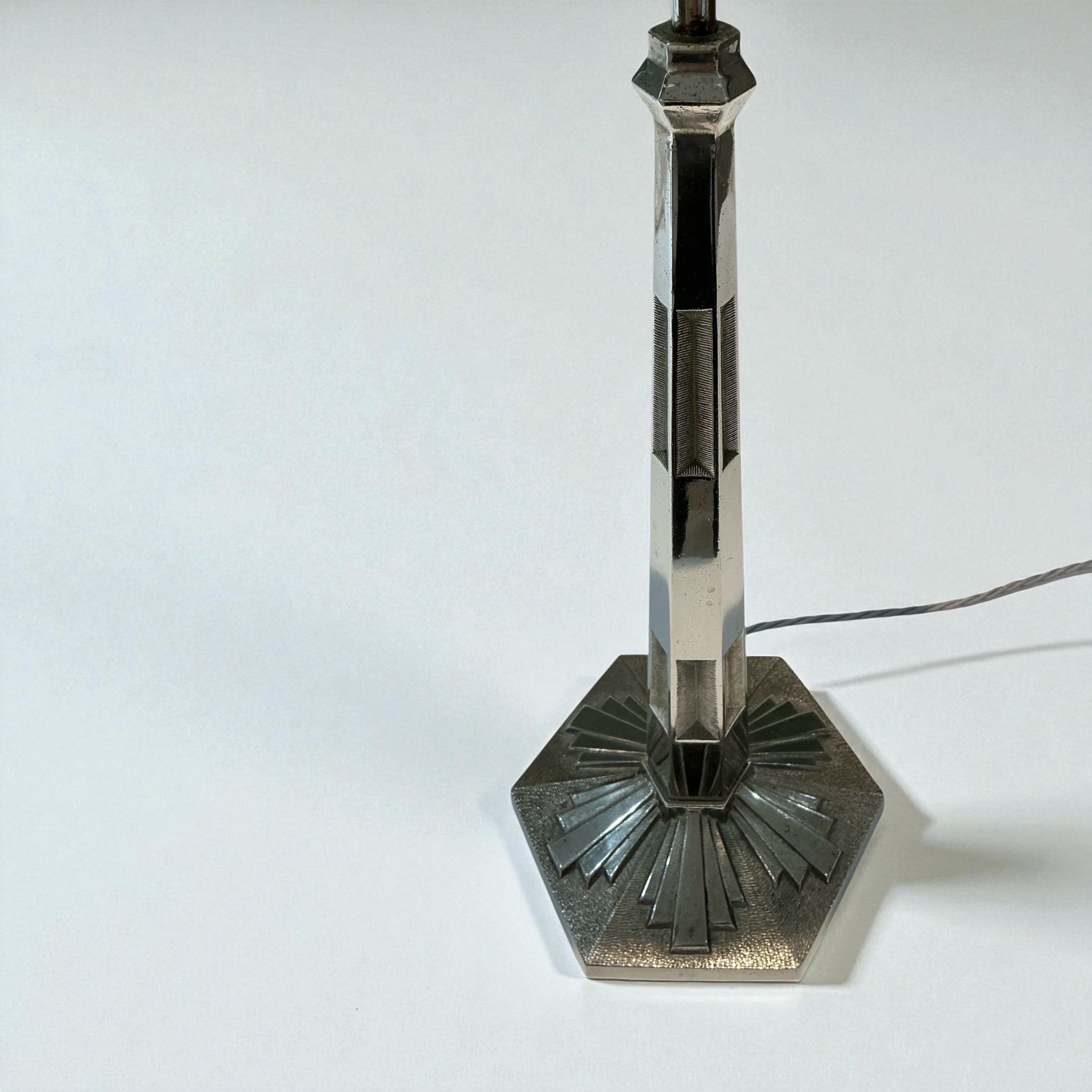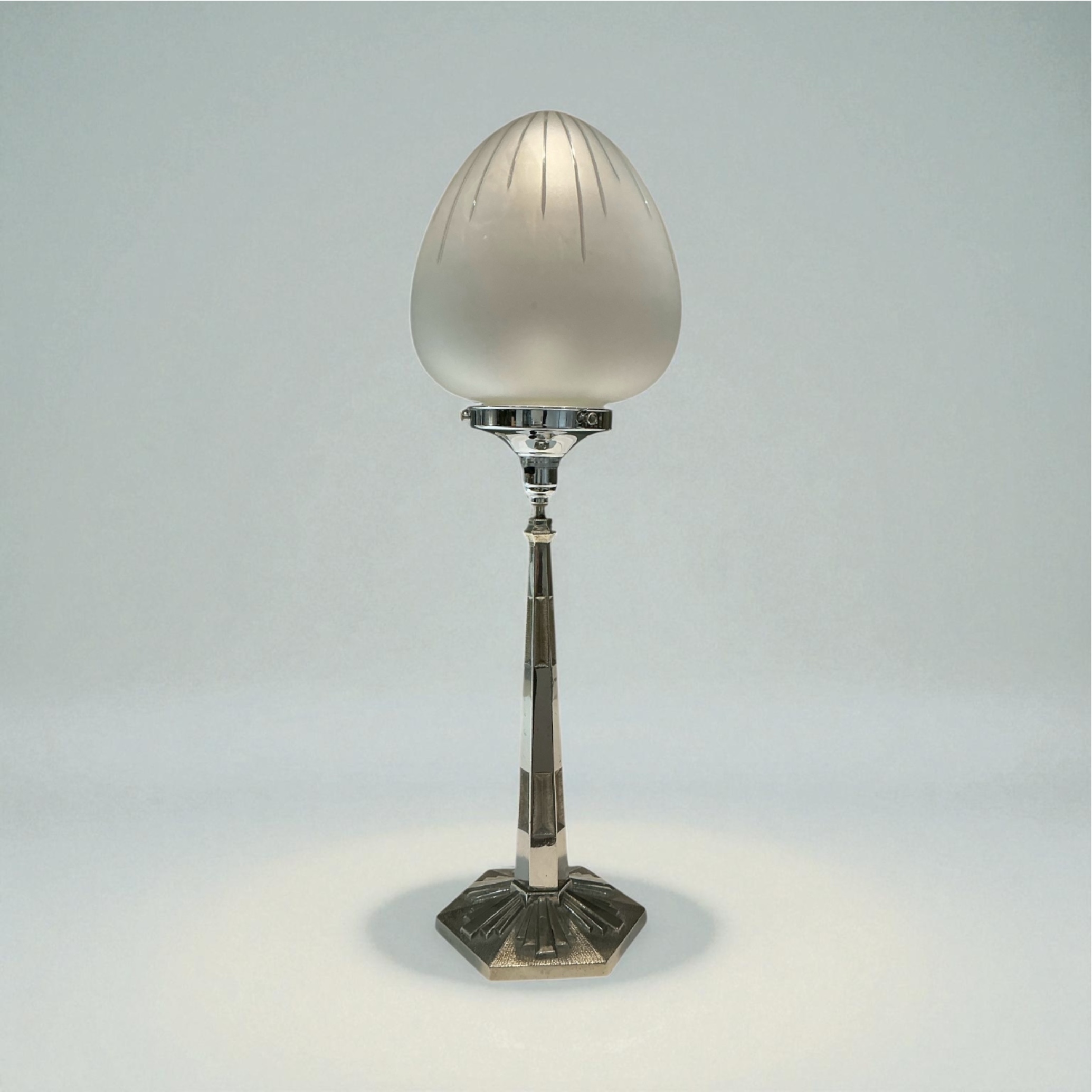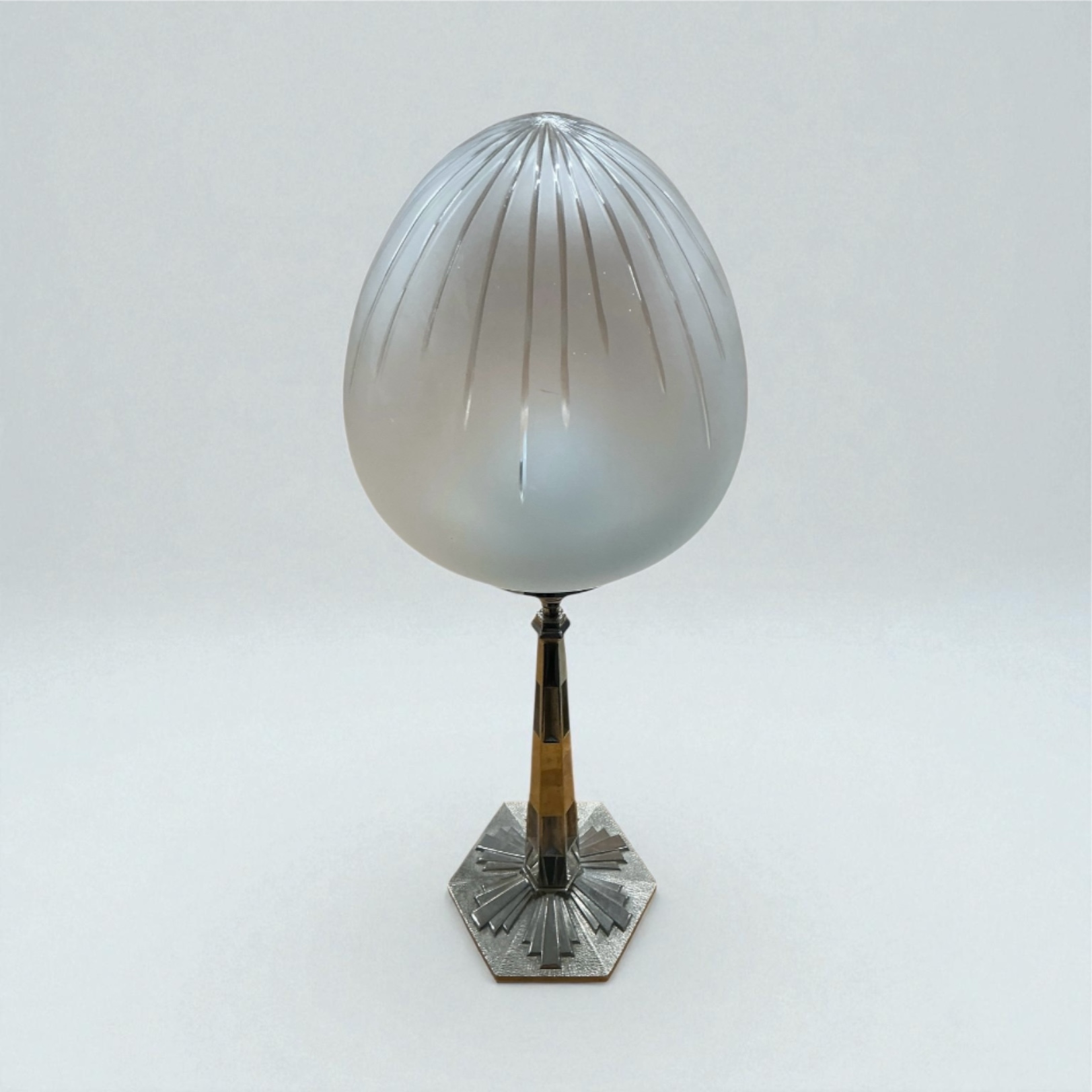A French Art Deco table lamp, with a hexagonal base incorporating a raised fan shape design. A tapered column , with rectangular inverted detailing, supporting a glass opaque ovoid shape shade, with etched detailing. The underside of the base marked with the Paris Star trademark and ‘Made in France Reproduction Interdite’ (forbidden).