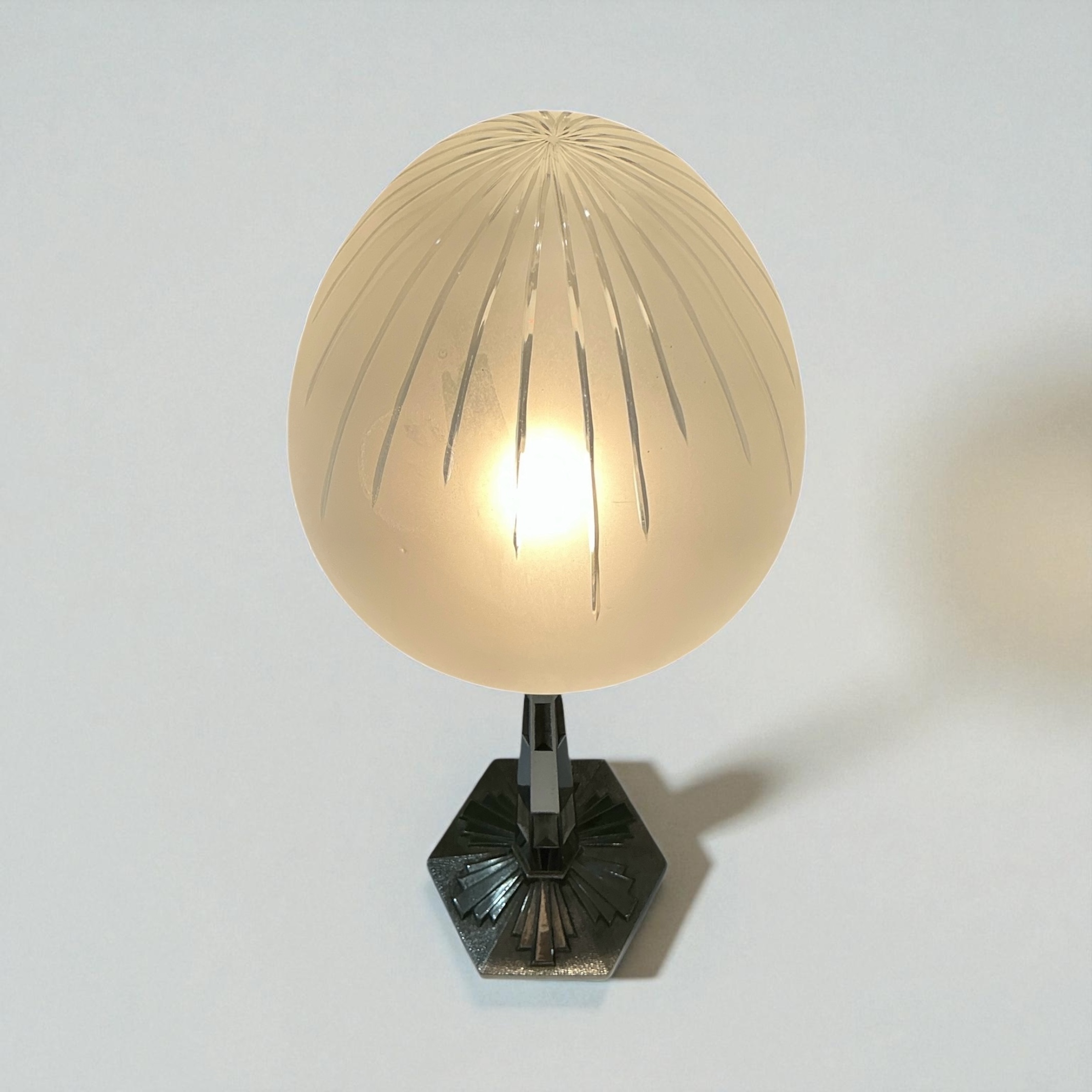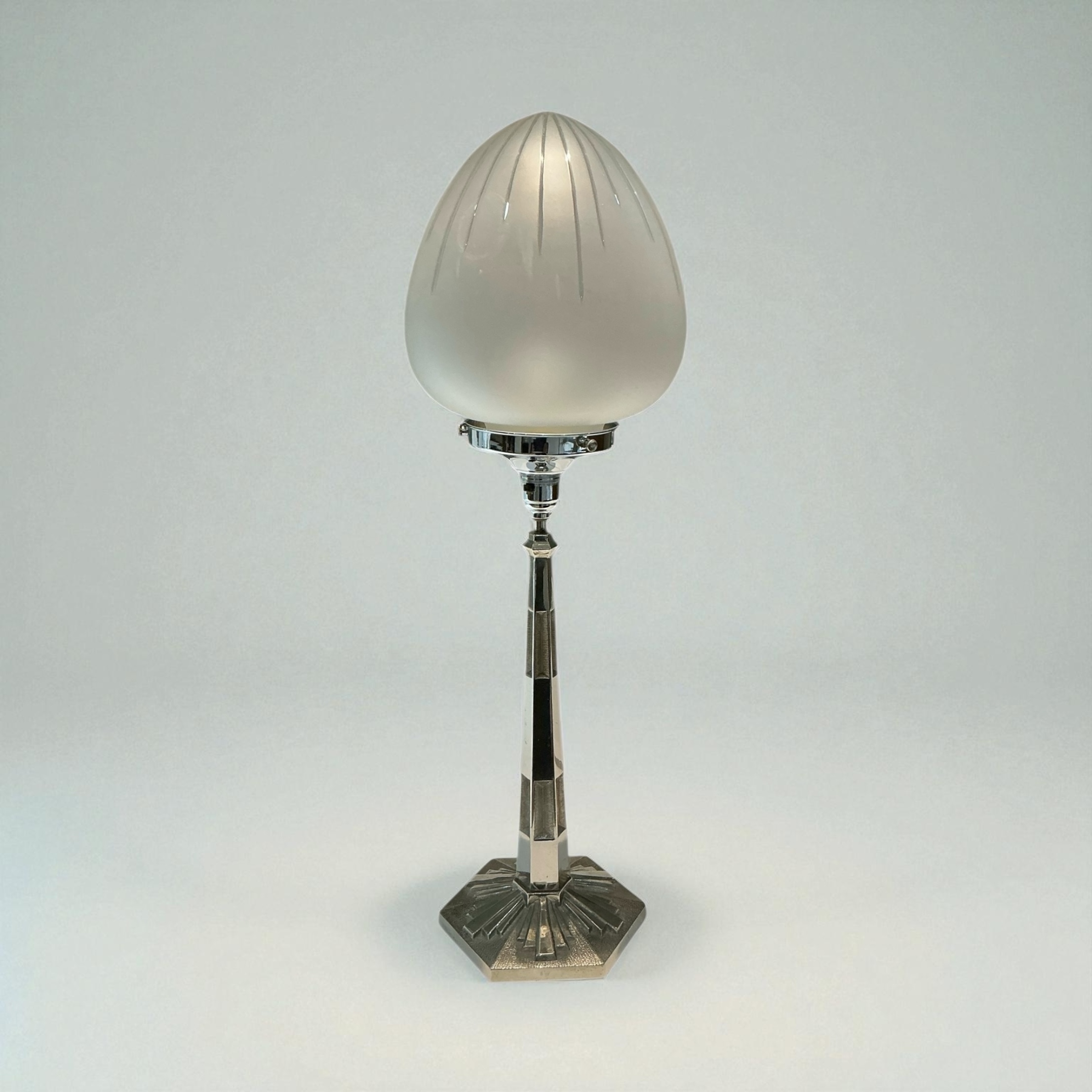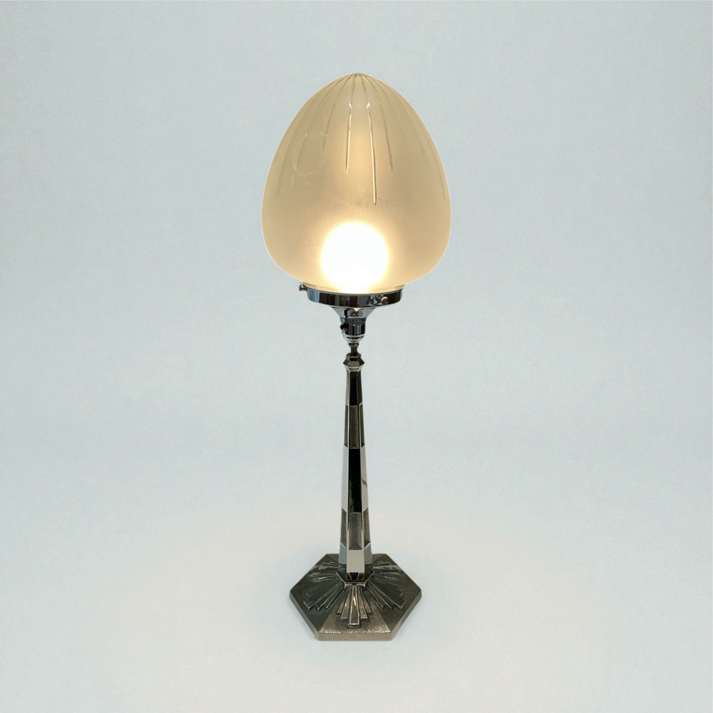 A French Art Deco table lamp, with a hexagonal base incorporating a raised fan shape design. A tapered column , with rectangular inverted detailing, supporting a glass opaque ovoid shape shade, with etched detailing. The underside of the base marked with the Paris Star trademark and ‘Made in France Reproduction Interdite’ (forbidden).