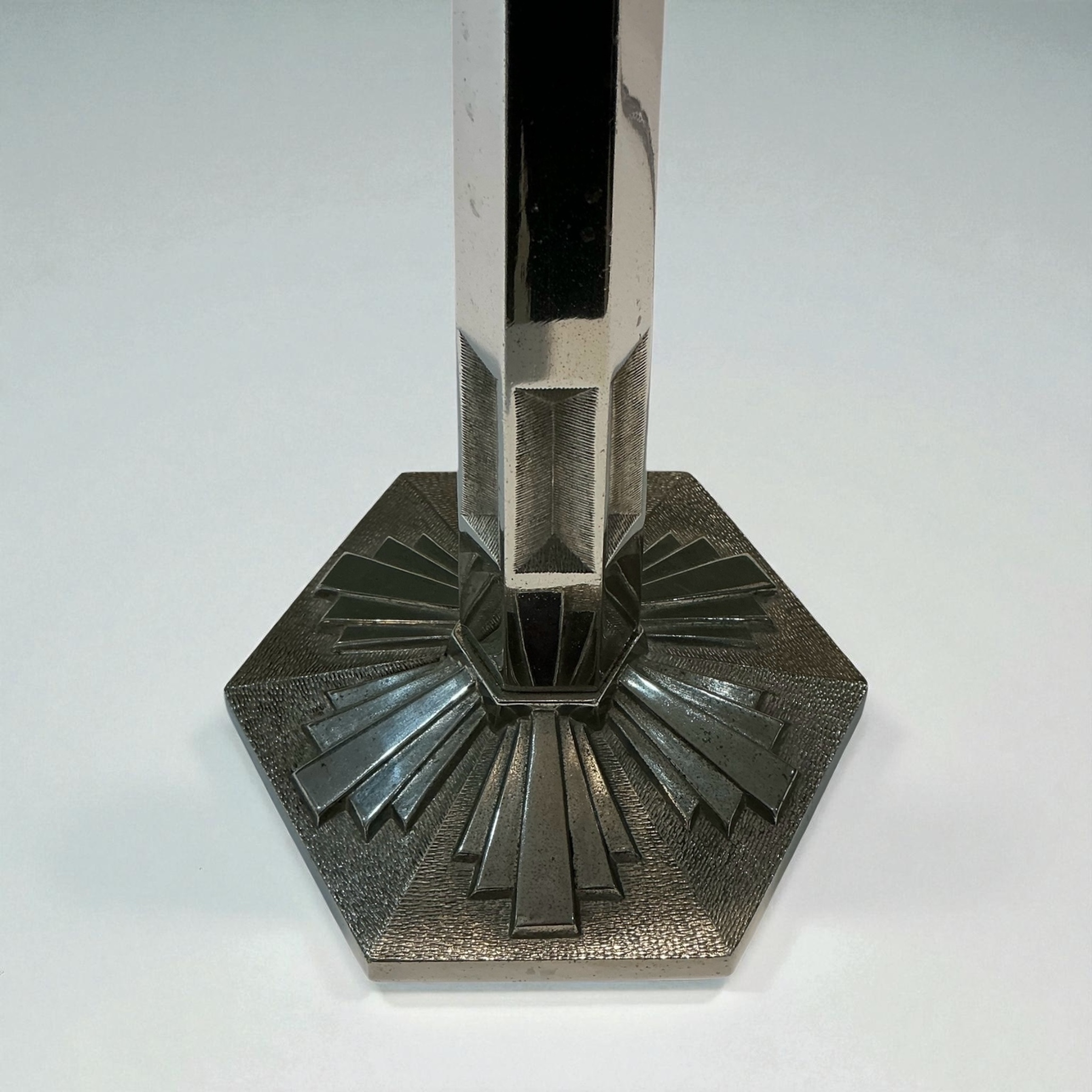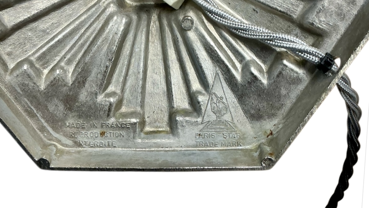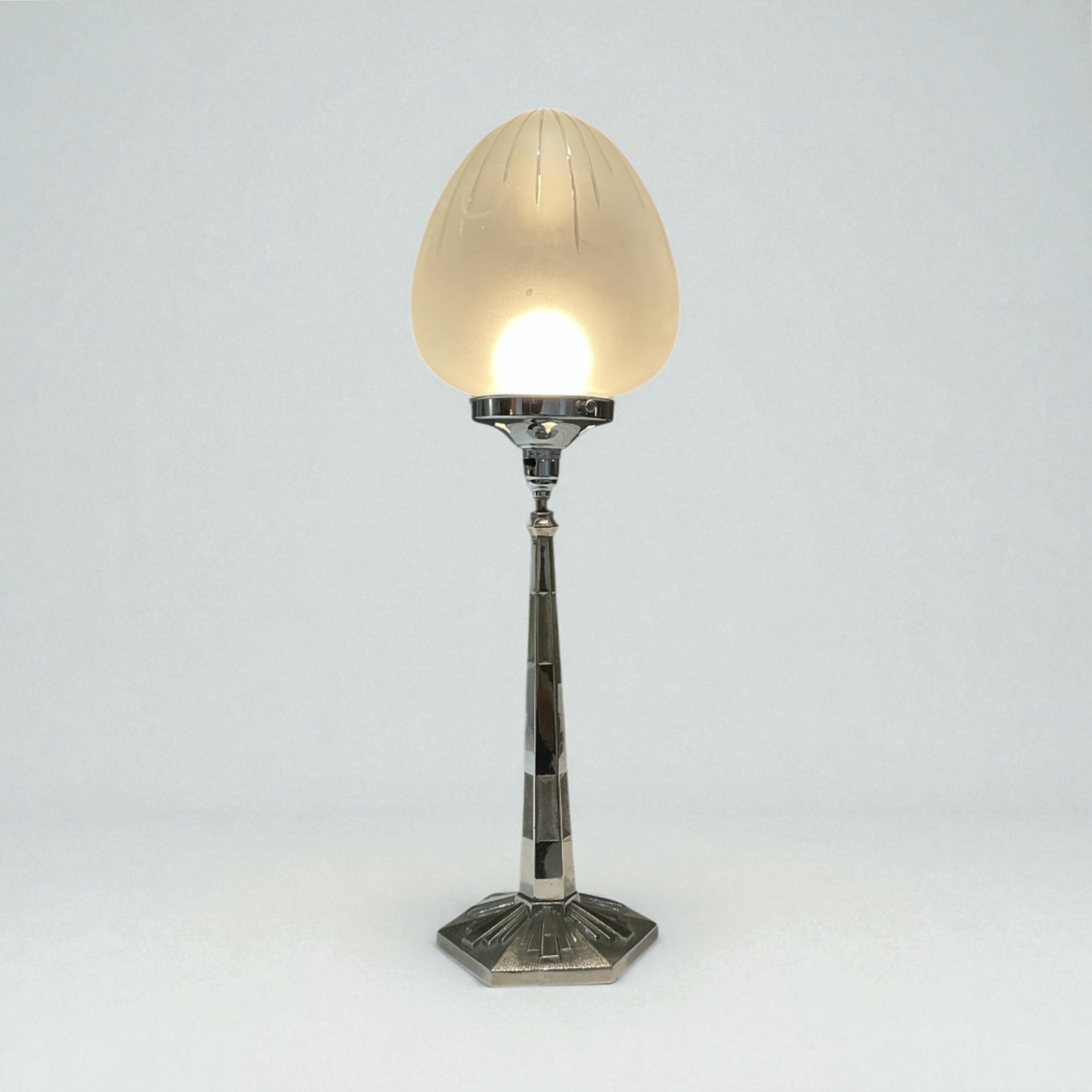 A French Art Deco table lamp, with a hexagonal base incorporating a raised fan shape design. A tapered column , with rectangular inverted detailing, supporting a glass opaque ovoid shape shade, with etched detailing. The underside of the base marked with the Paris Star trademark and ‘Made in France Reproduction Interdite’ (forbidden).
