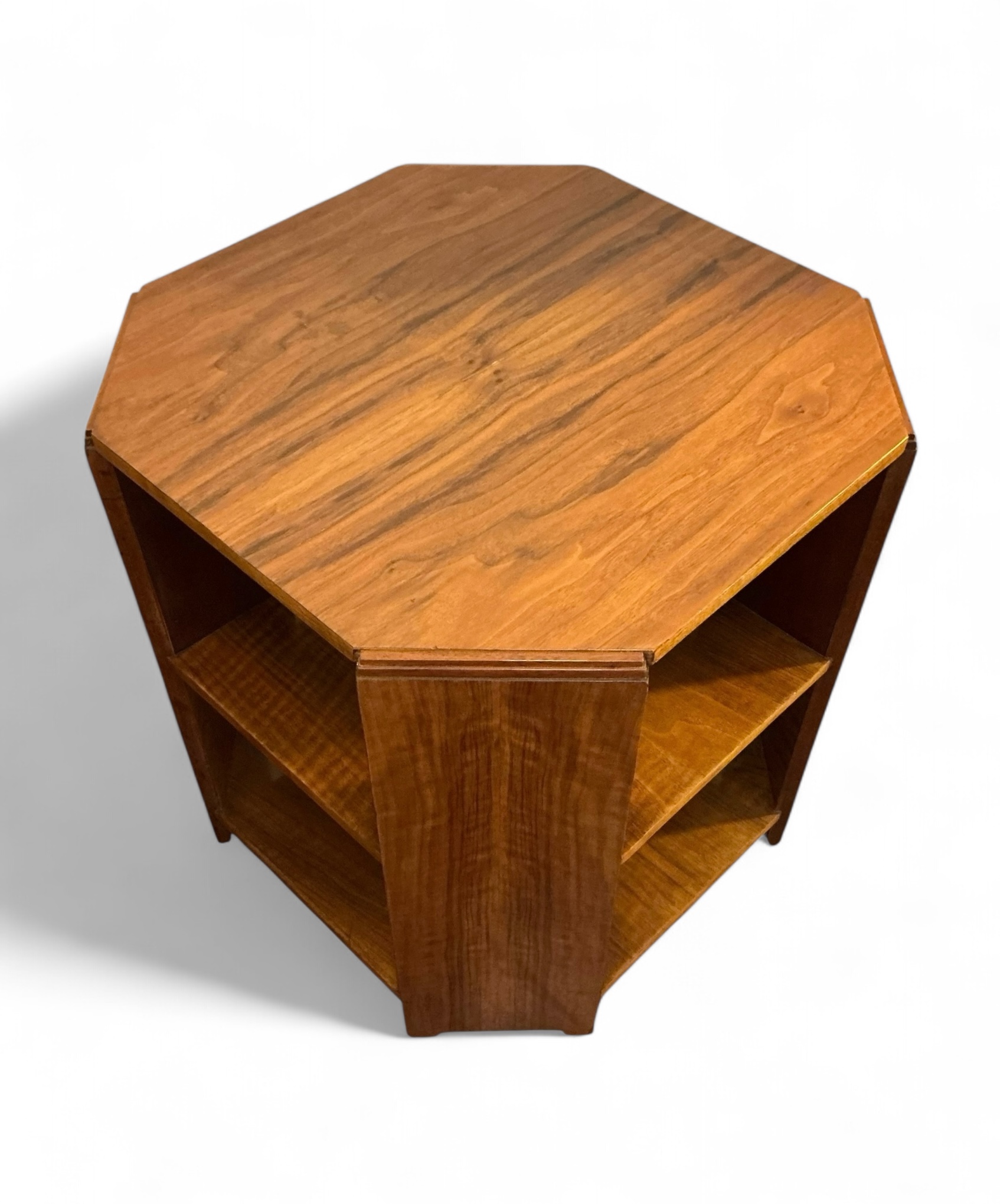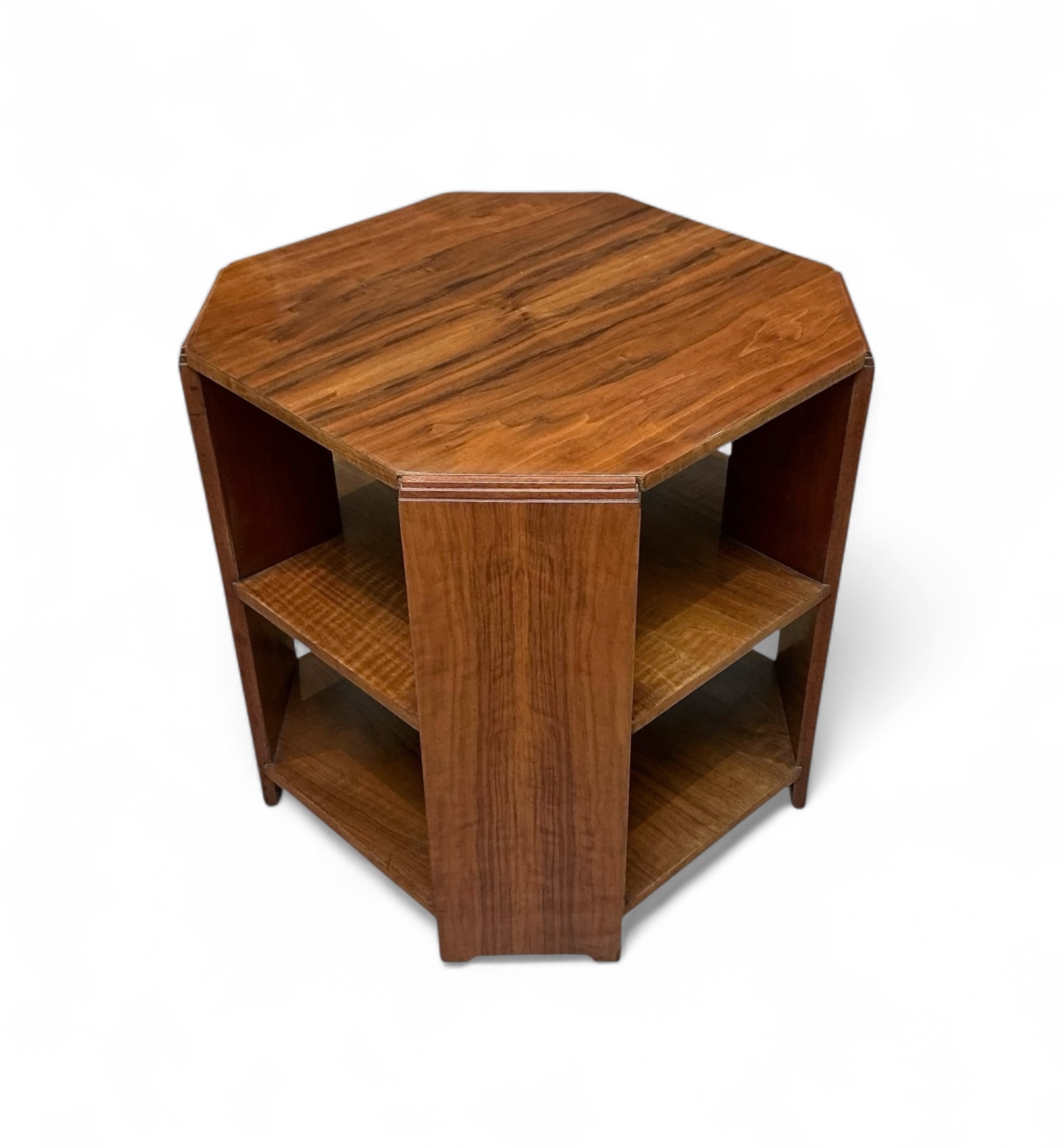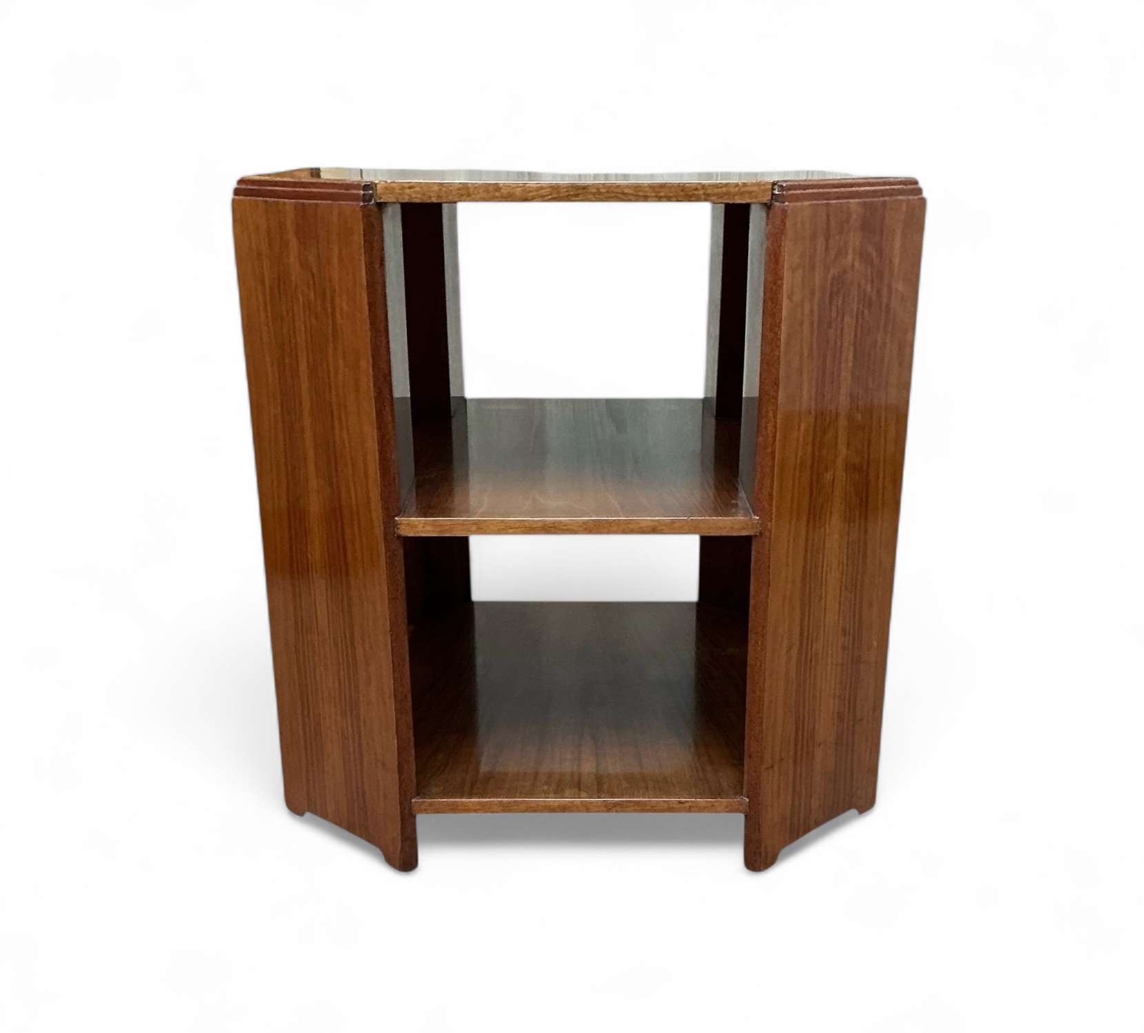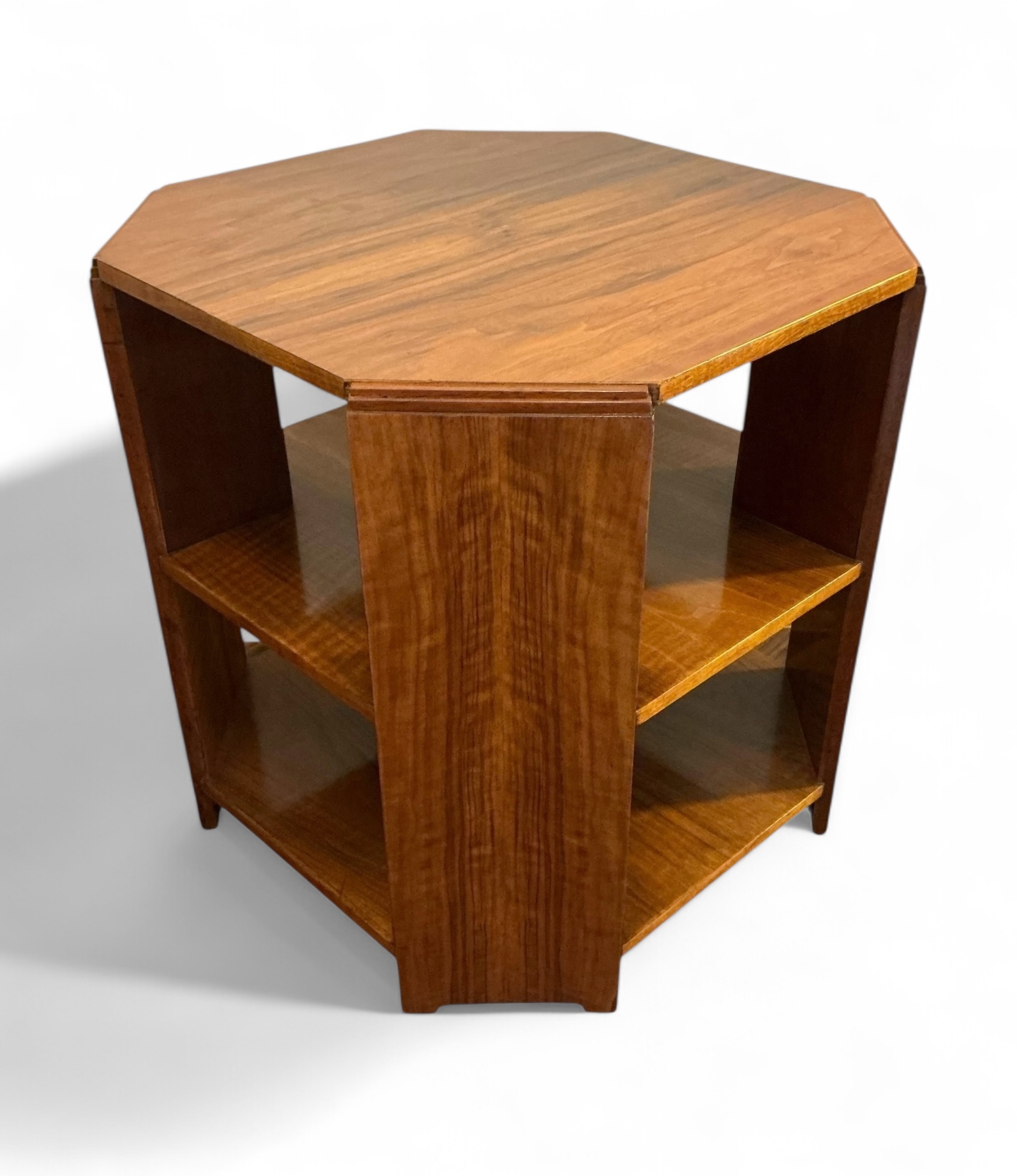 Art Deco bookcase in oak by Heal’s. Four shelves with the top two curved to match the top. To each side four shelves, ideal for display. The Heal’s ivorine disc to the back.