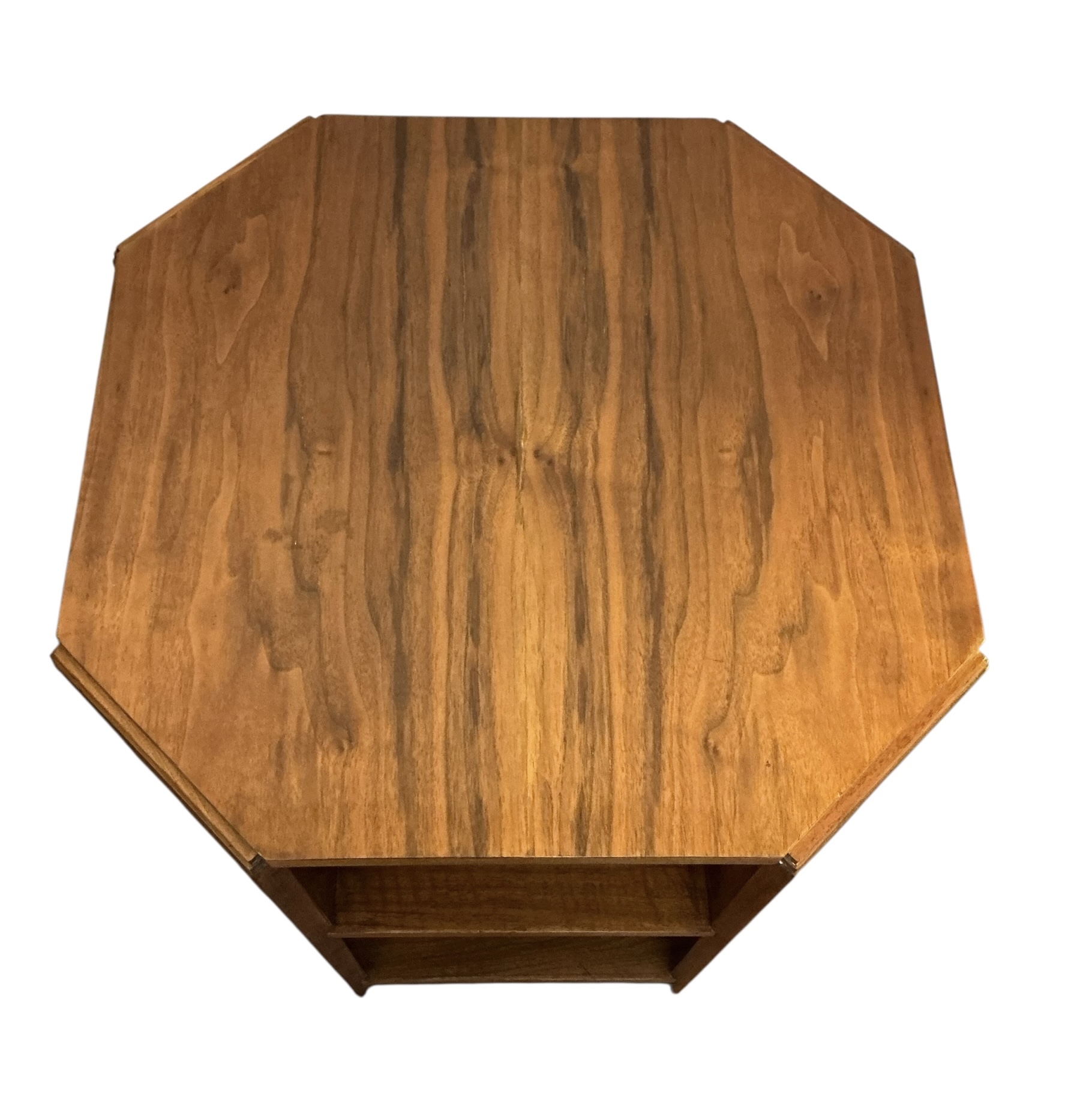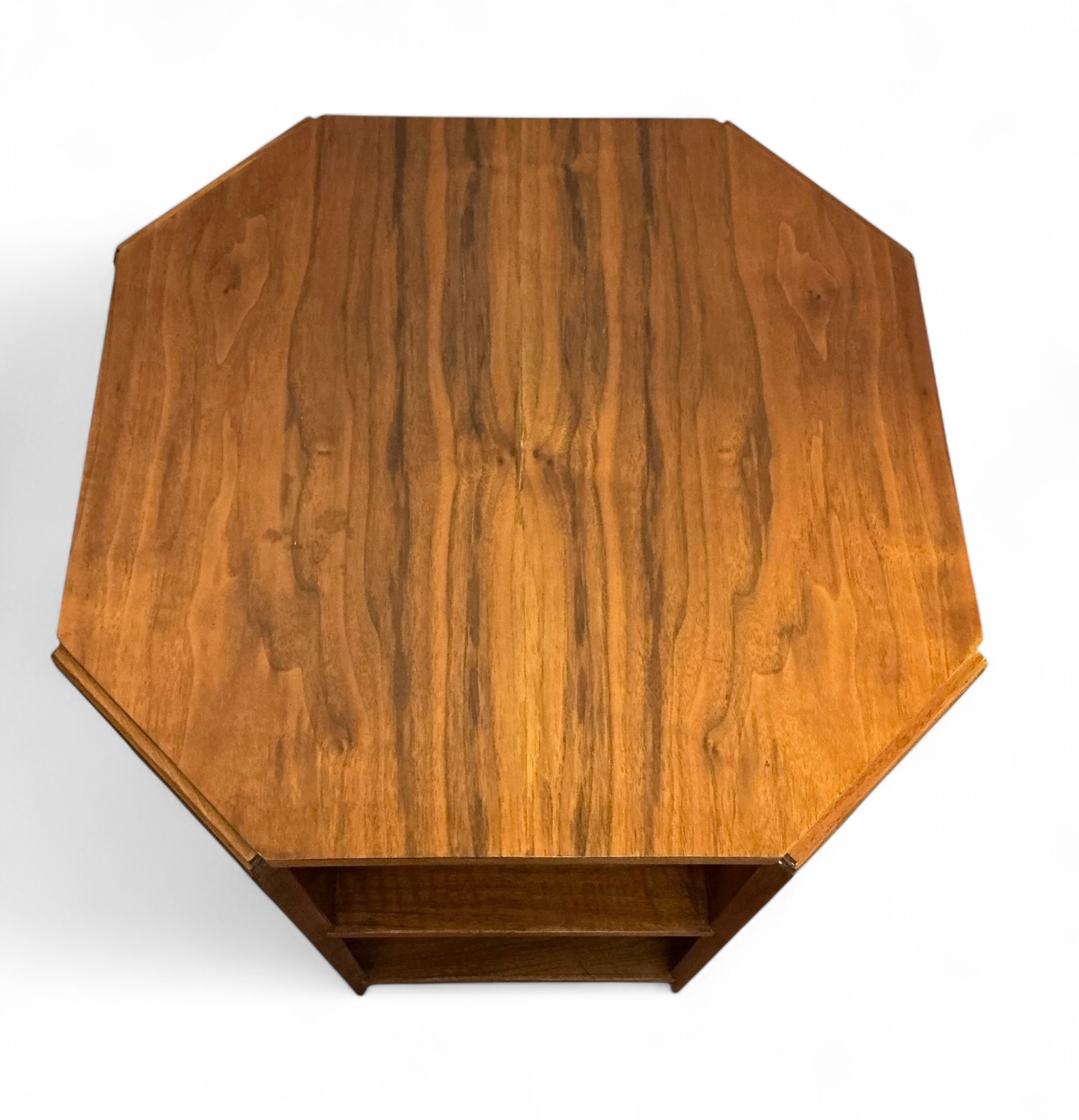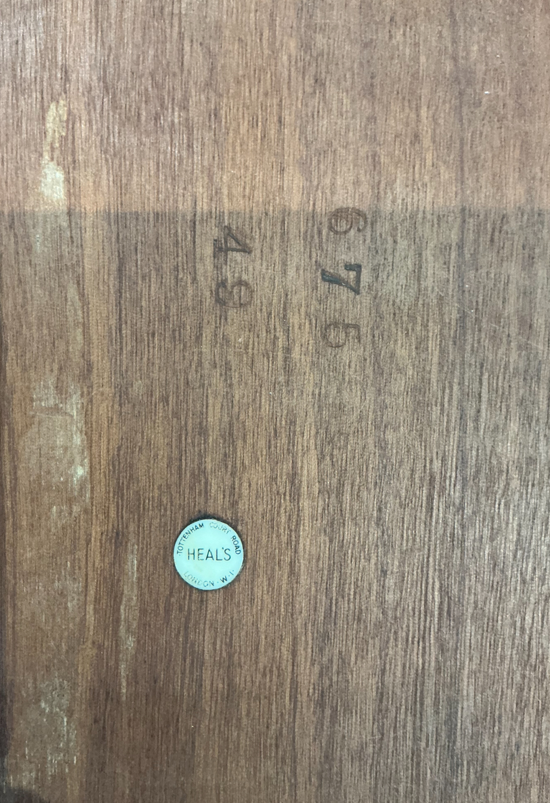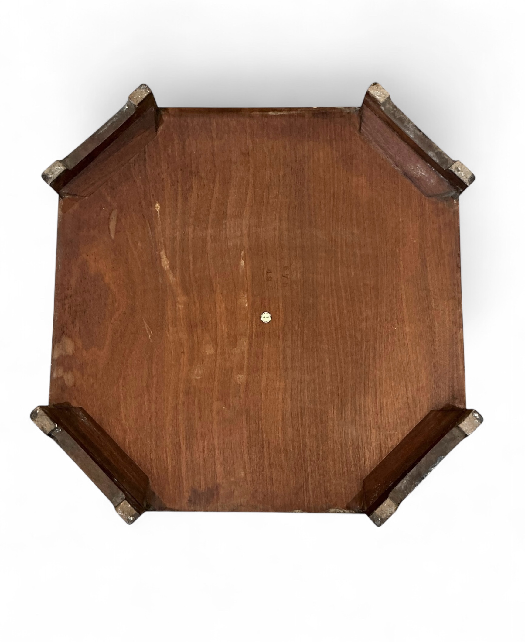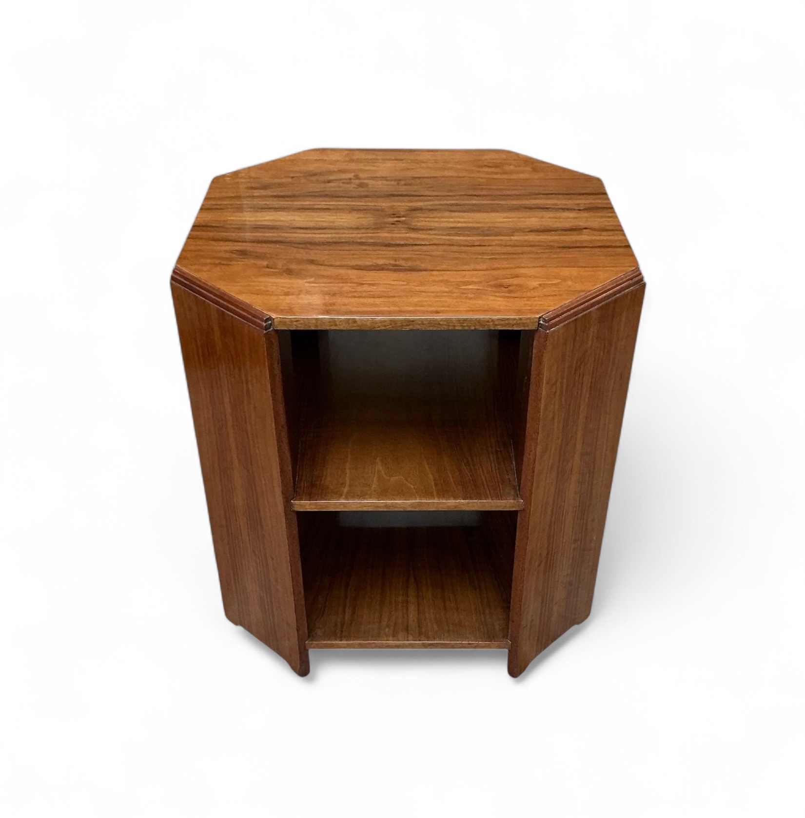 Art Deco bookcase in oak by Heal’s. Four shelves with the top two curved to match the top. To each side four shelves, ideal for display. The Heal’s ivorine disc to the back.