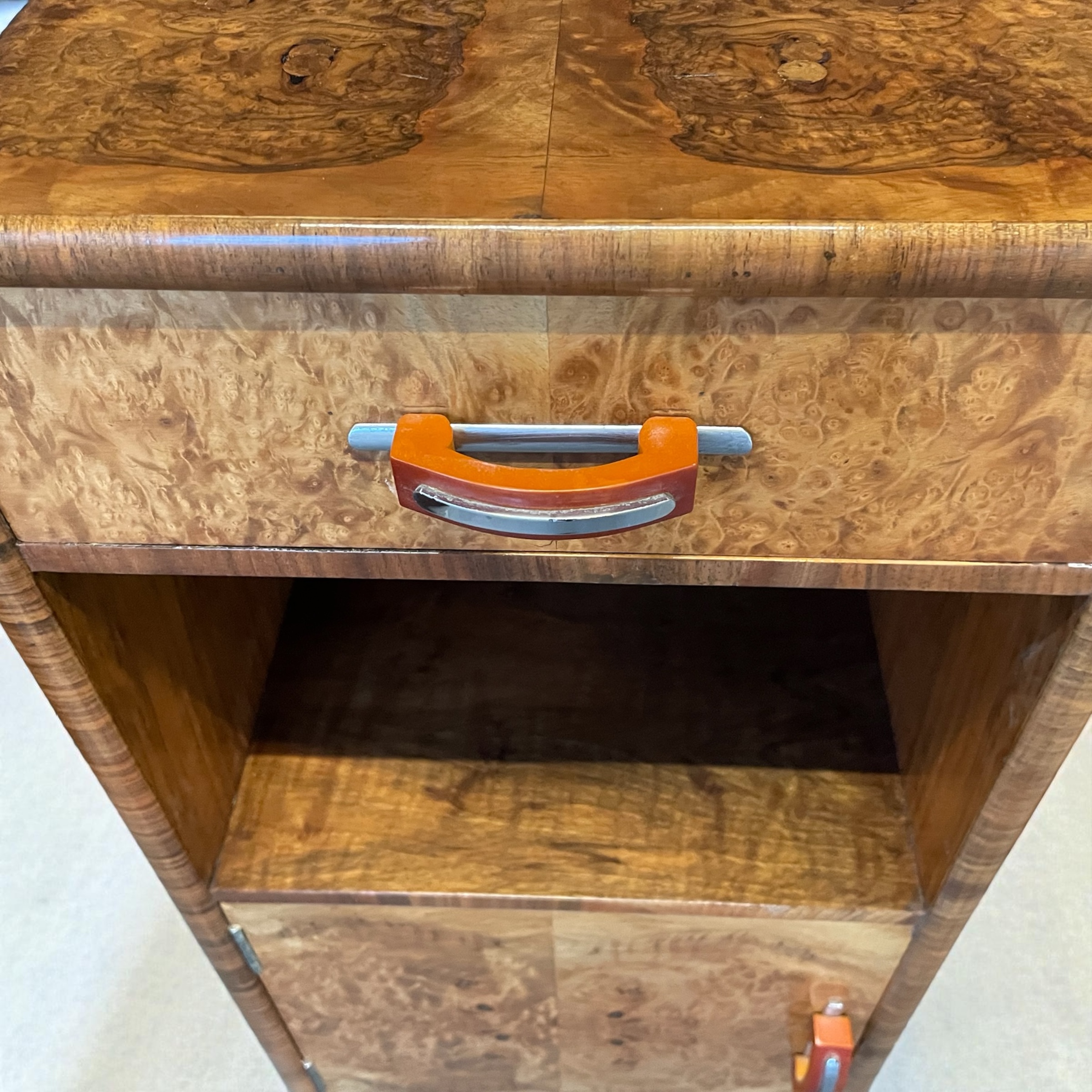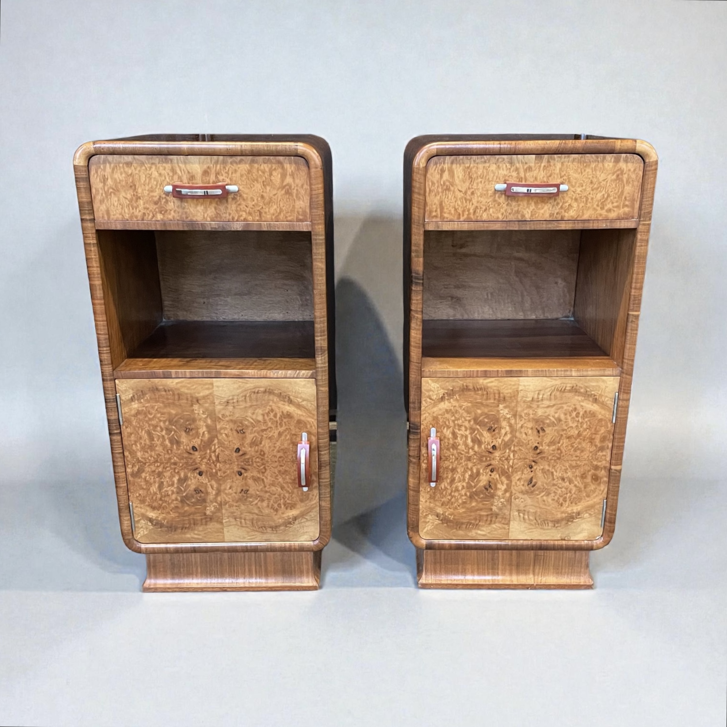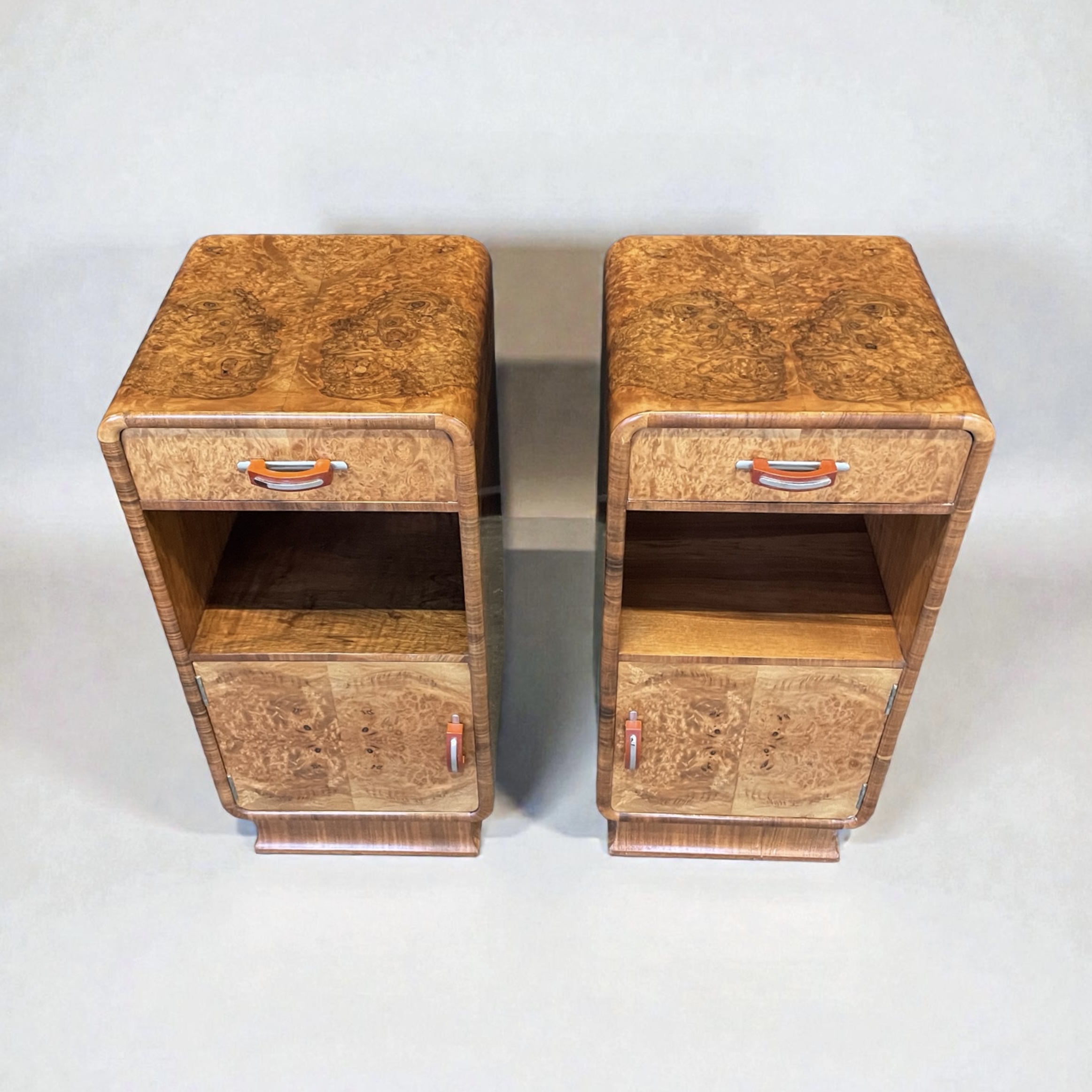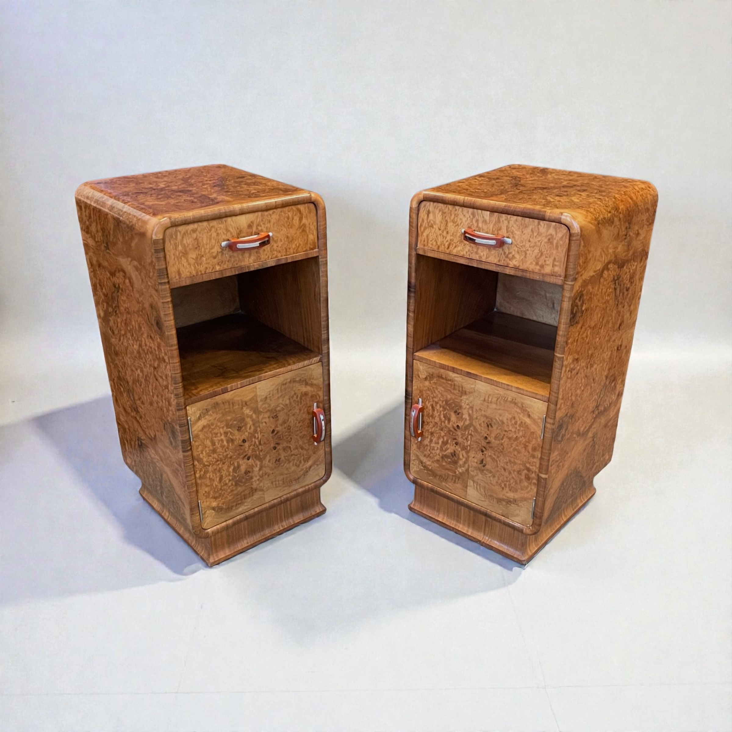 A Pair of Art Deco Bedside tables in burr walnut, with unusual, but elegant curved corners and raised on a square base. Each with a top drawer, an open shelf and below a cupboard with two shelves. The drawers and cupboards with attractive red phenolic and chrome handles. All our furniture is professionally waxed and polished and restored where necessary . This pair of bedside tables in showroom condition.
