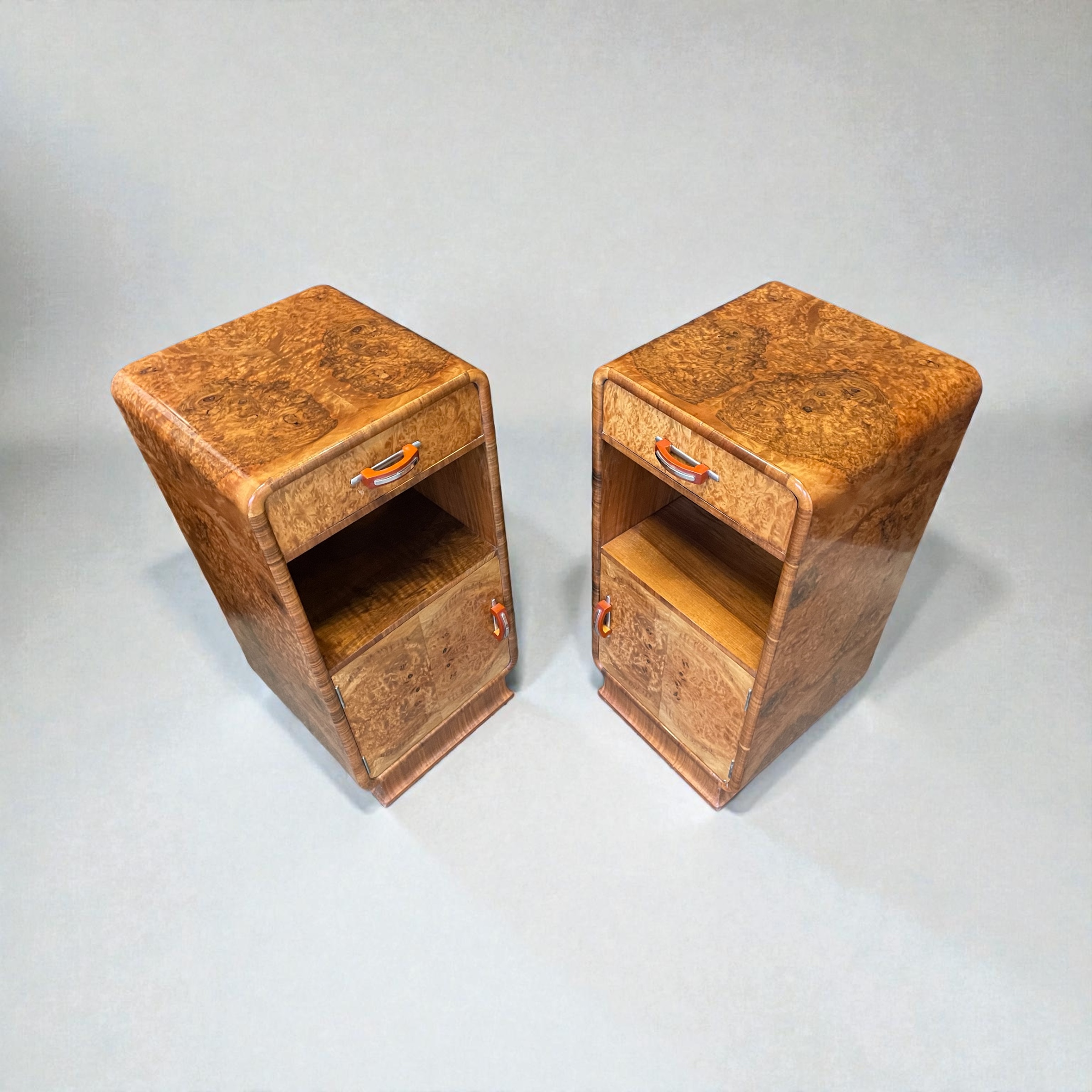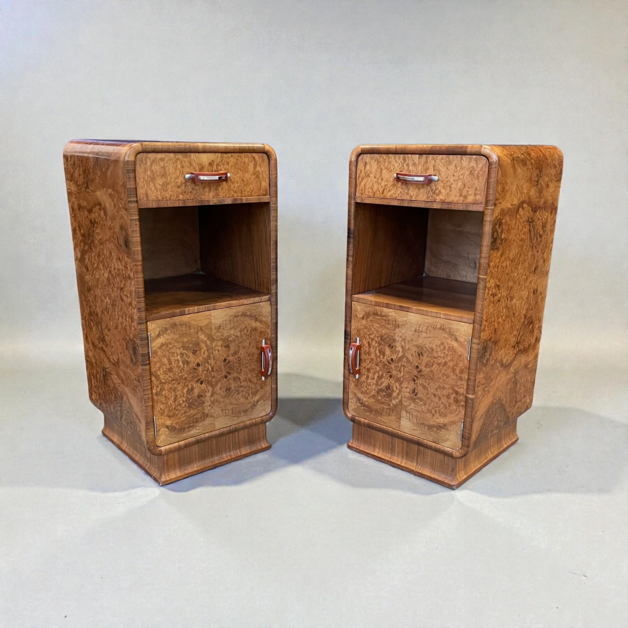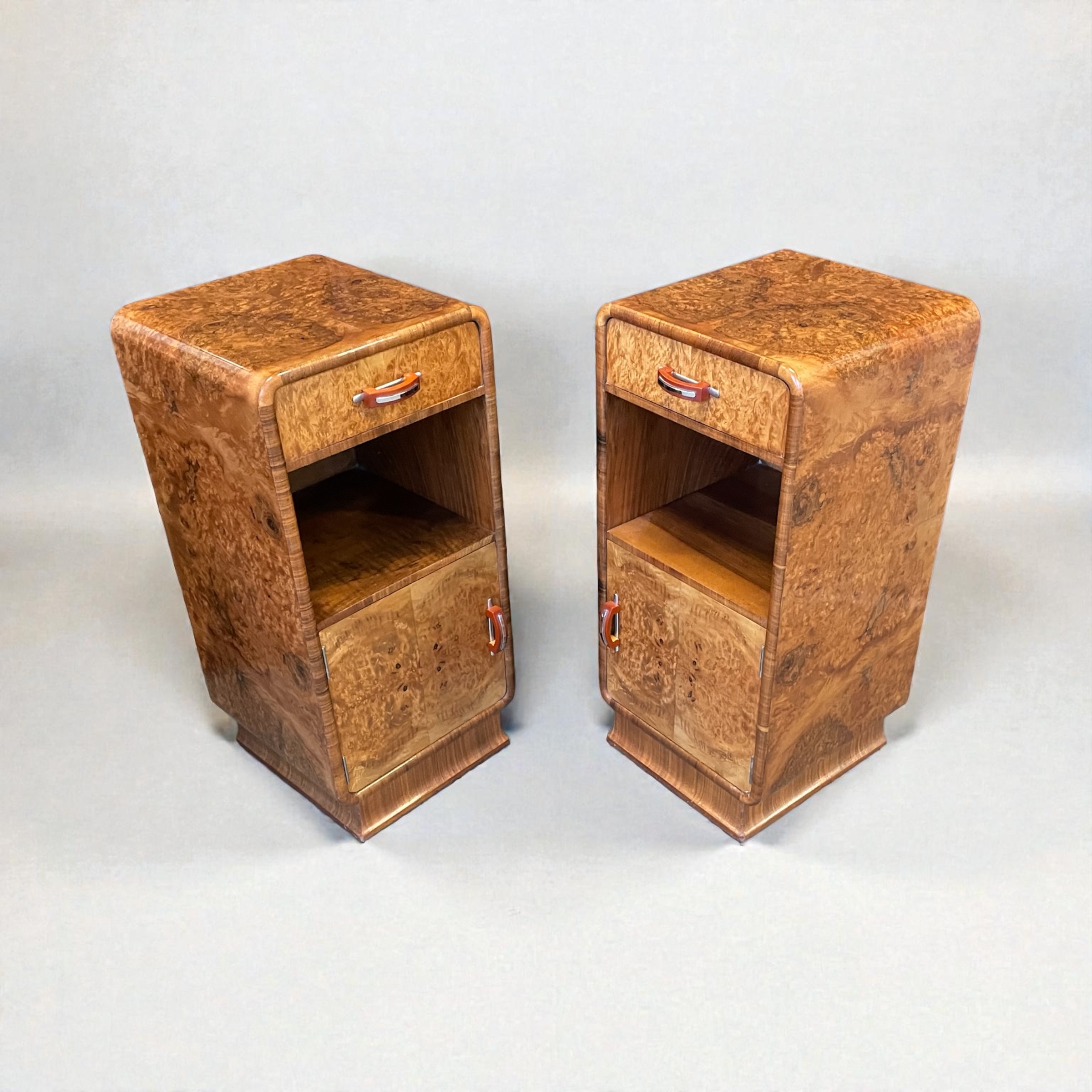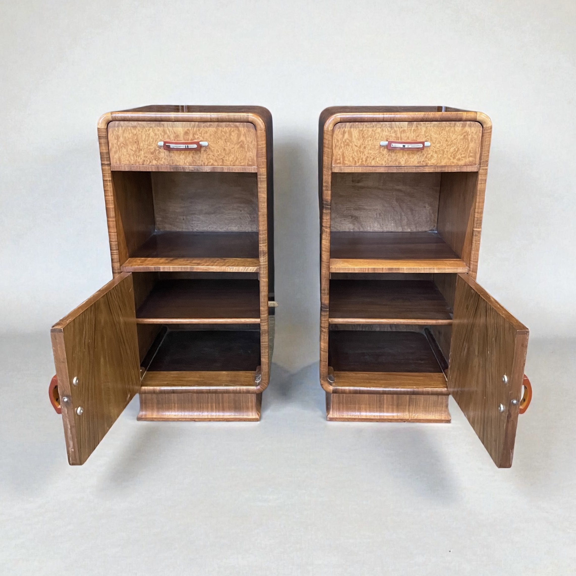 A Pair of Art Deco Bedside tables in burr walnut, with unusual, but elegant curved corners and raised on a square base. Each with a top drawer, an open shelf and below a cupboard with two shelves. The drawers and cupboards with attractive red phenolic and chrome handles. All our furniture is professionally waxed and polished and restored where necessary . This pair of bedside tables in showroom condition.