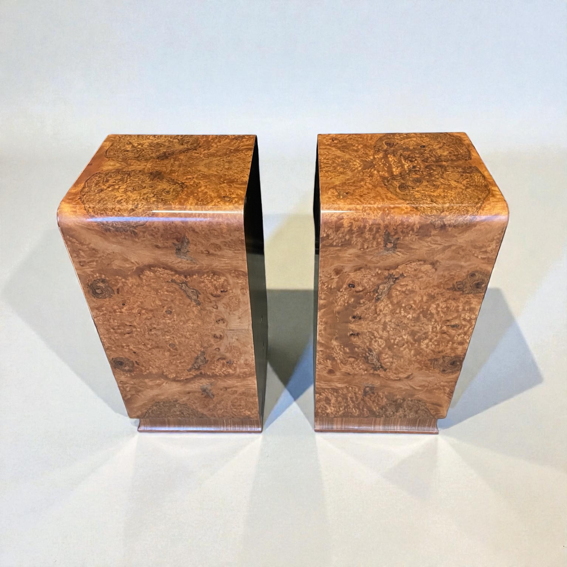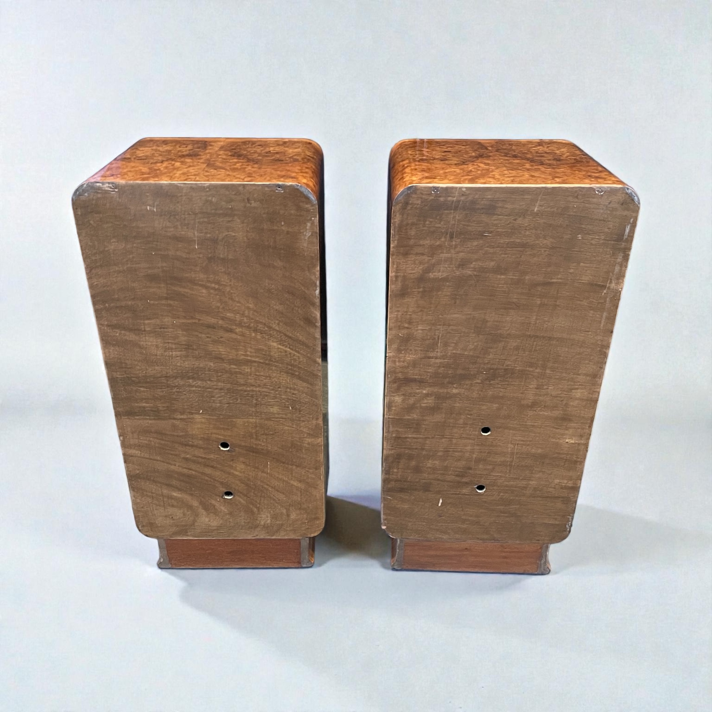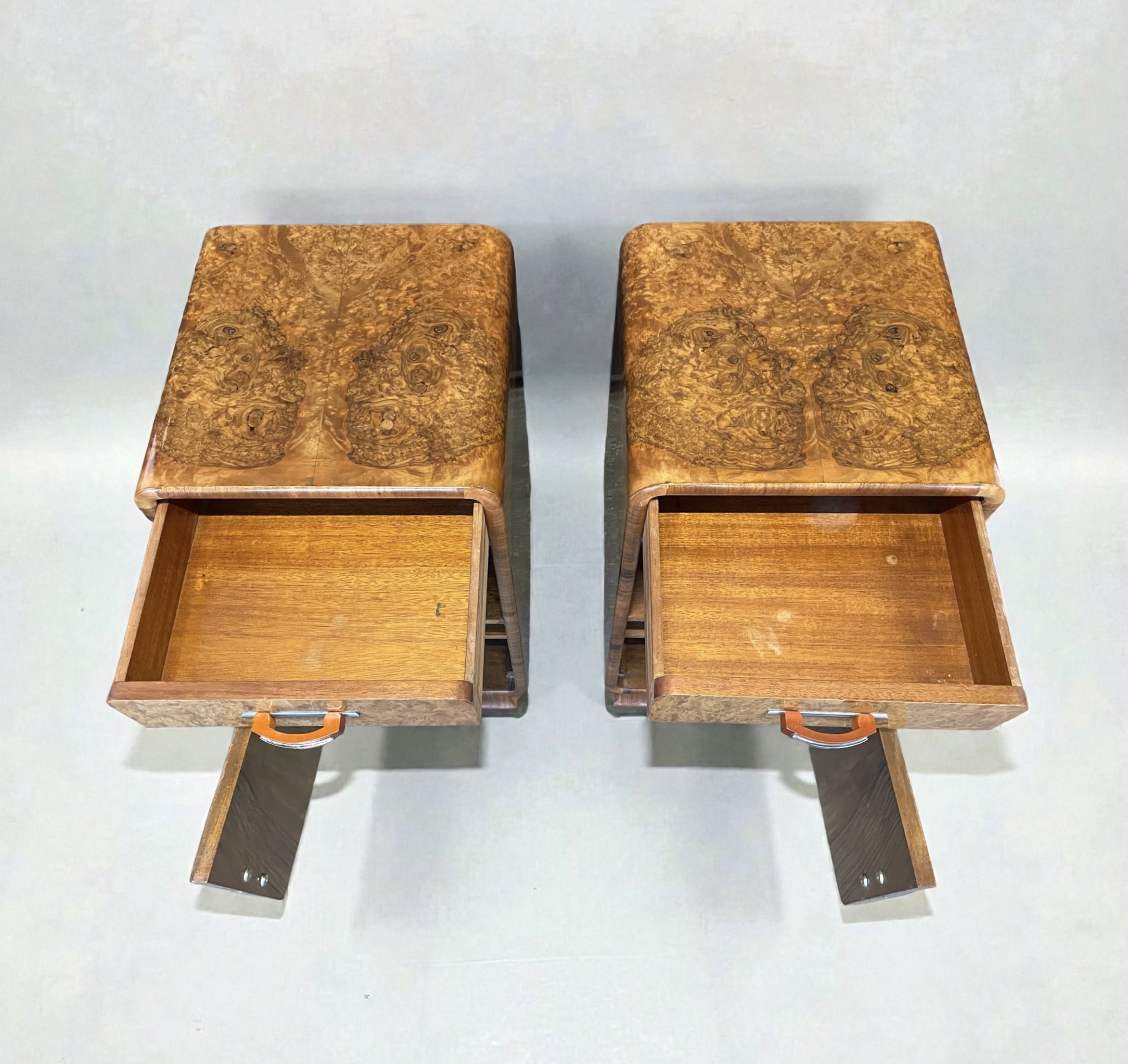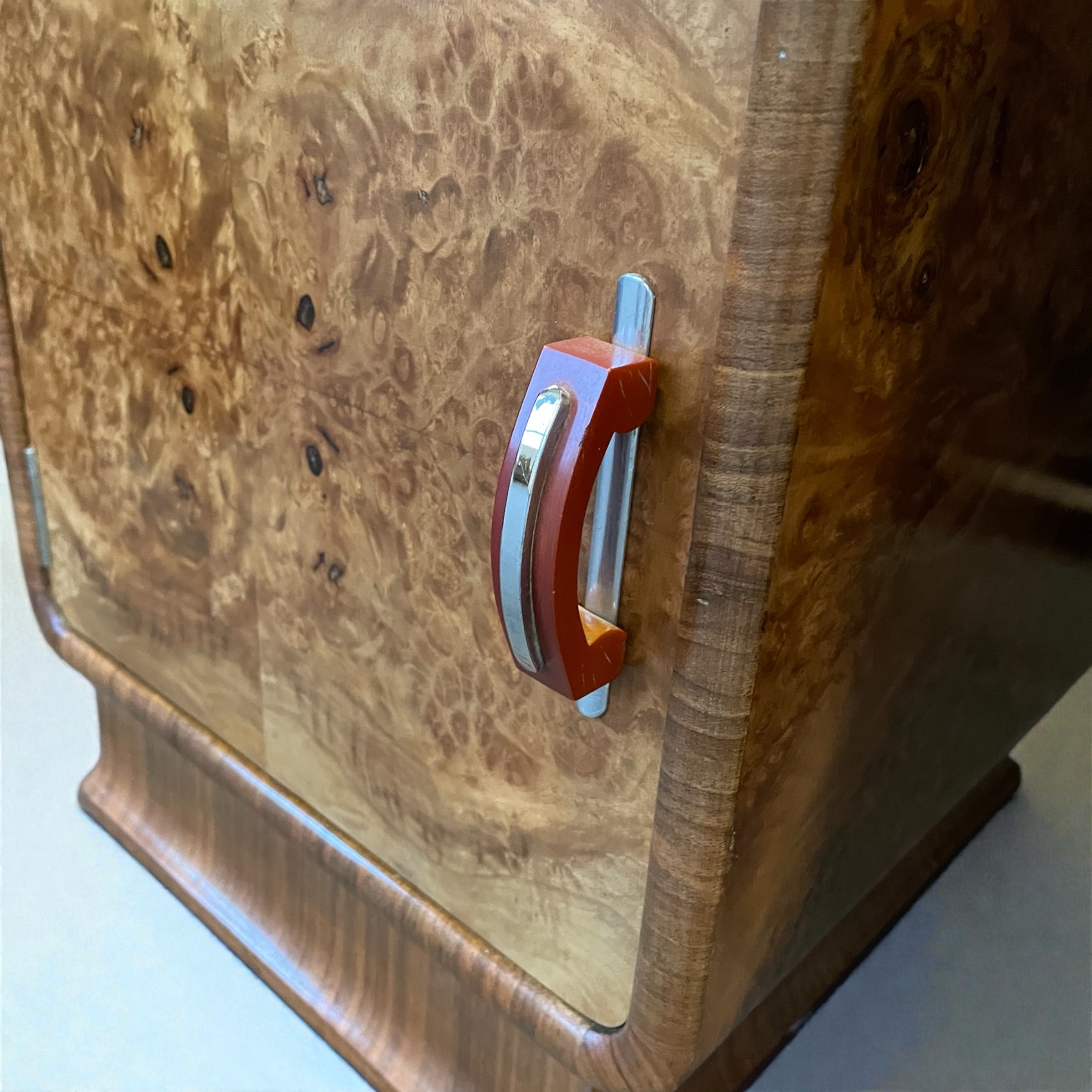 A Pair of Art Deco Bedside tables in burr walnut, with unusual, but elegant curved corners and raised on a square base. Each with a top drawer, an open shelf and below a cupboard with two shelves. The drawers and cupboards with attractive red phenolic and chrome handles. All our furniture is professionally waxed and polished and restored where necessary . This pair of bedside tables in showroom condition.