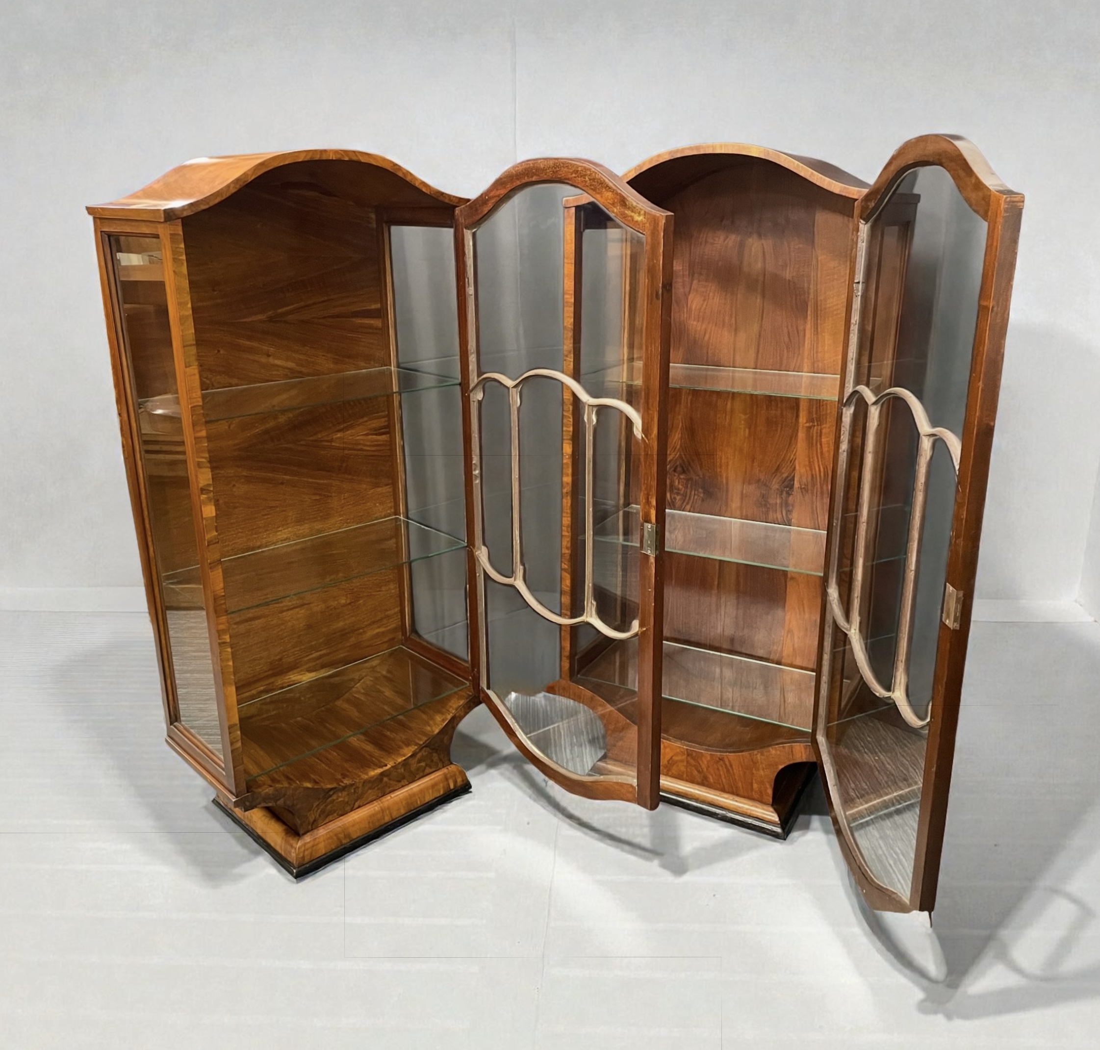 A pair of elegant Art Deco matched display cabinets in walnut. Astragal glazed doors, with rectangular escutcheons, each opening to three glass shelves.