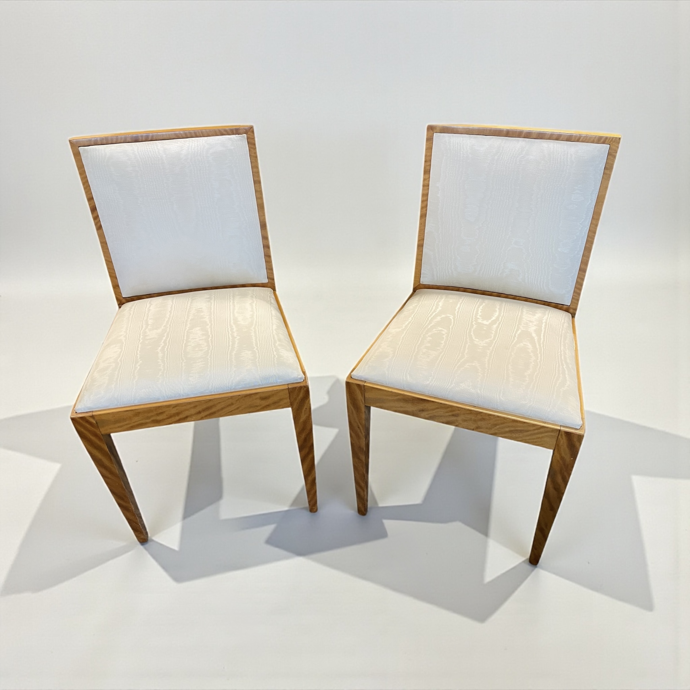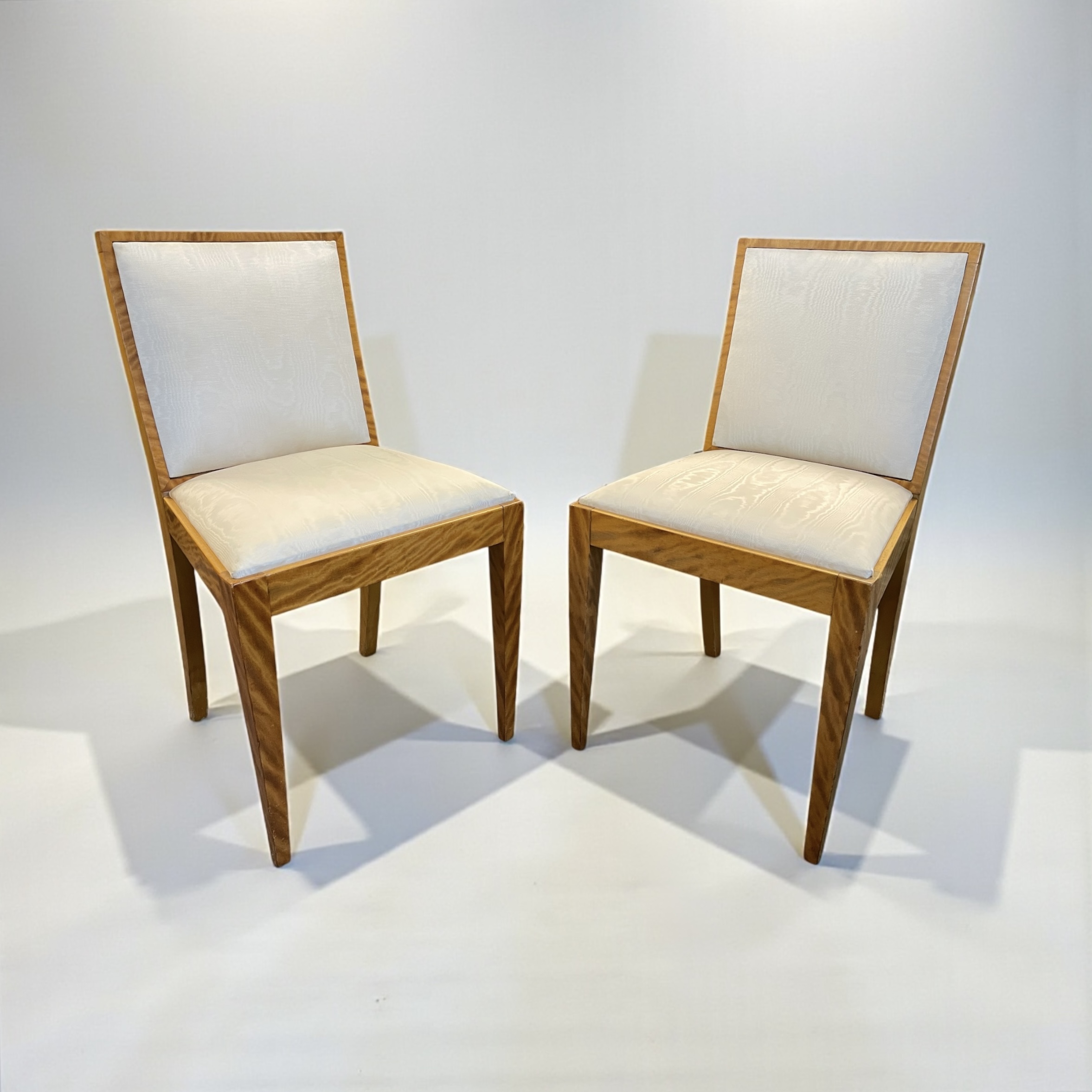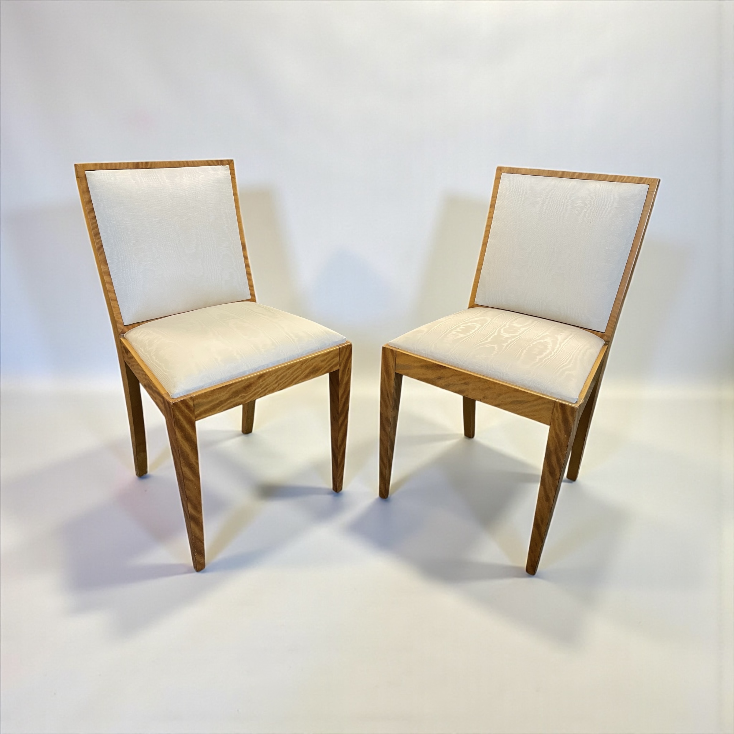 A quality pair of Art Deco petit side chairs or bedroom chairs by Bath Cabinet Makers. Made from satinwood and upholstered in cream satin to the seats and backs. The reference numbers stamped to the underside of each chair.