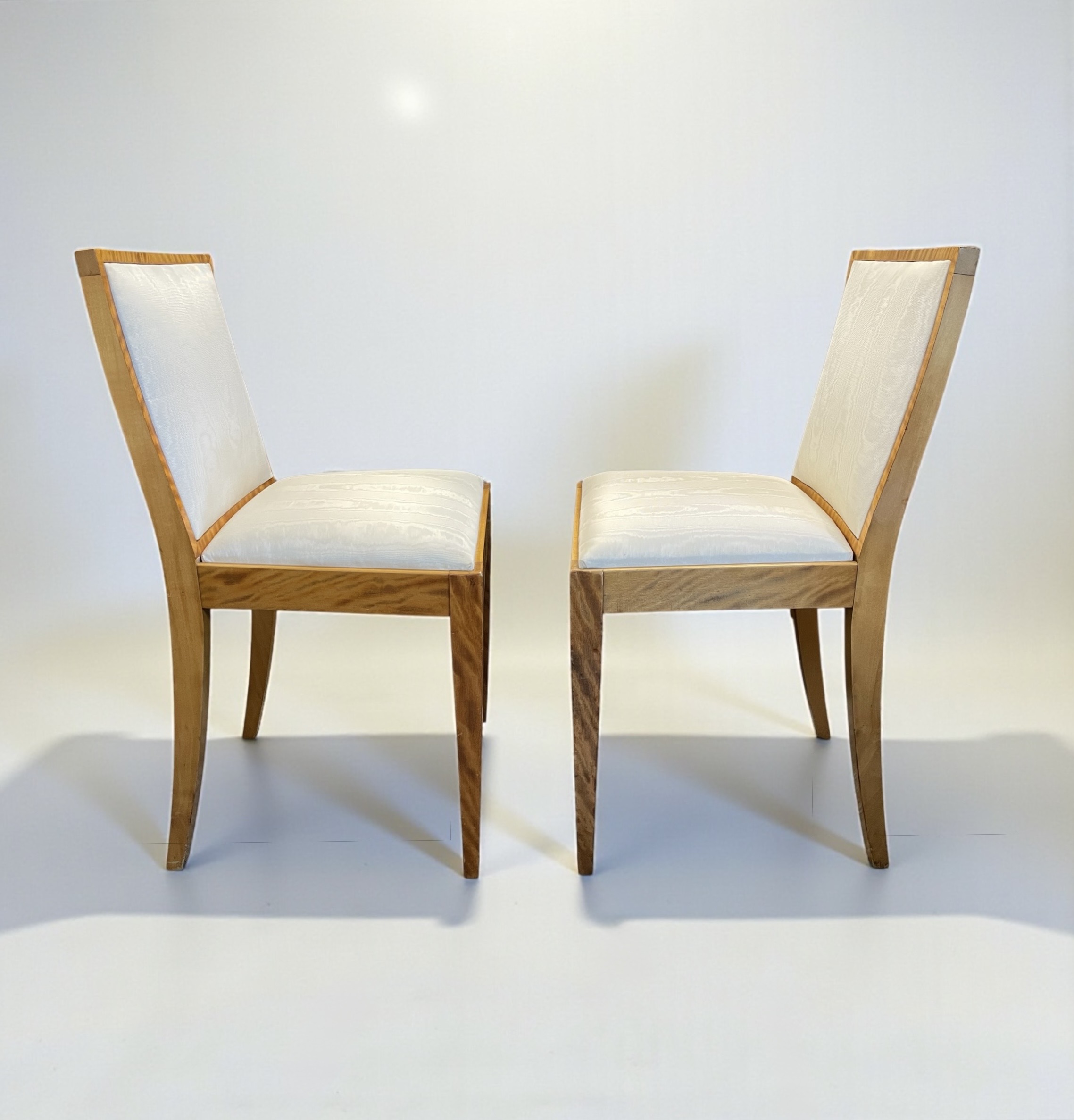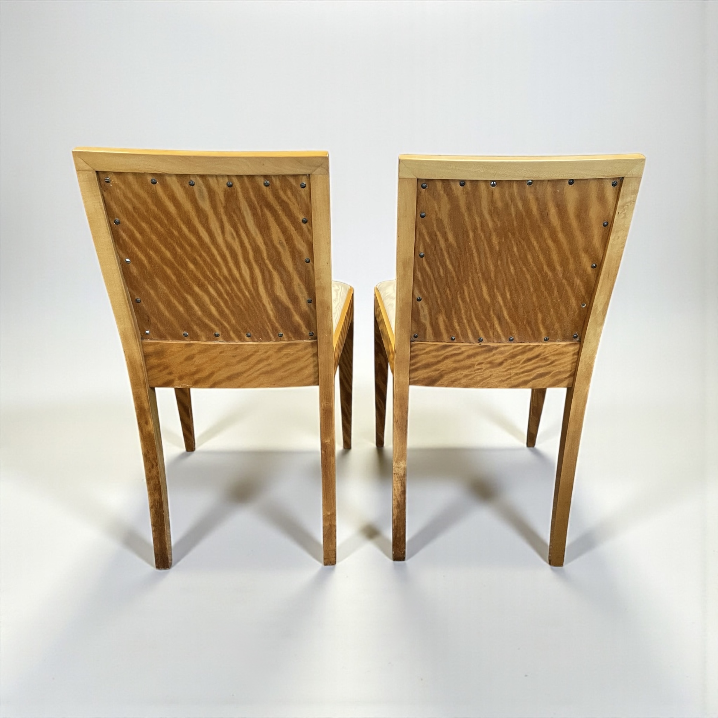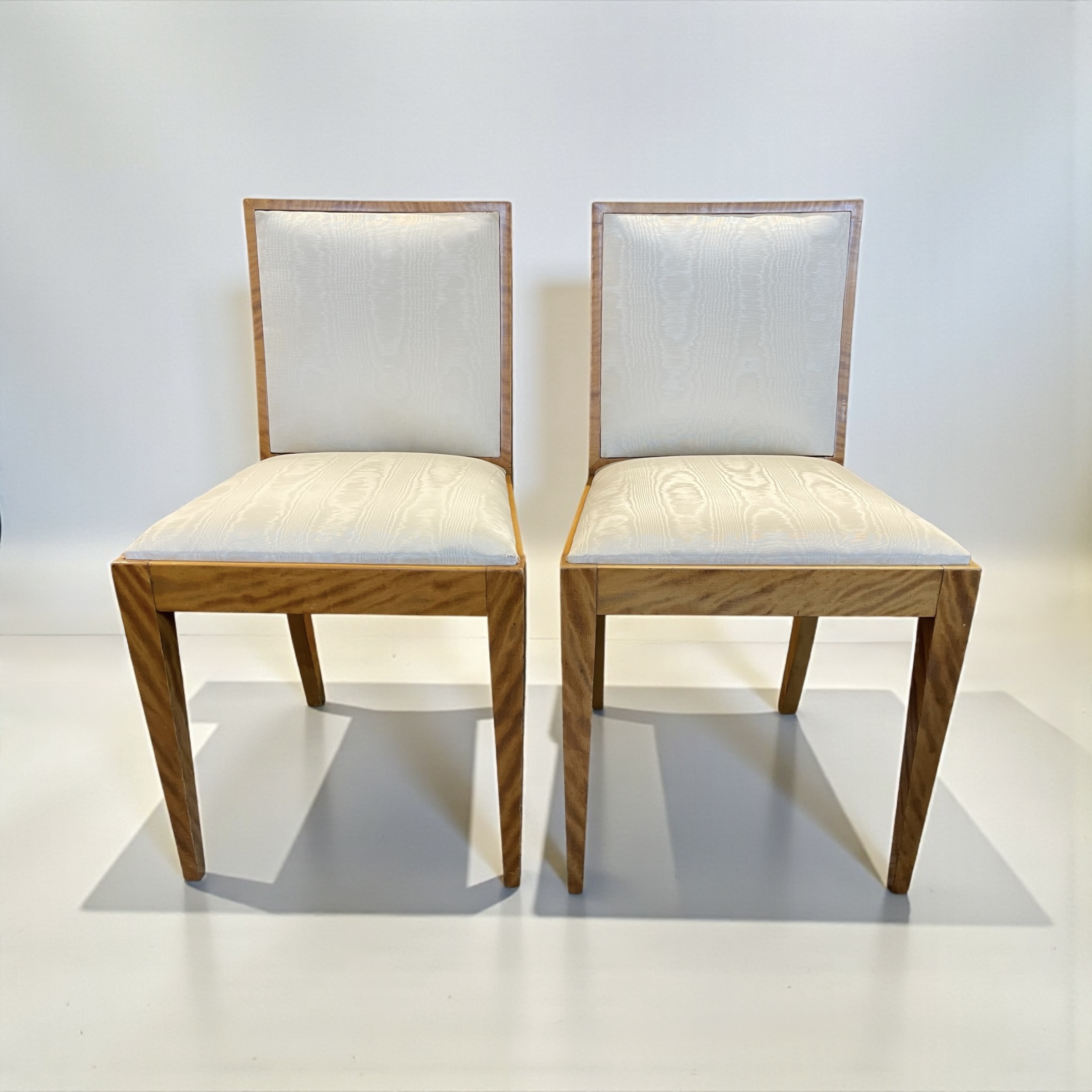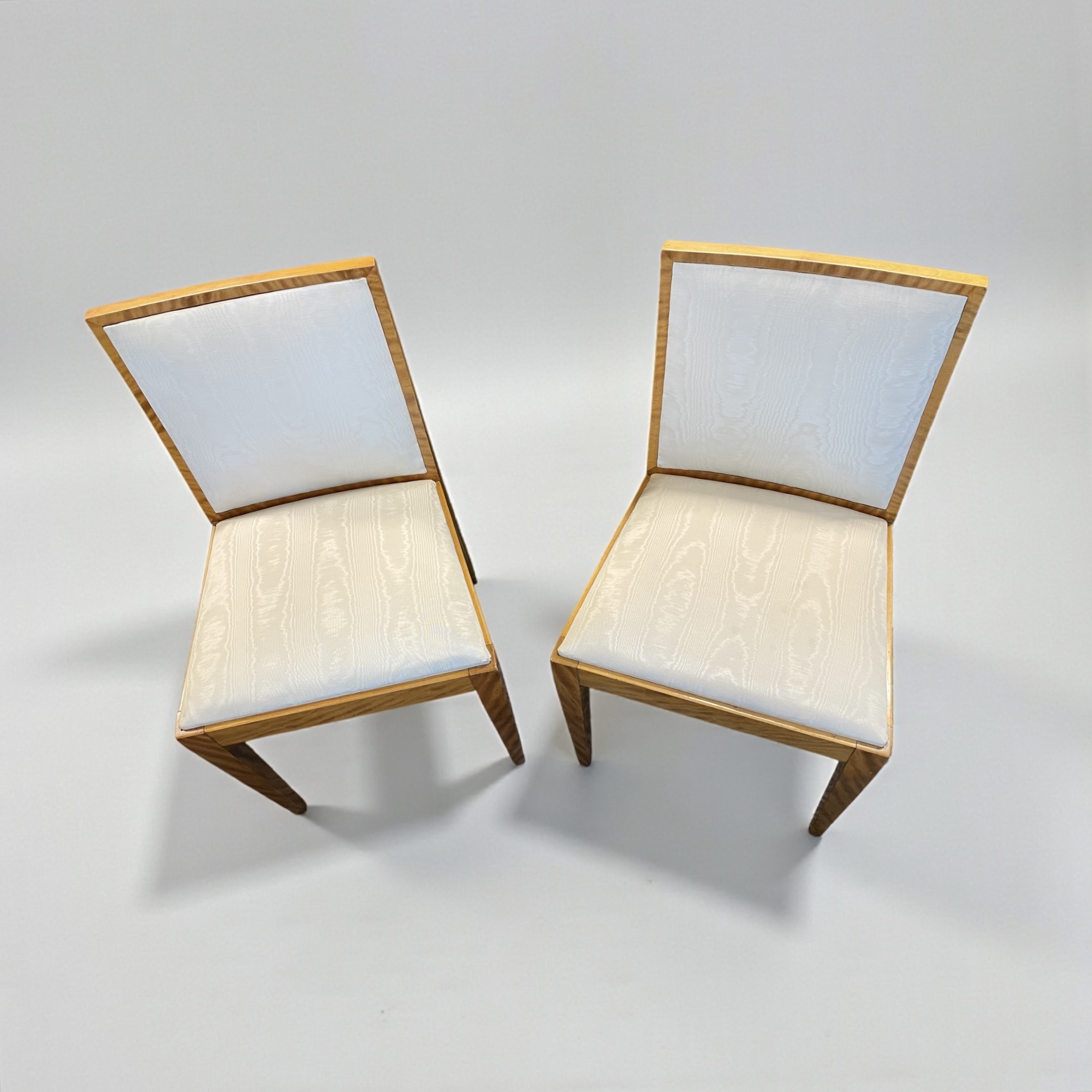 A quality pair of Art Deco petit side chairs or bedroom chairs by Bath Cabinet Makers. Made from satinwood and upholstered in cream satin to the seats and backs. The reference numbers stamped to the underside of each chair.