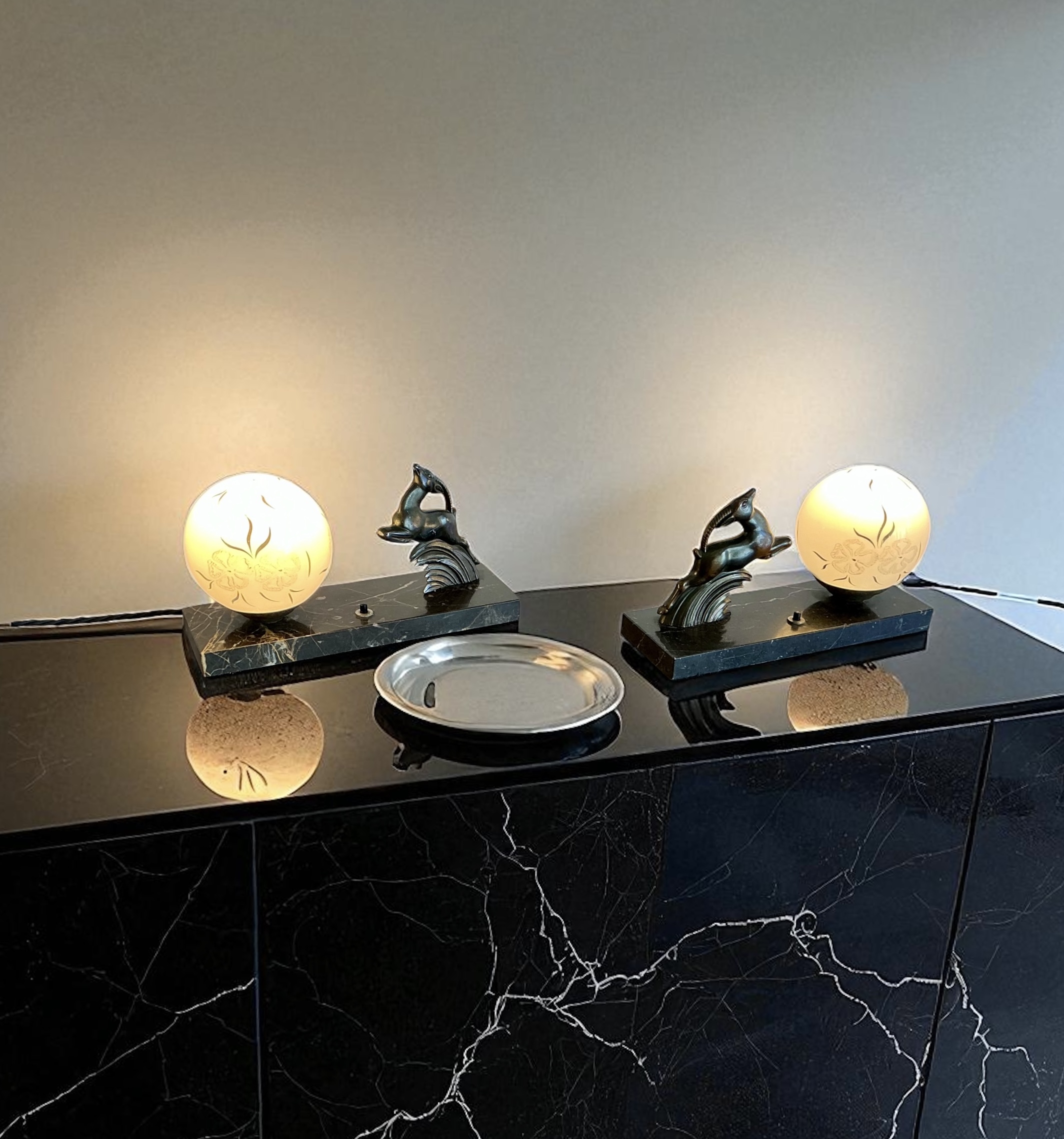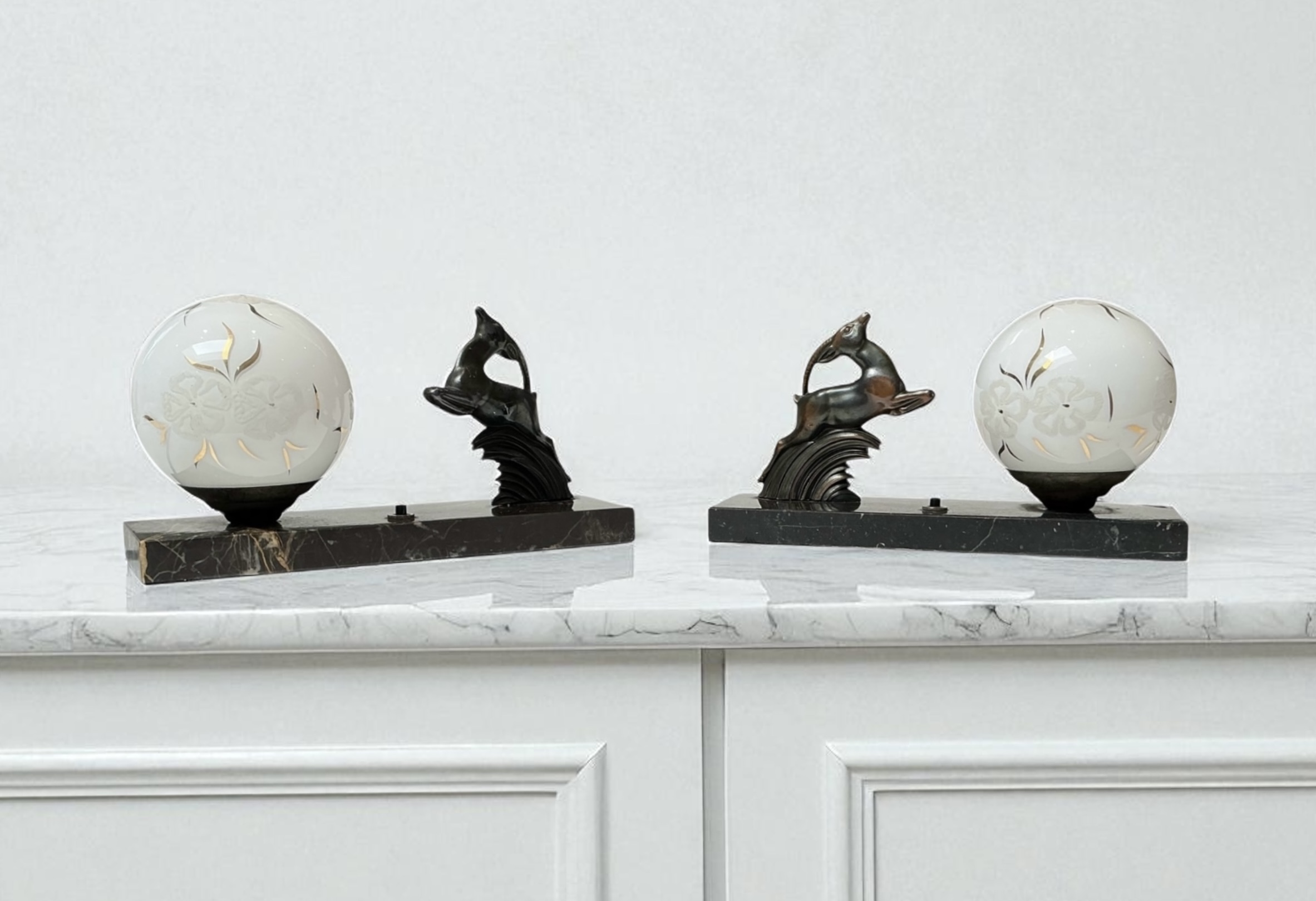 Pair of French Art Deco Mood Lamps. Each with a rectangular veined black marble base, with a spelter antelope to one side and a light to the other. Each white glass shade with gold detailing and raised floral decoration. Both in very good condition and just rewired with an authentic black cord lead.