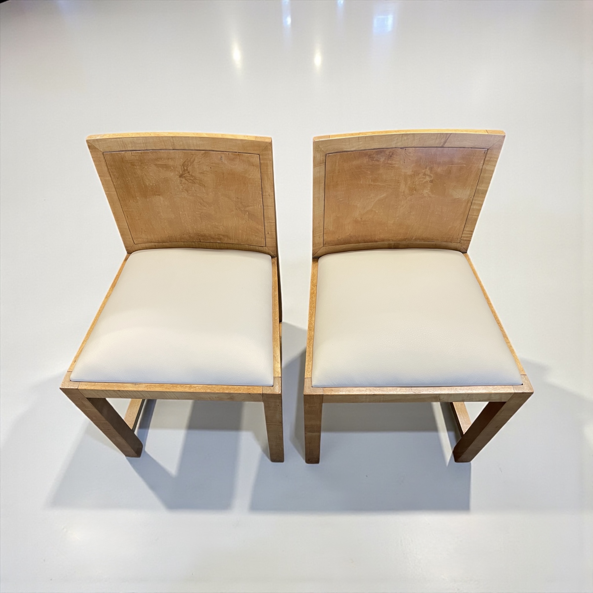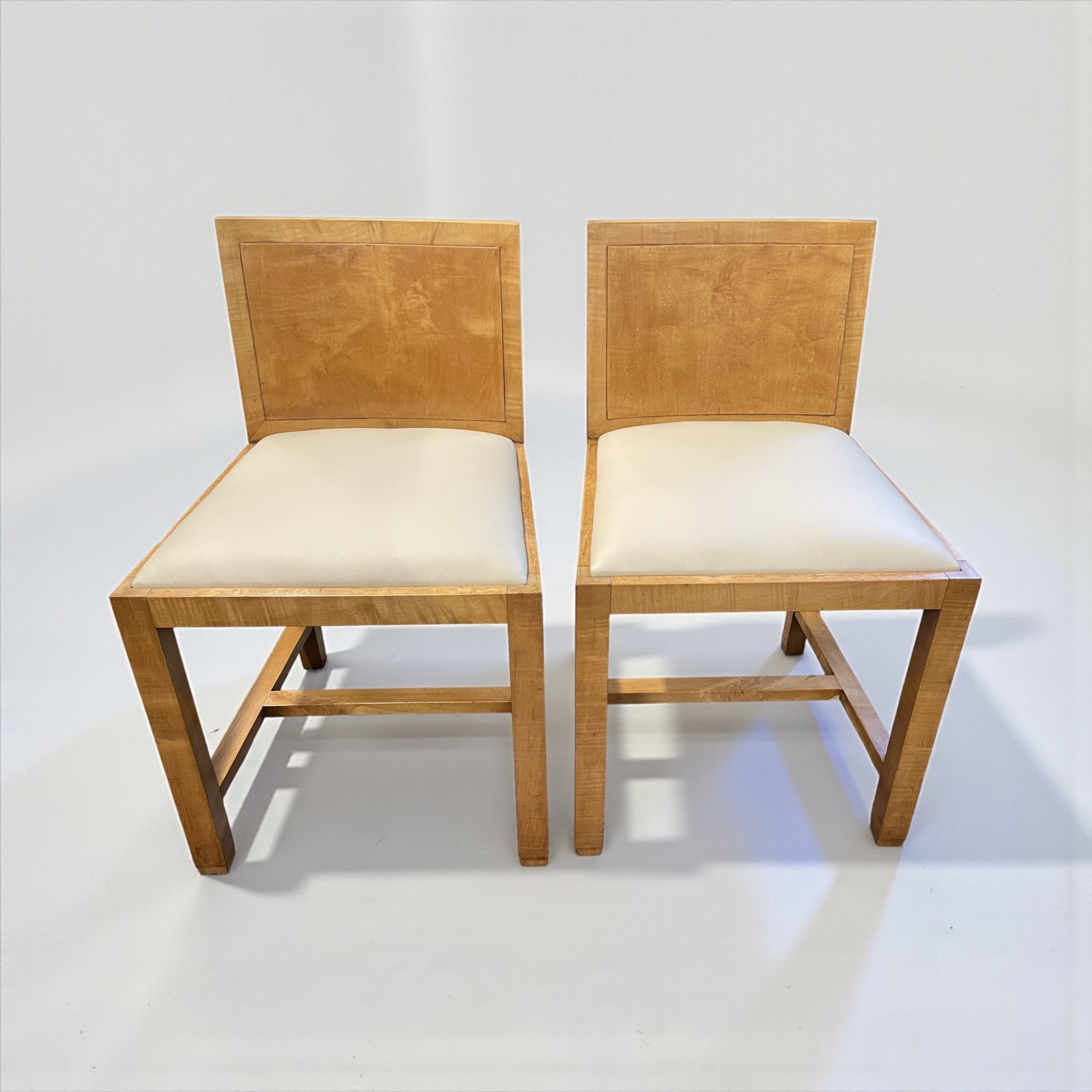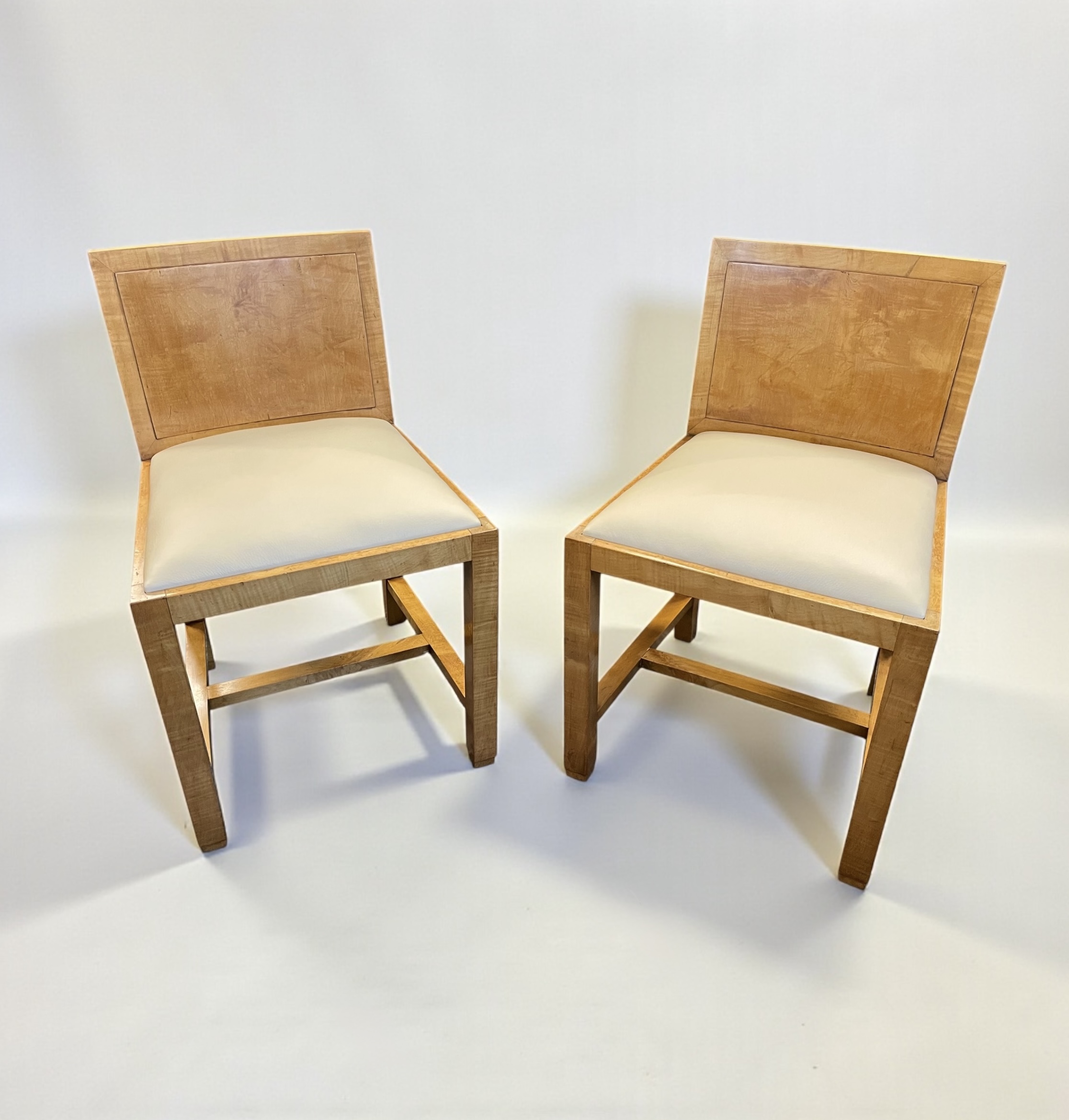 Pair of Art Deco bedroom chairs by Heals. In maple and the seats just reupholstered in soft cream leather. The Heals ivorine circular disc to the underside of each chair and each marked ‘891 (38)’.