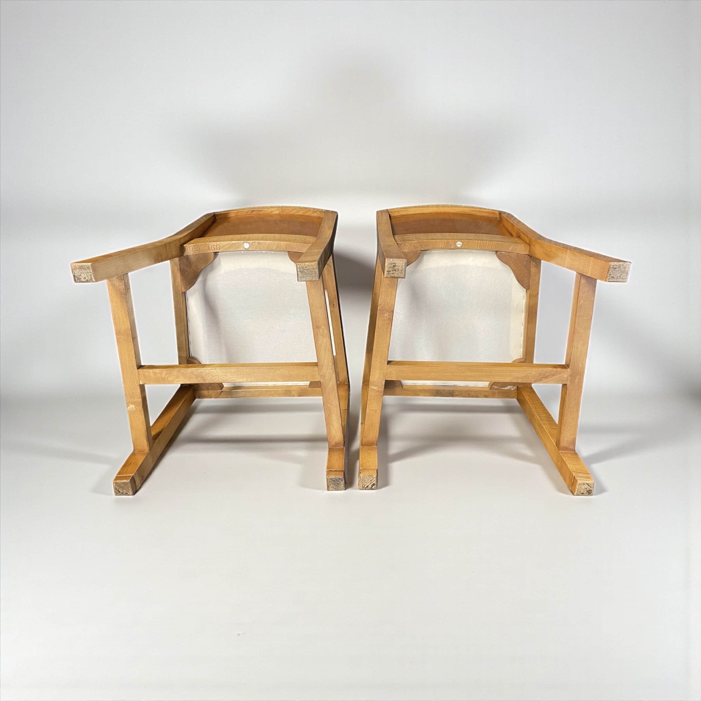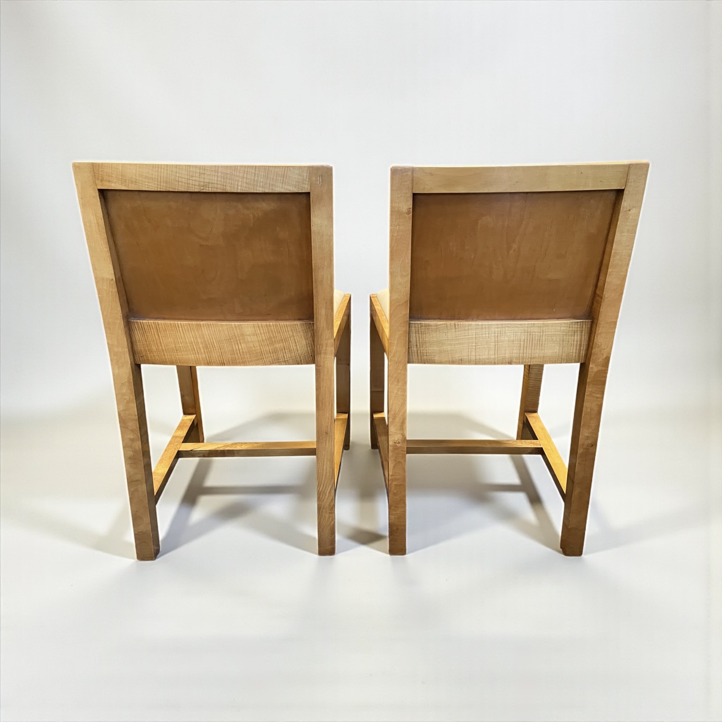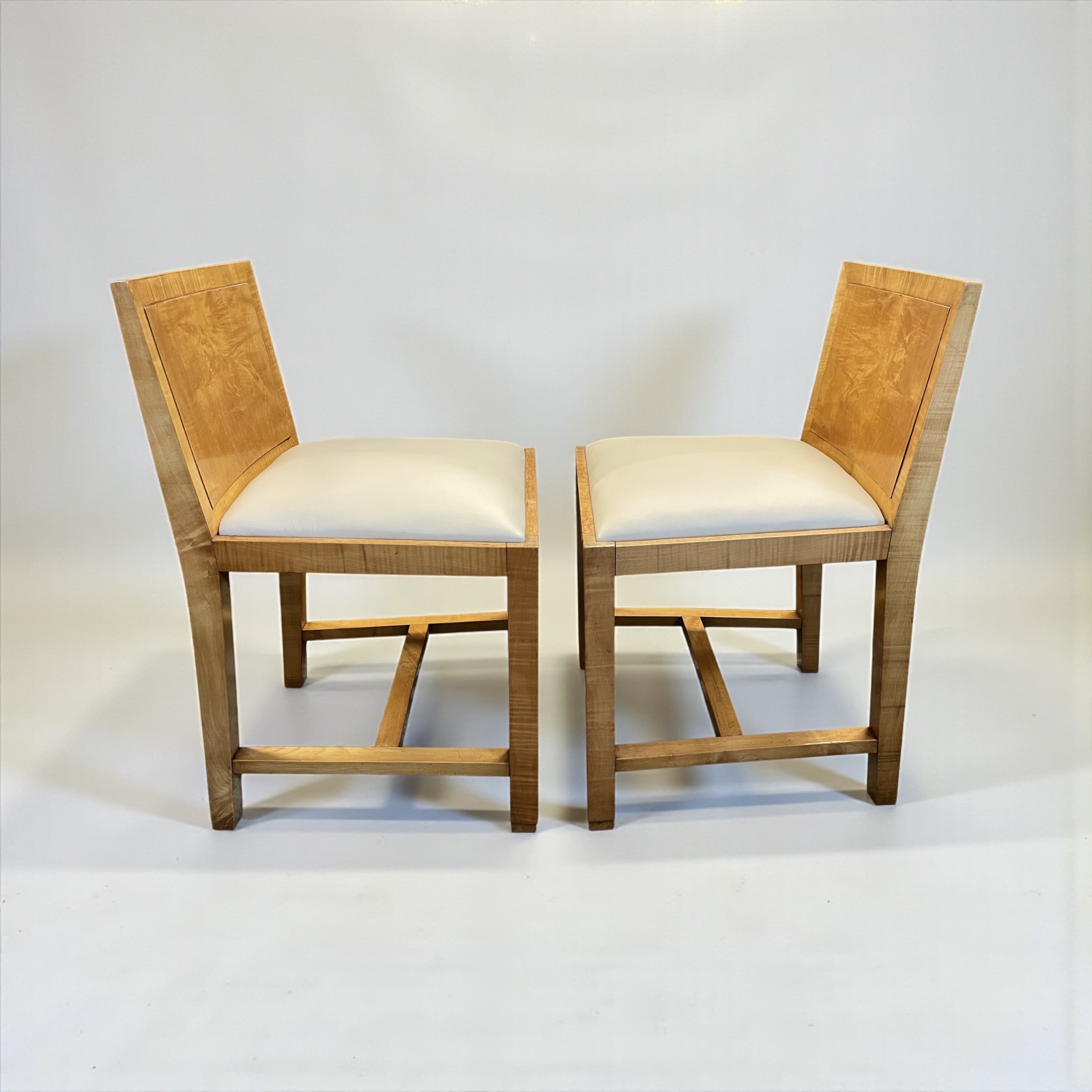 Pair of Art Deco bedroom chairs by Heals. In maple and the seats just reupholstered in soft cream leather. The Heals ivorine circular disc to the underside of each chair and each marked ‘891 (38)’.