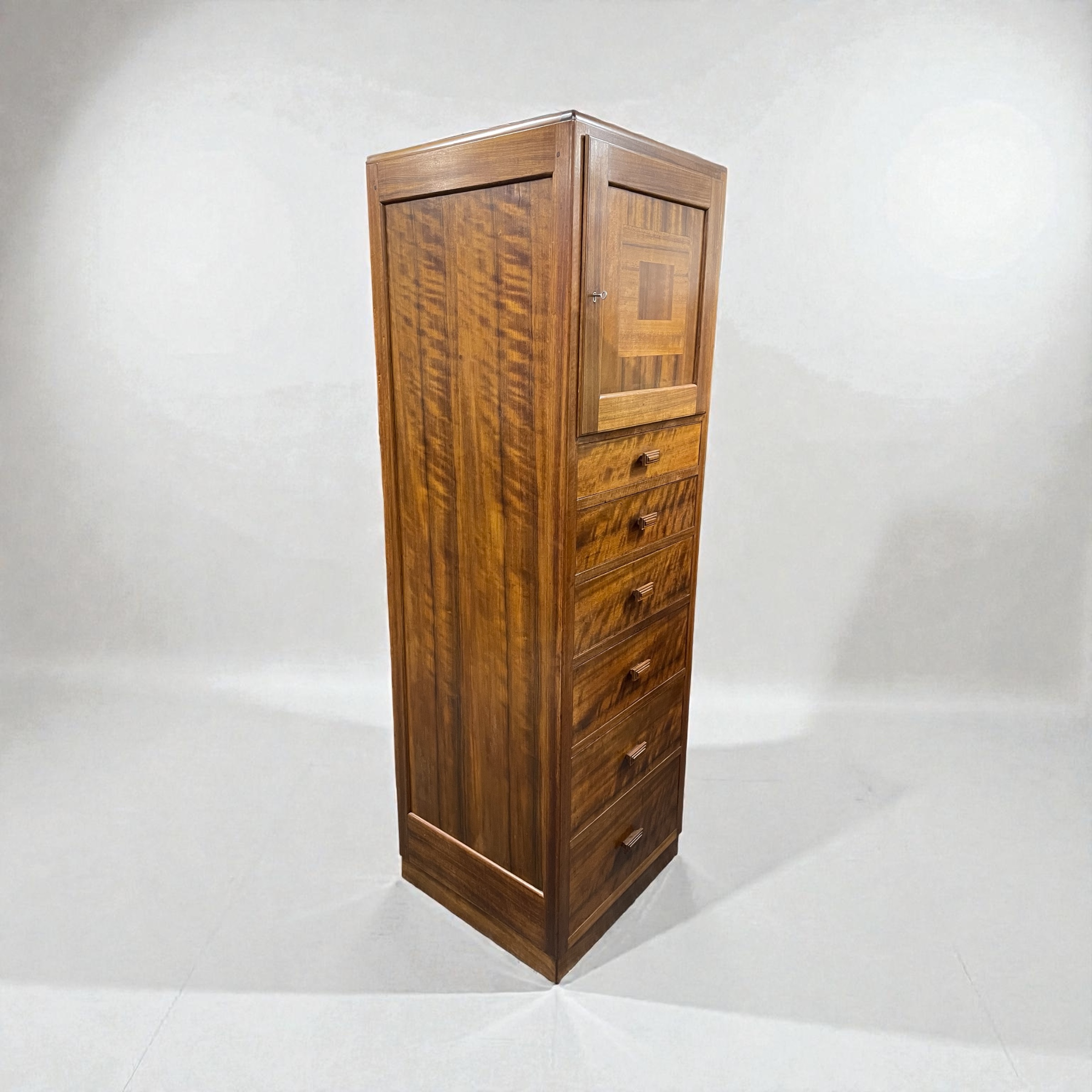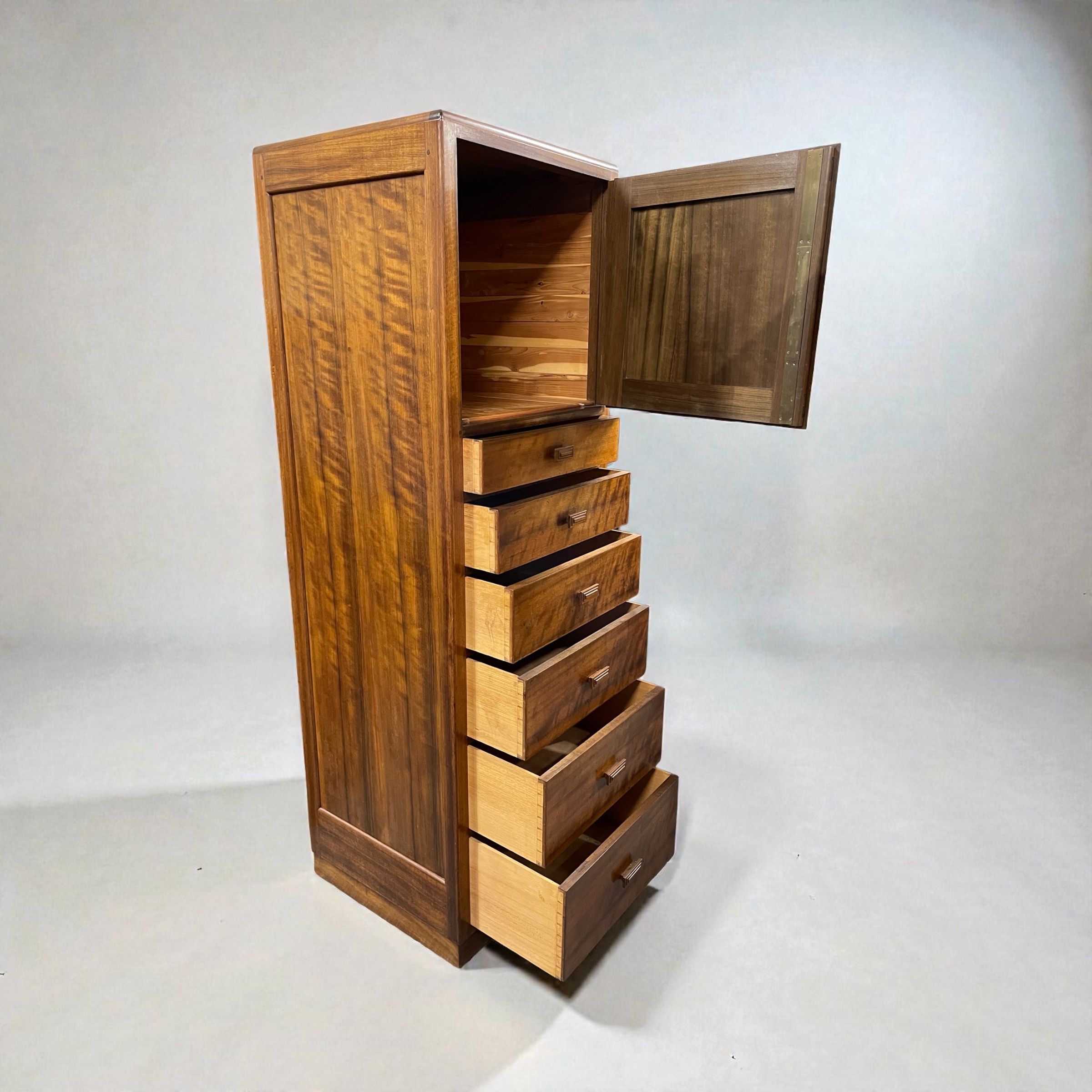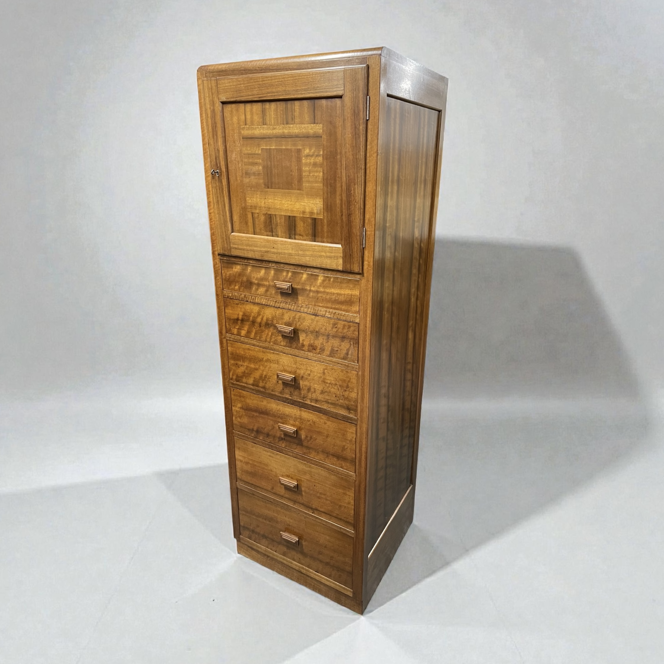 The top cupboard with its original working lock, key and cedar lined. The piece made from Australian walnut, with decorative detailing to the cupboard door and each of the six graduated drawers with ball bearing catches and stepped, rectangular walnut handles.