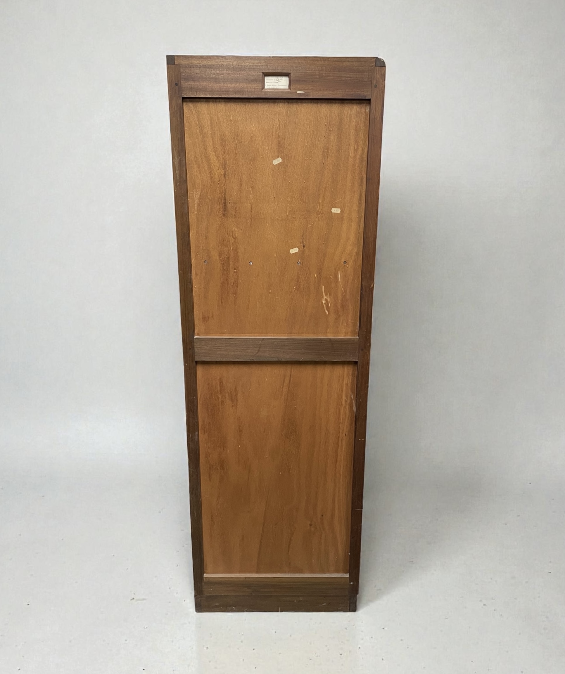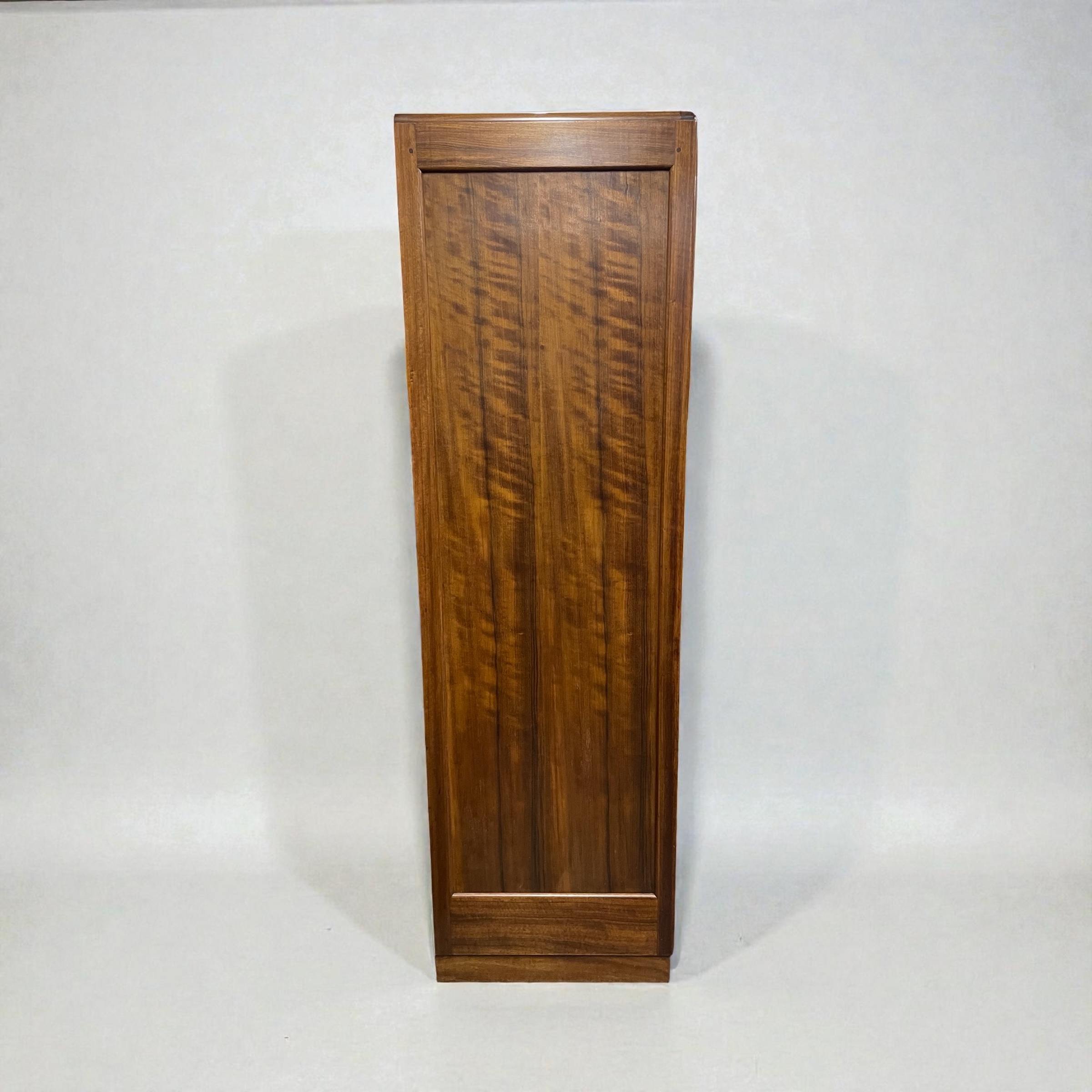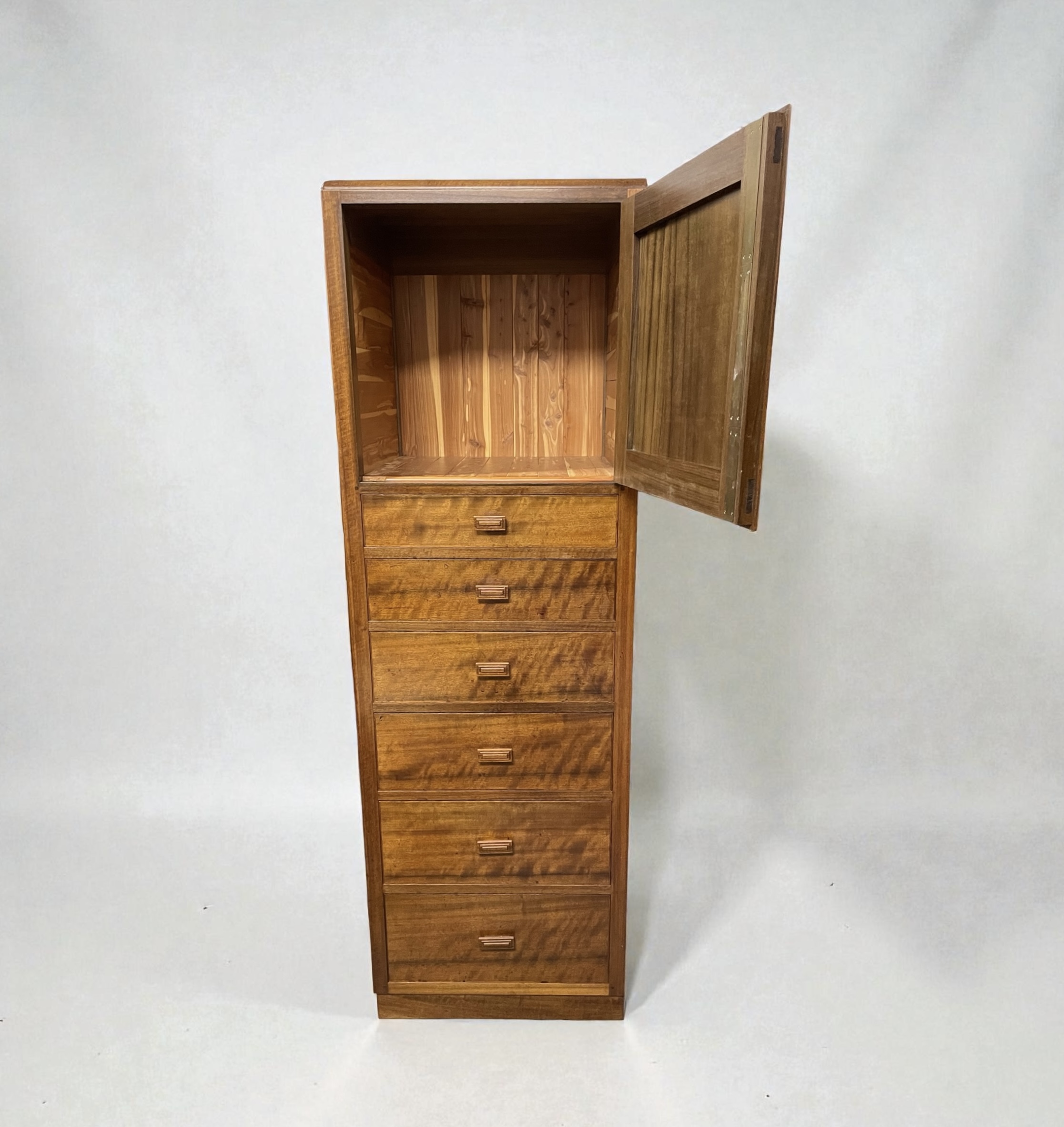 The top cupboard with its original working lock, key and cedar lined. The piece made from Australian walnut, with decorative detailing to the cupboard door and each of the six graduated drawers with ball bearing catches and stepped, rectangular walnut handles.