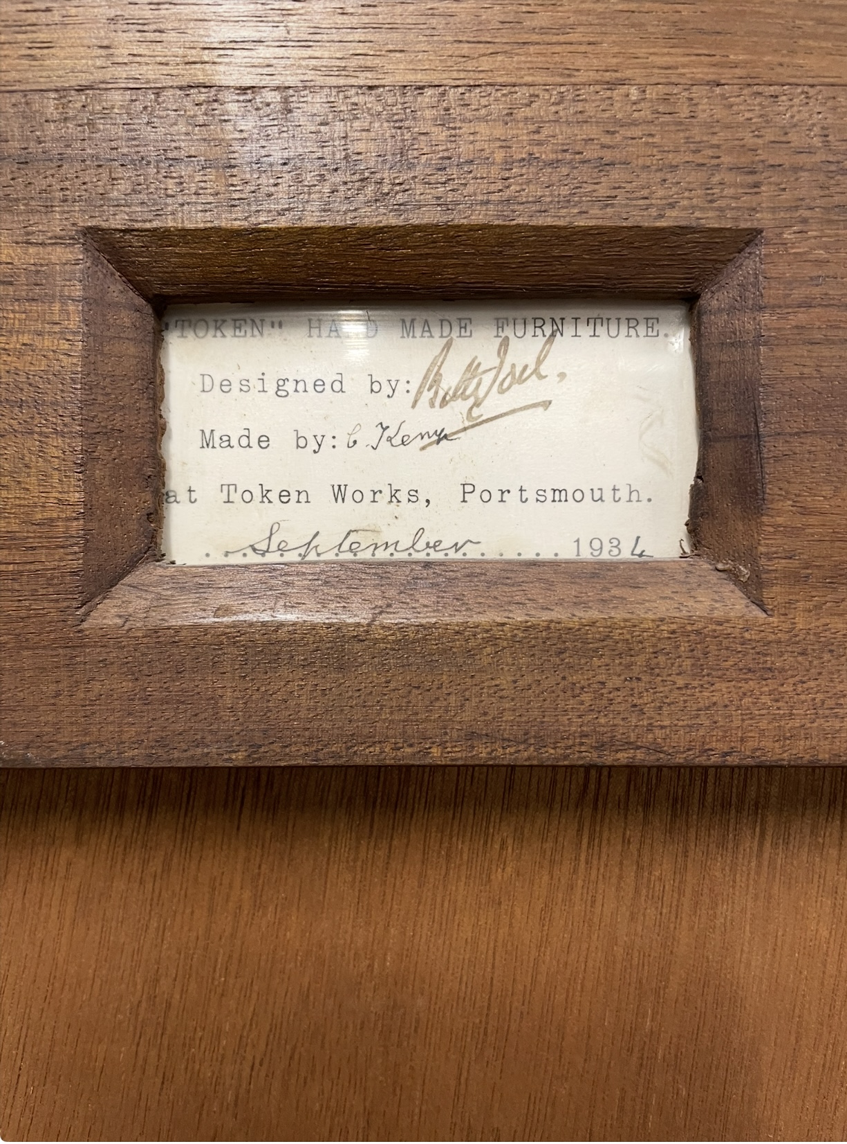 Bearing the makers label and signature to the back, showing it was made at the Token Works factory in Portsmouth, in 1934.