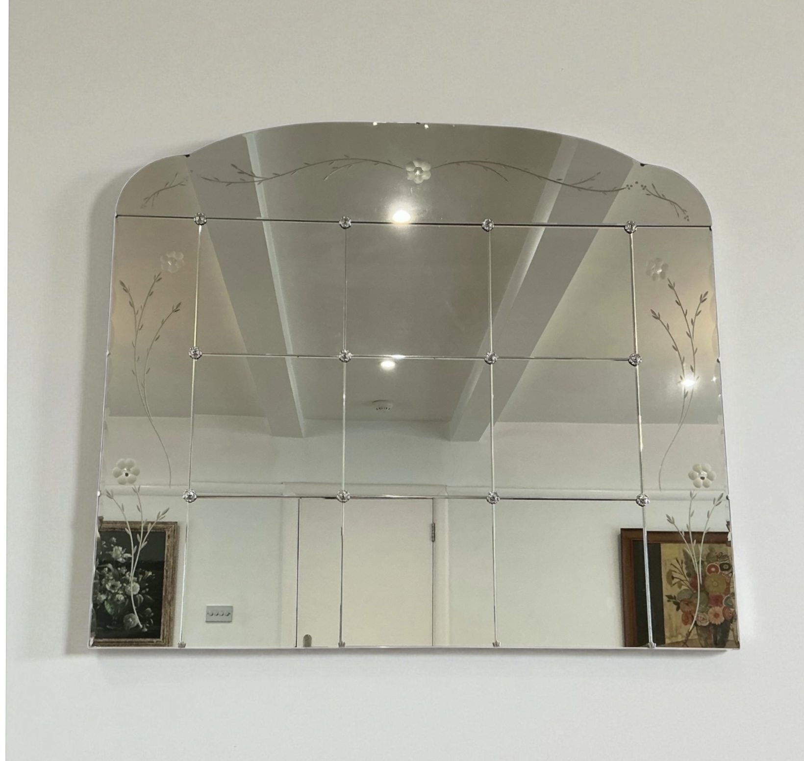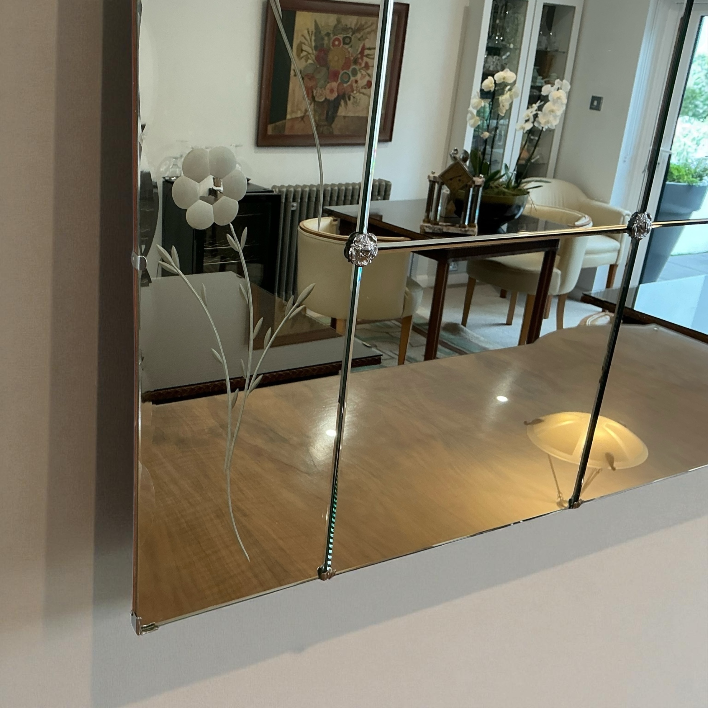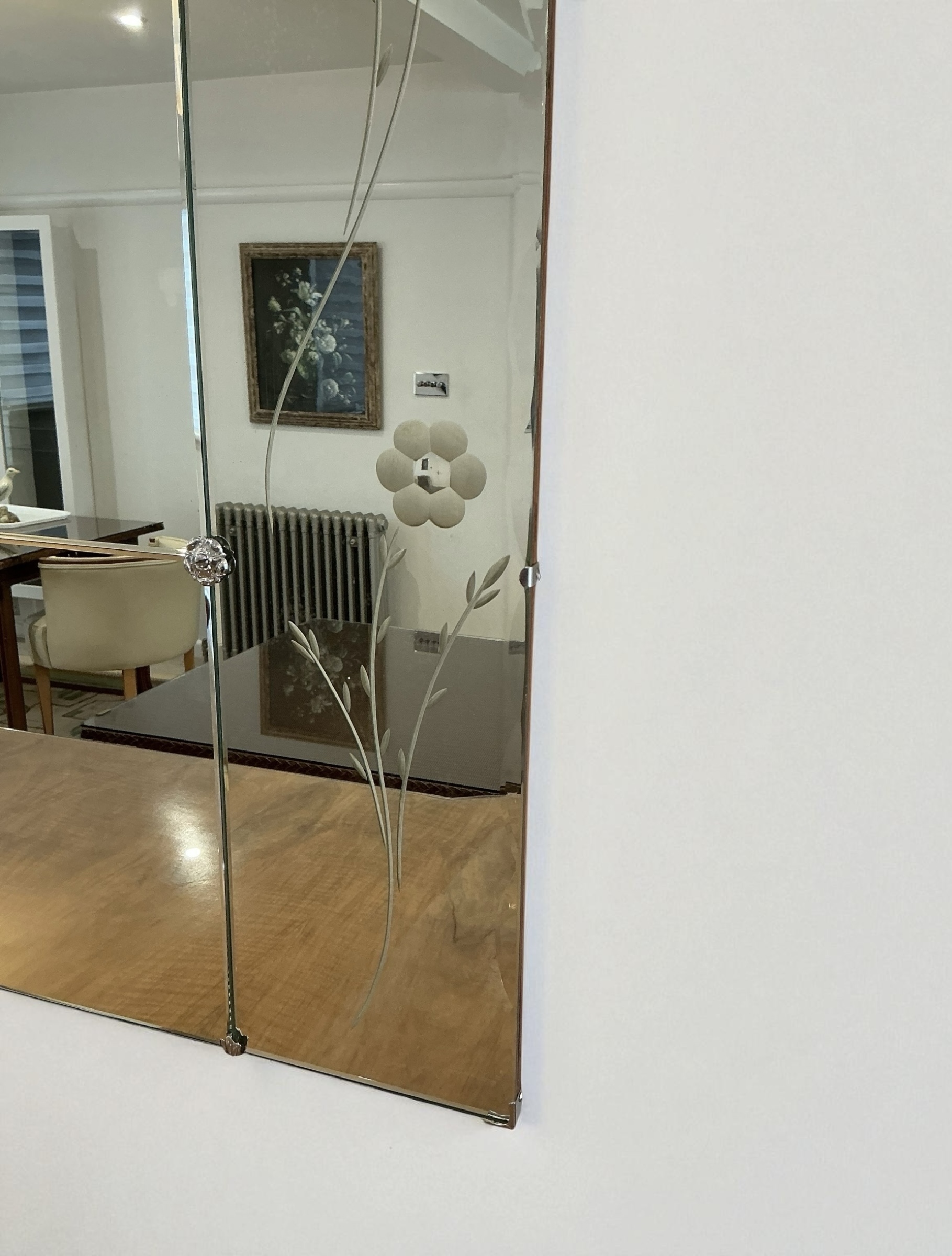 A very large wall mirror with etched floral and foliage decoration to the top and side panels. This mirror is made up of 12 separate mirrors, mounted into its wooden board. Each piece of mirror is held in place by floral shaped mirror fixings.
