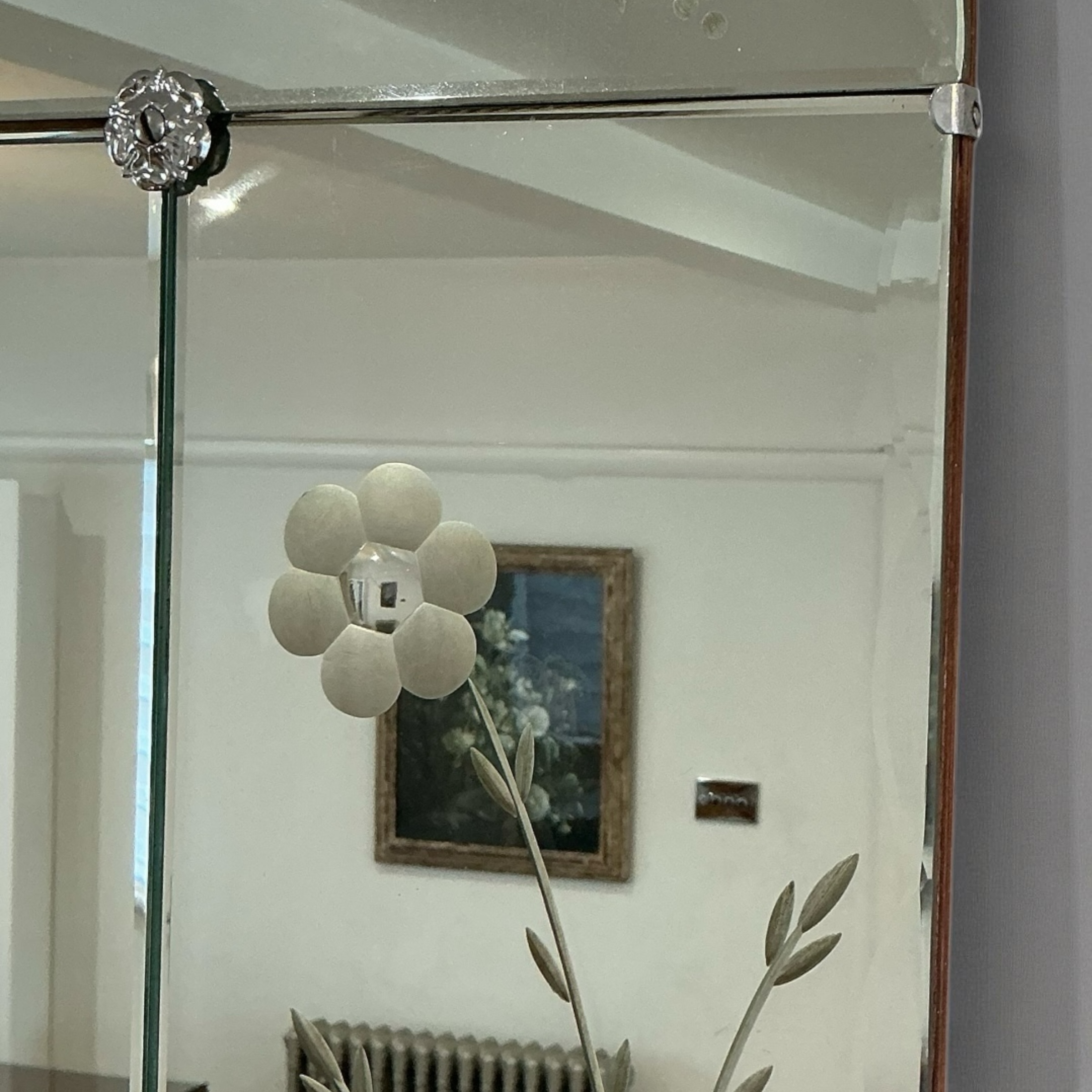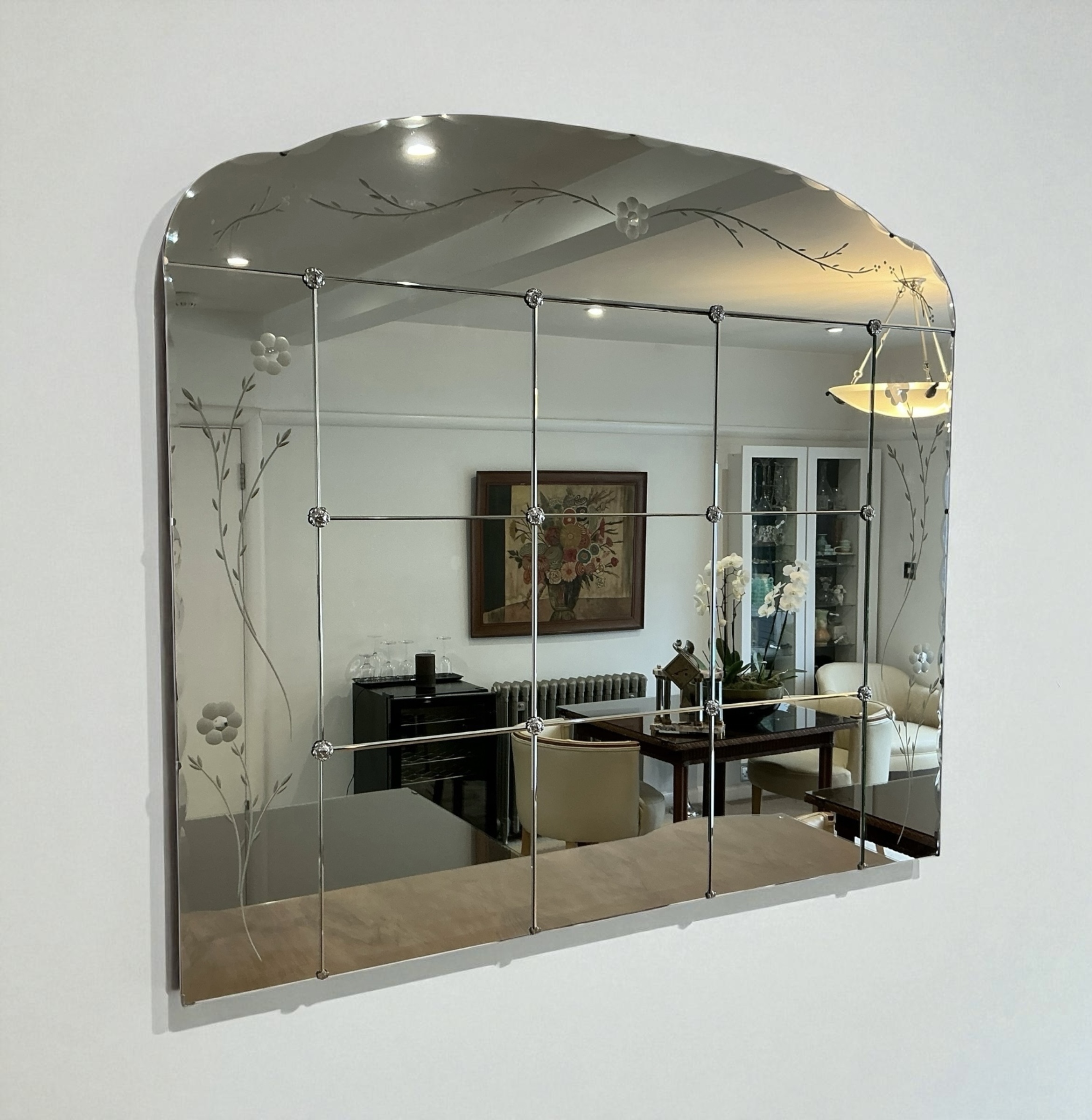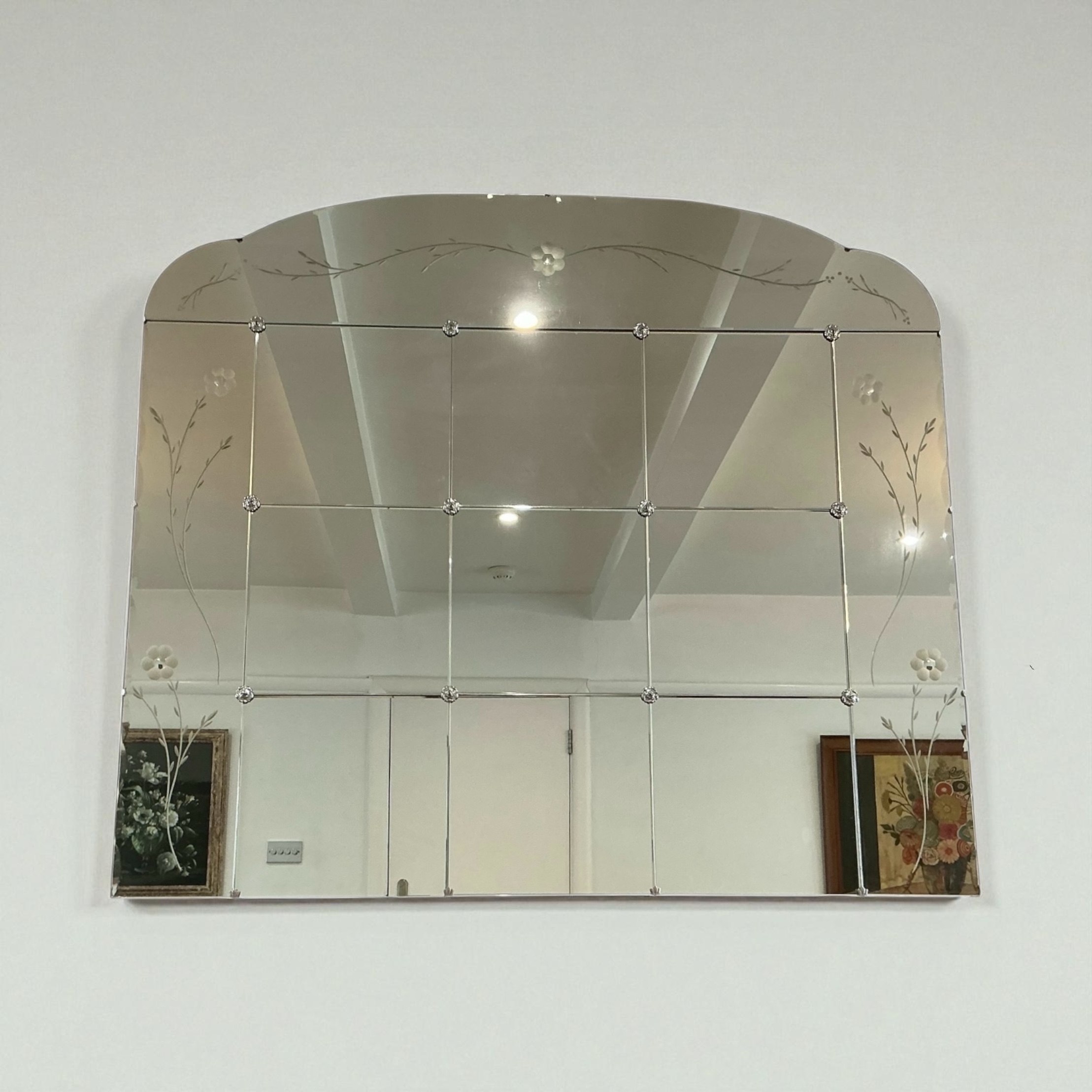 A very large wall mirror with etched floral and foliage decoration to the top and side panels. This mirror is made up of 12 separate mirrors, mounted into its wooden board. Each piece of mirror is held in place by floral shaped mirror fixings.